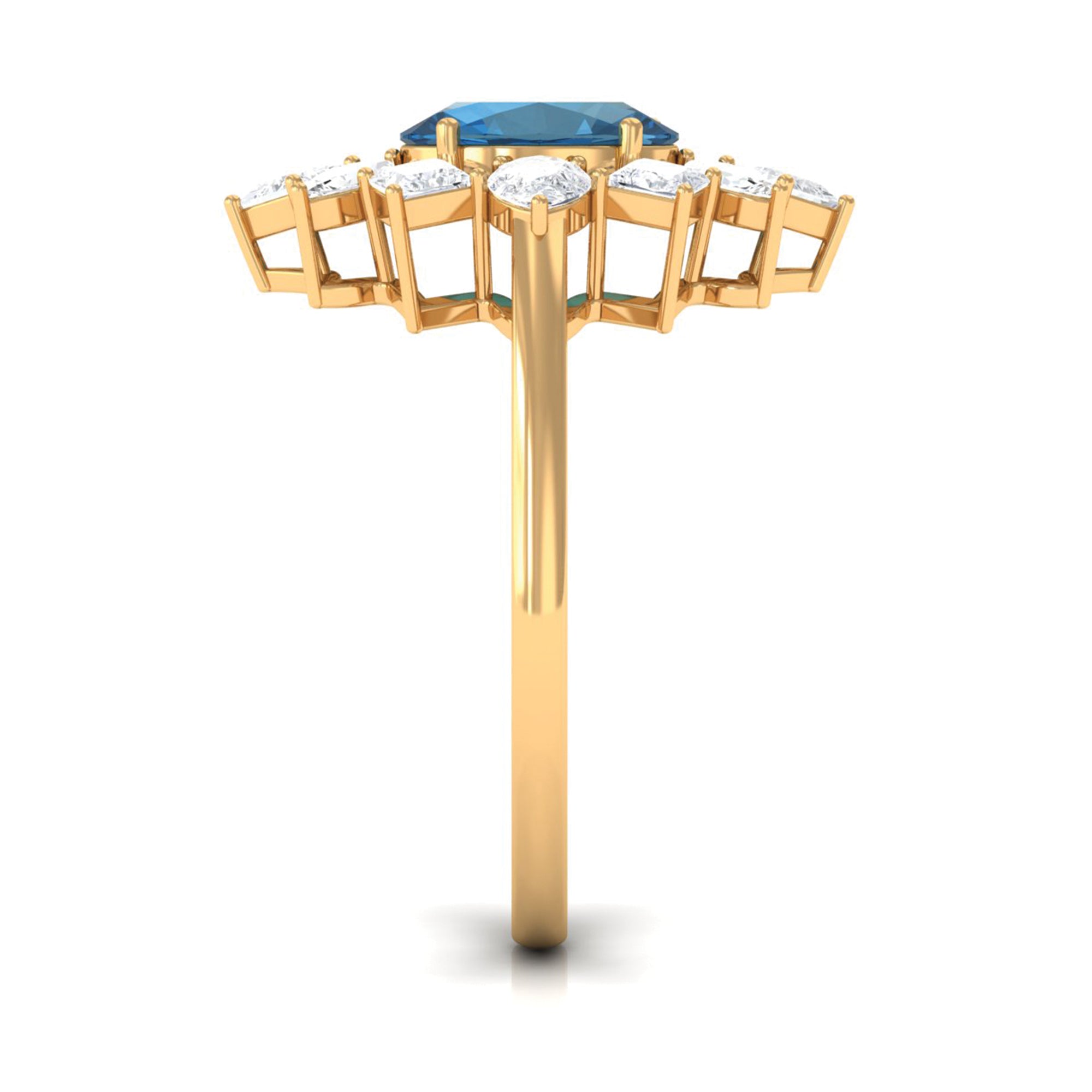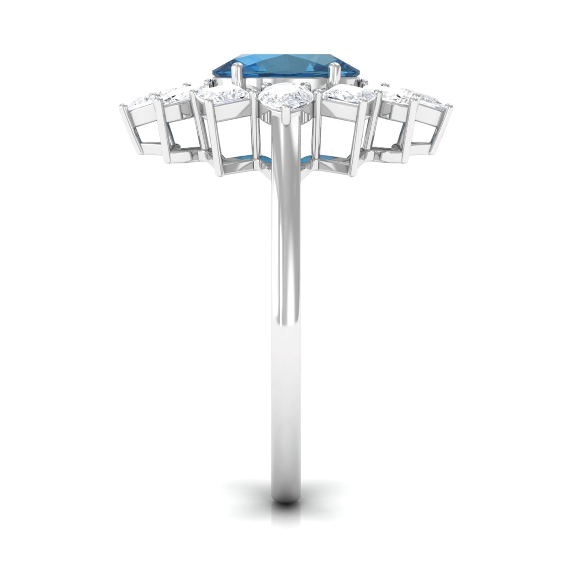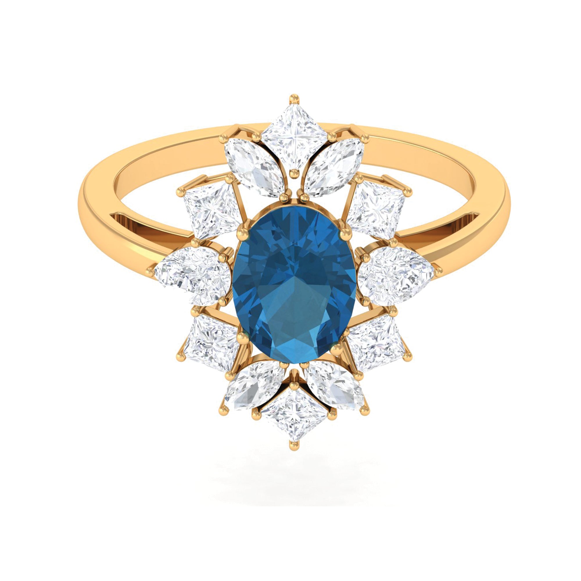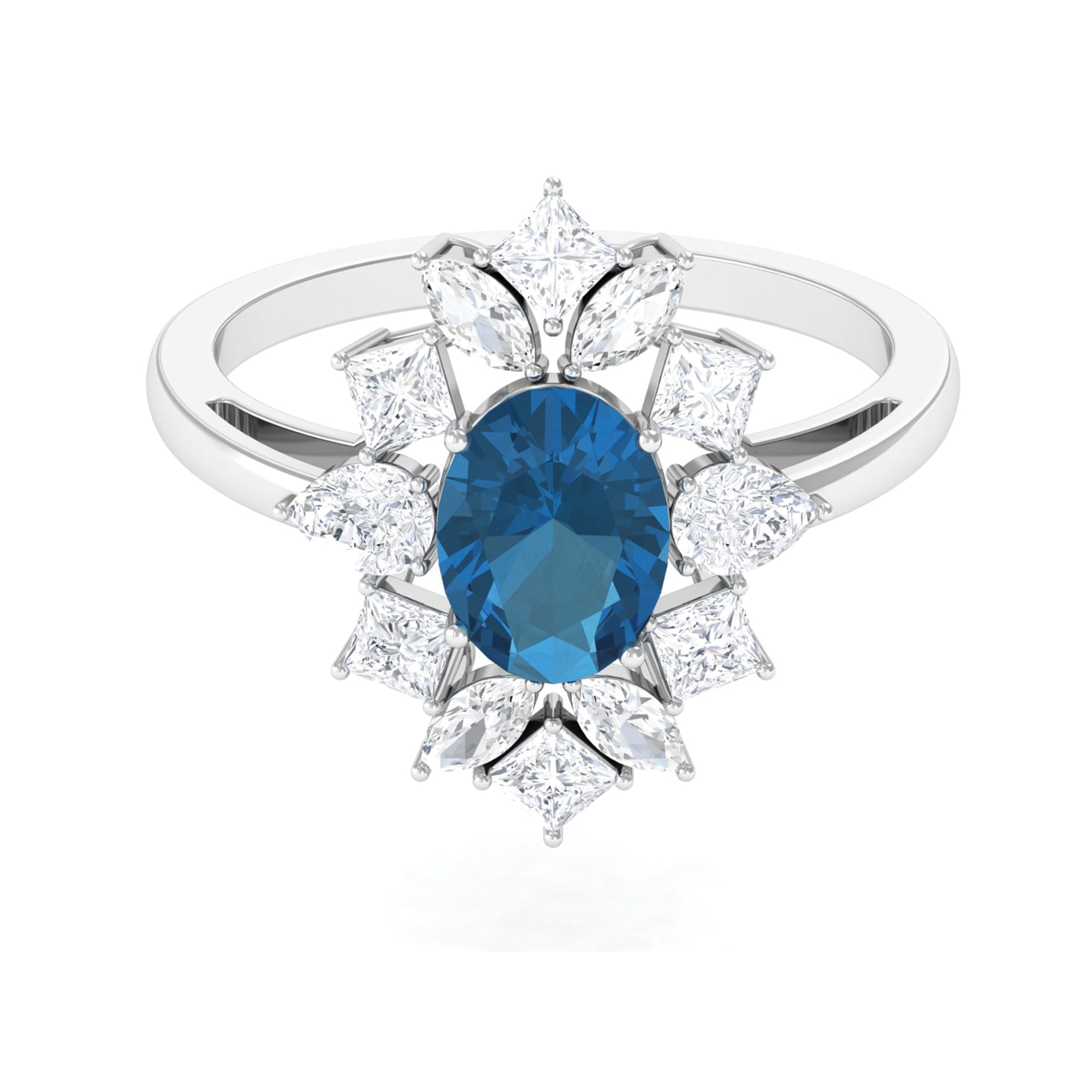Prepare to capture attention with this stunning London Blue Topaz Statement Ring, an ideal accessory for your upcoming special event. At its heart lies a striking 6X8 MM oval cut London Blue Topaz that captivates with its vibrant blue brilliance. This AAA quality topaz boasts exceptional color and clarity, imparting a sense of richness and luxury. The topaz is elegantly encircled with marquise, oval, princess and pear cut moissanite stones, encircling the central stone is a halo style, contributing the perfect touch of sparkle to enhance the overall radiance of the ring. The sleek band maintains an elegant and harmonious appearance, allowing the topaz to take center stage. Whether you are preparing for an evening affair or simply wish to elevate your style, this Oval Engagement Ring is an excellent selection. It is bold, sophisticated, and effortlessly stylish, perfect for women who appreciate jewelry that makes a statement while remaining refined. This Statement Ring is not merely beautiful; it serves as a conversation starter. Crafted for both comfort and elegance, it fits exquisitely and is comfortable to wear throughout the day or night. Ideal as a gift or a personal indulgence, it arrives in a charming box, ready to impress from the moment it is unveiled.