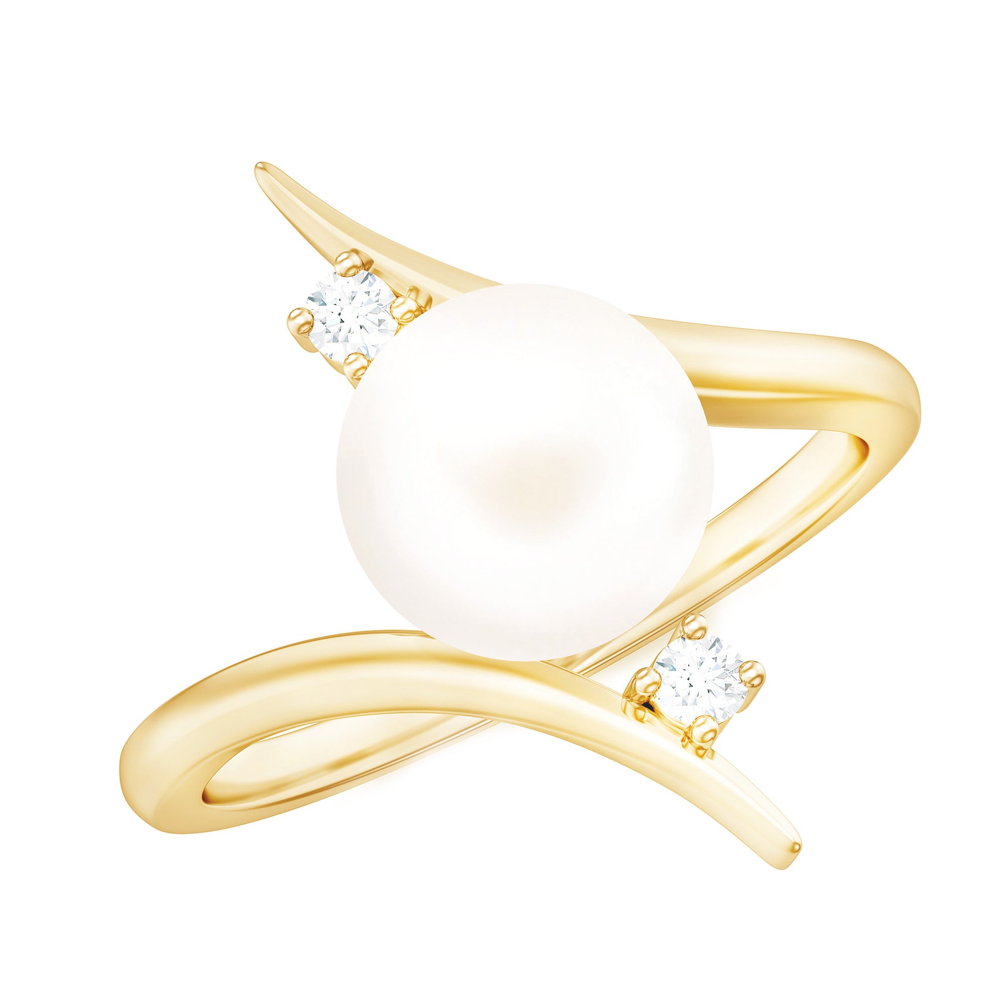 It is a Bypass Ring for Women, adorned in Gold and features a round shape Freshwater Pearl as Solitaire with Round Shape Diamond Stones embellished in Prong Setting over a gold bypass shank.