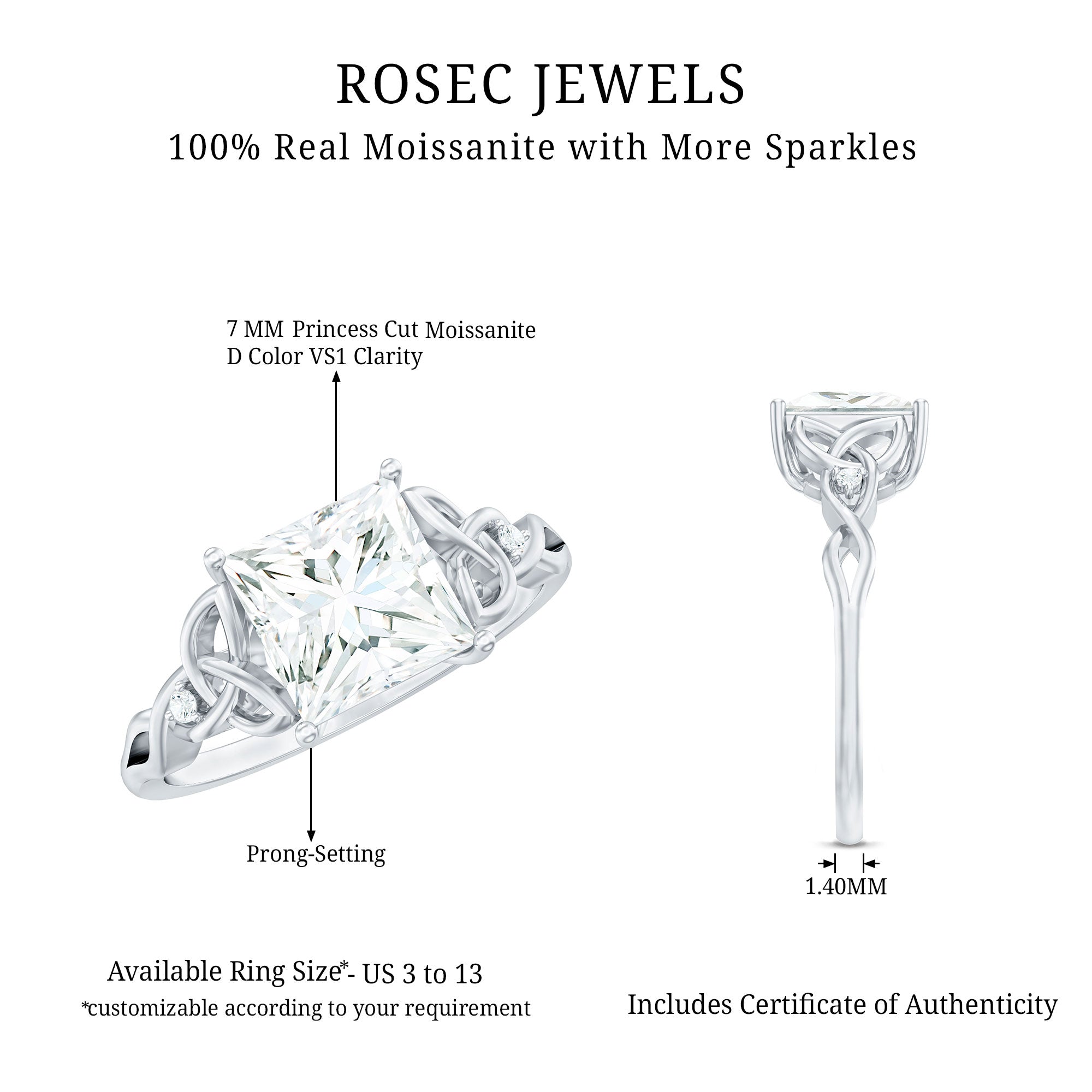 This stunning Moissanite Ring is made even more captivating with the addition of two beautifully designed Celtic knots on either side of the center stone. These knots represent the timeless concepts of unity and eternity, embodying the depth of love and commitment between two people. This Solitaire Ring features 7 MM Princess Cut Moissanite stone in Prong Setting. This Engagement Ring is a perfect choice to reflect her unique style and taste, making it an ideal piece of proposal jewelry.