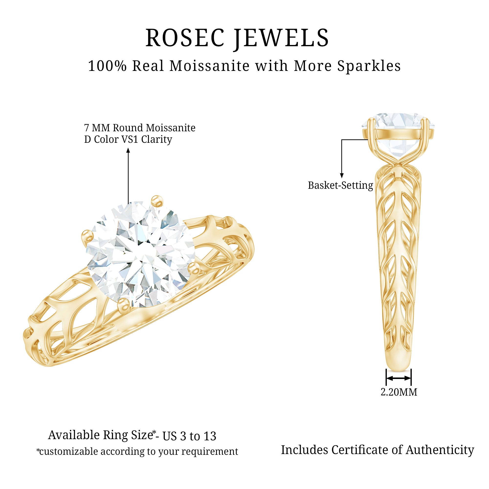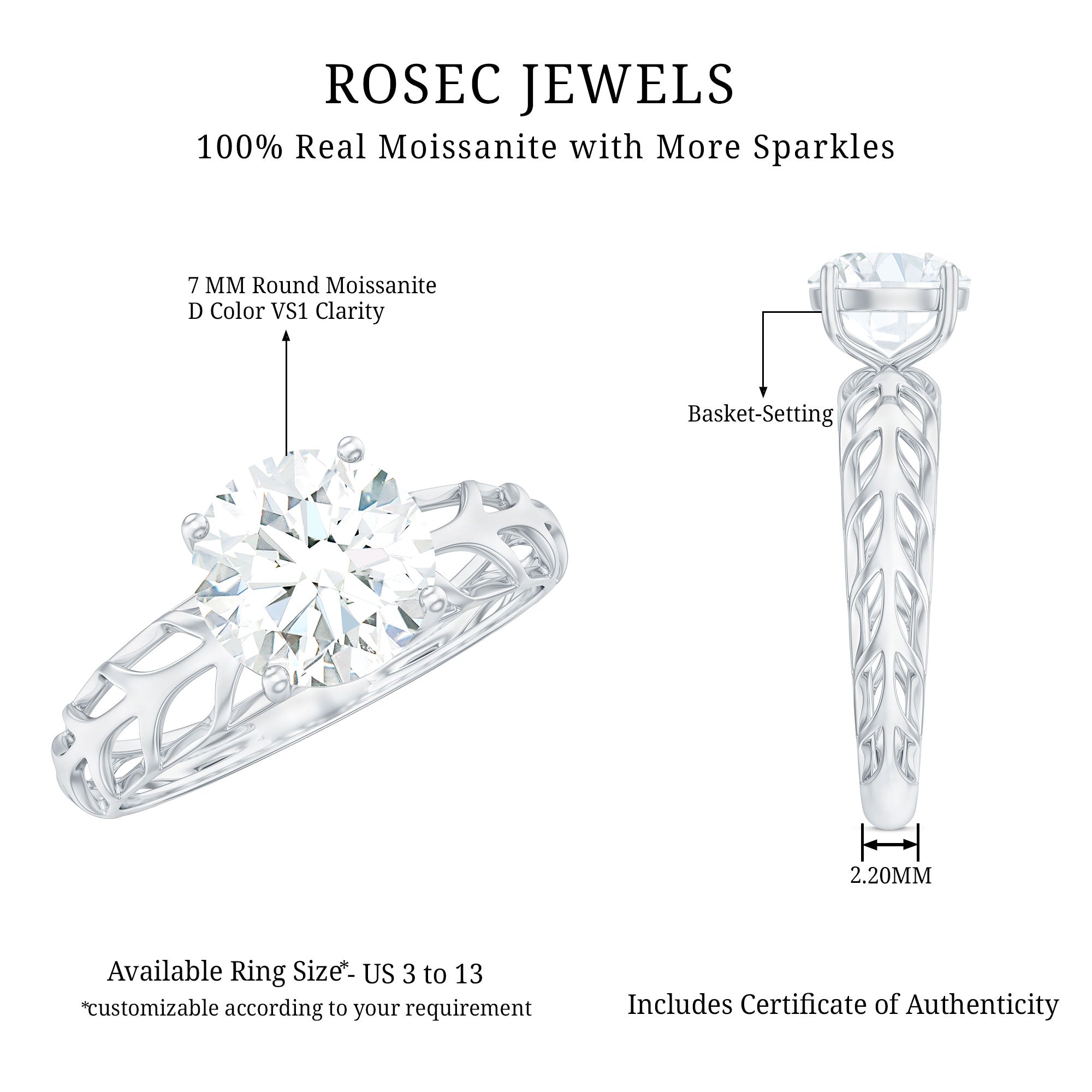 Every love story deserves a symbol as radiant as the moment you say YES. This Round Cut Moissanite Engagement Ring is designed to capture the brilliance of your commitment with elegance, meaning, and timeless beauty. At the heart of the Solitaire Engagement Ring sits a dazzling 7 MM round cut moissanite, graded D color and VS1 clarity, offering exceptional brilliance. The band features a beautifully filigree openwork design, inspired by the natural beauty of leaves that add depth and charm to the Round Engagement Ring without overpowering its simplicity. Carefully crafted to provide both visual intrigue and lasting comfort, the design enhances the center stone while adding a touch of individuality to the overall silhouette. This ring is a perfect choice for the modern bride who values refined detail and understated luxury. Every element - from the open work band to the high-grade moissanite, has been thoughtfully chosen to create a piece that is both sophisticated and meaningful. Ideal for marking life’s most unforgettable moments, this 1 Carat Moissanite Ring offers a unique blend of brilliance, craftsmanship, and timeless charm.