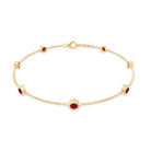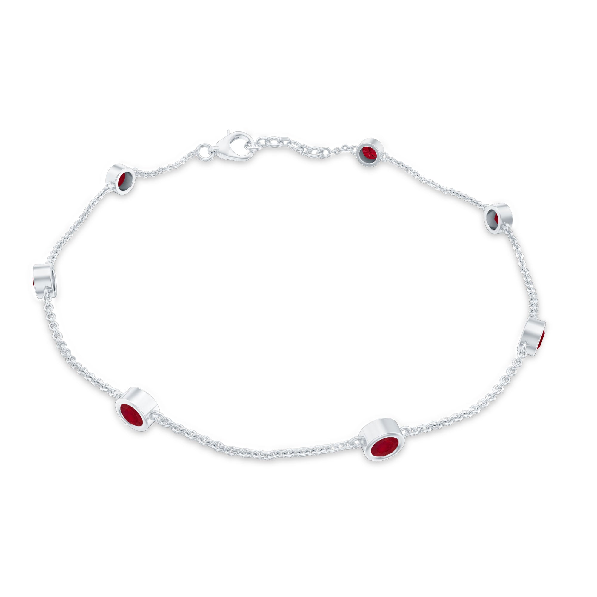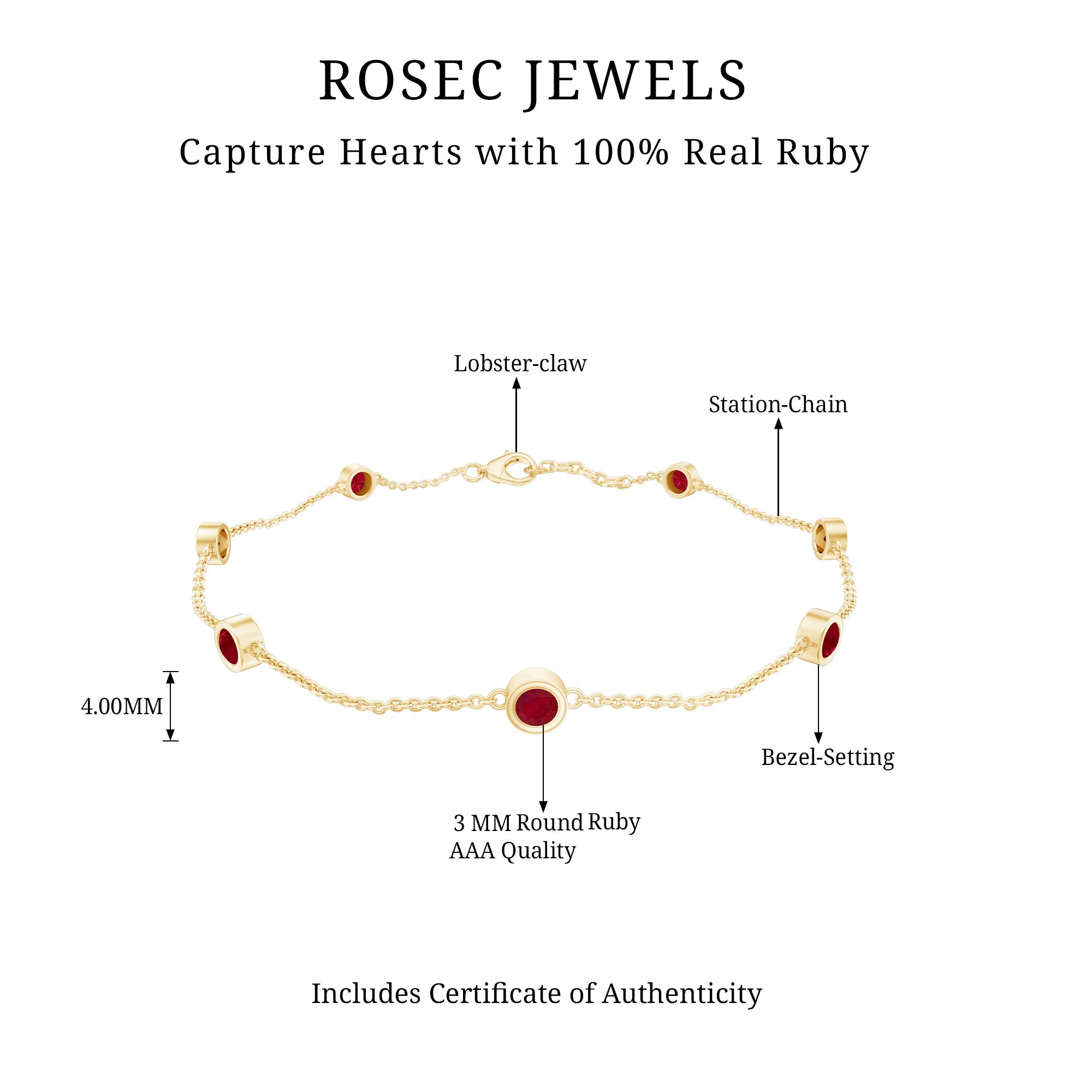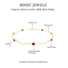 This Rosec Jewels Ruby Bracelet serves as an ideal accessory to ensure you shine like a star at any evening event. This exquisite piece showcases delicate round cut Ruby gemstones that are evenly distributed along the chain. The bezel setting secures the stones, enabling them to capture maximum light, which enhances their sparkle beautifully and adds a modern touch. This Station Chain Bracelet features a secure lobster clasp, guaranteeing a safe and comfortable fit for all-day wear. It represents love, strength, and inner brilliance, making it a considerate gift for yourself or a loved one. It is lightweight and versatile, offering just the right amount of sparkle without being overpowering. You can wear this Layering Bracelet alone for a minimalist appearance or stack it with another bracelet for a striking statement; in either case, it will provide you with the perfect style to shine in any occasion.