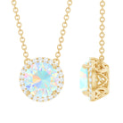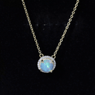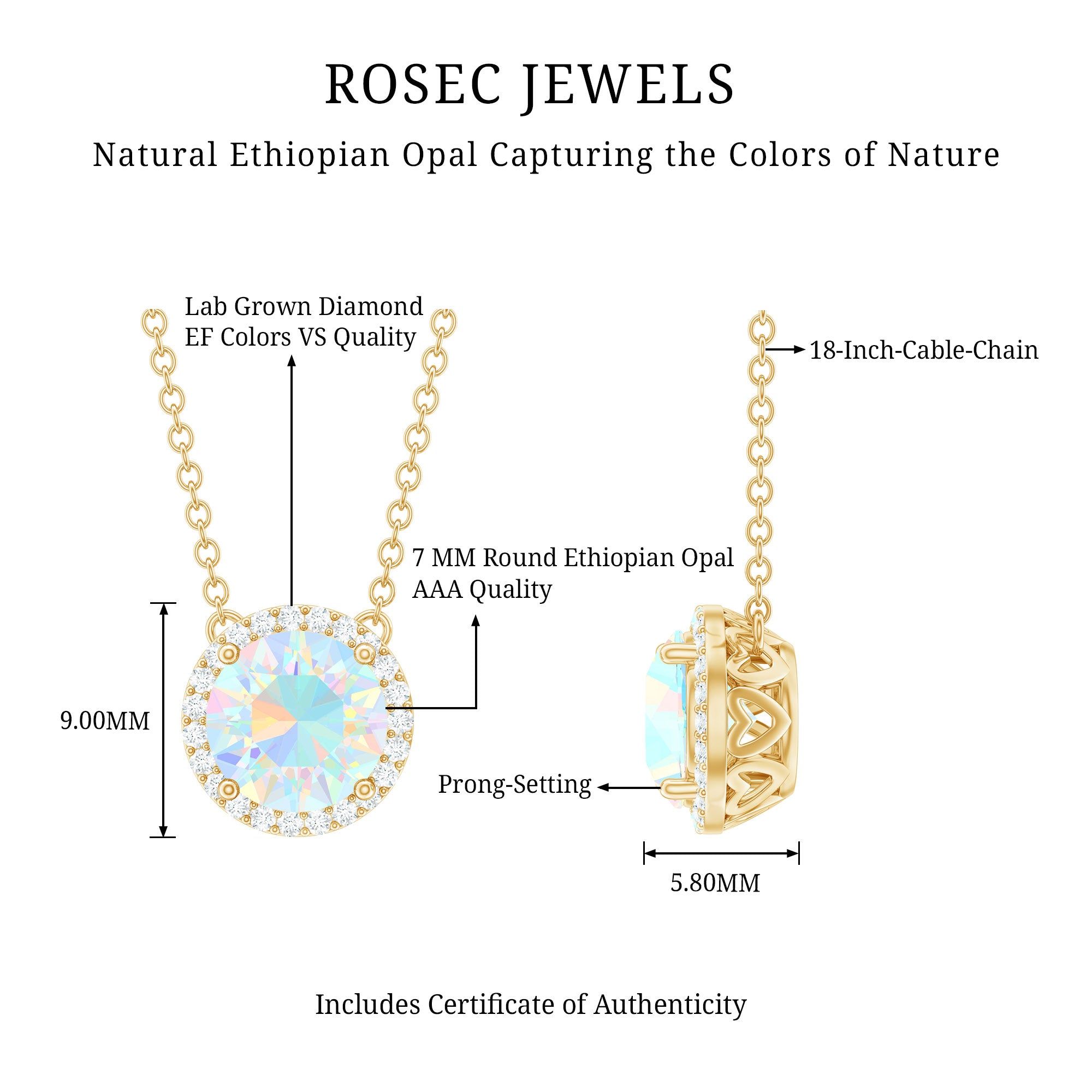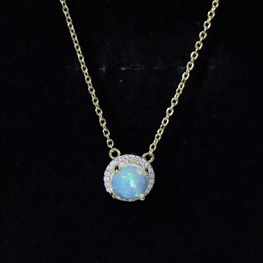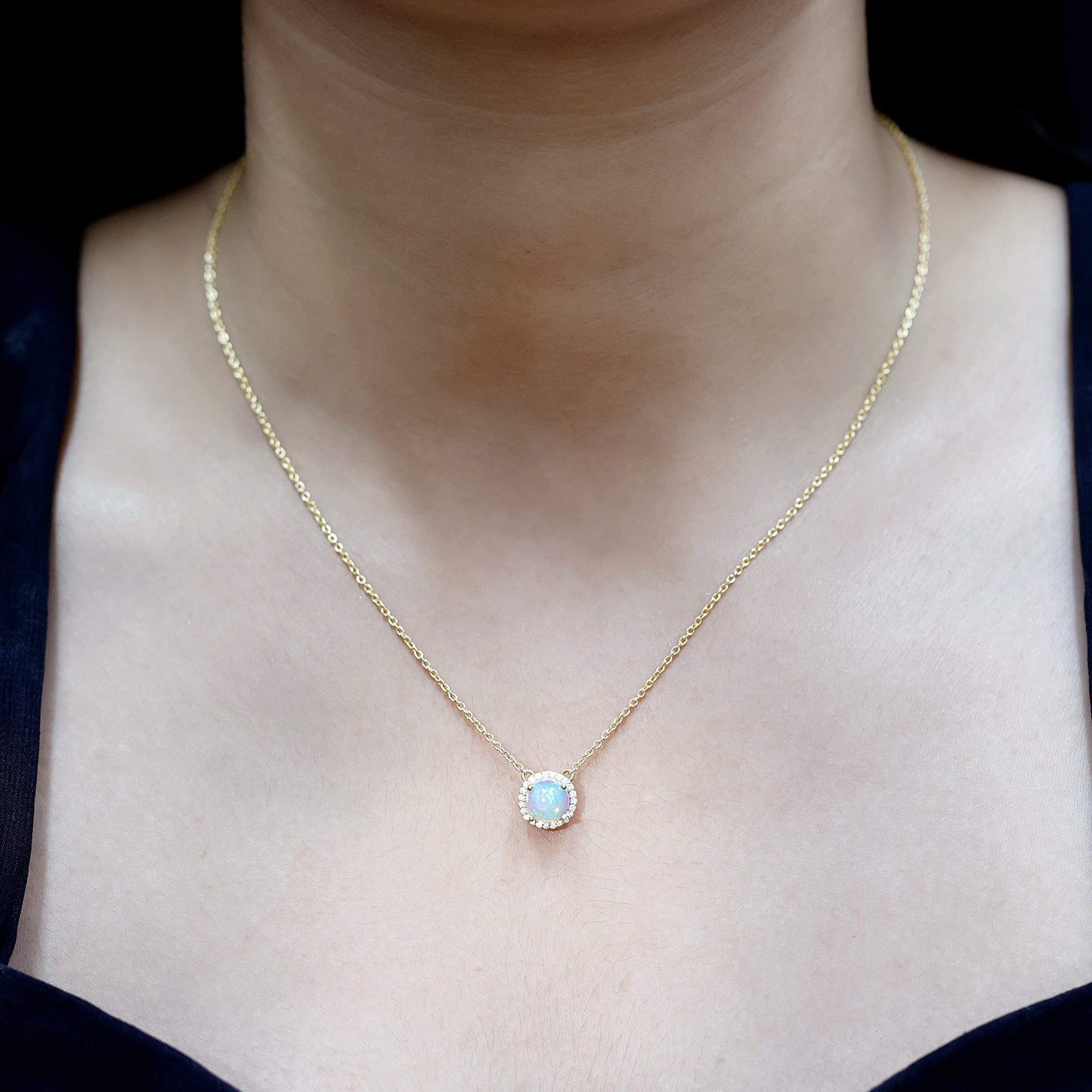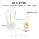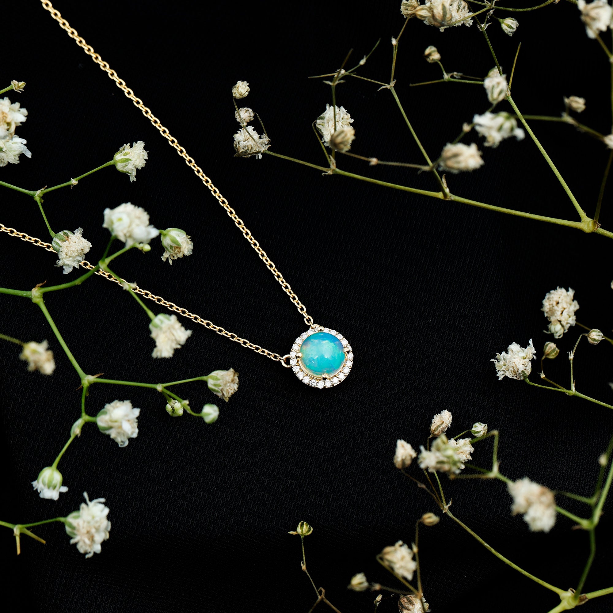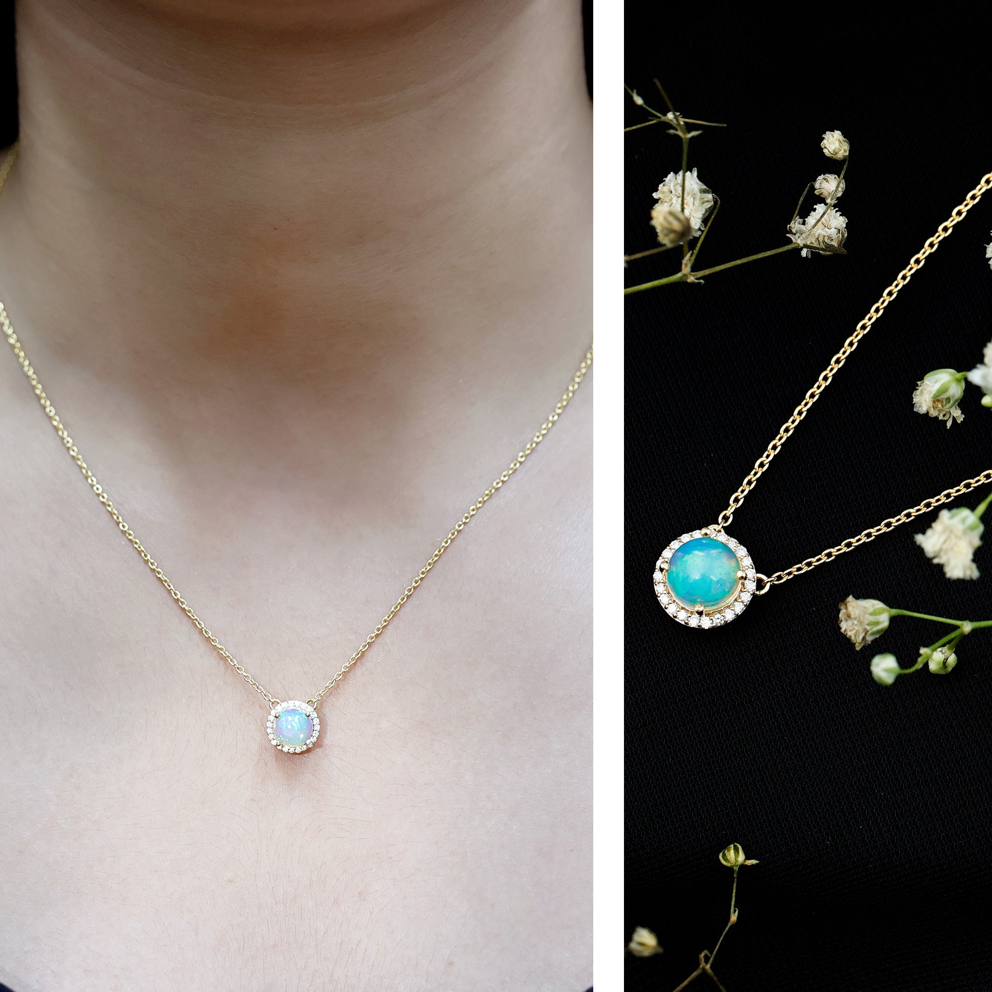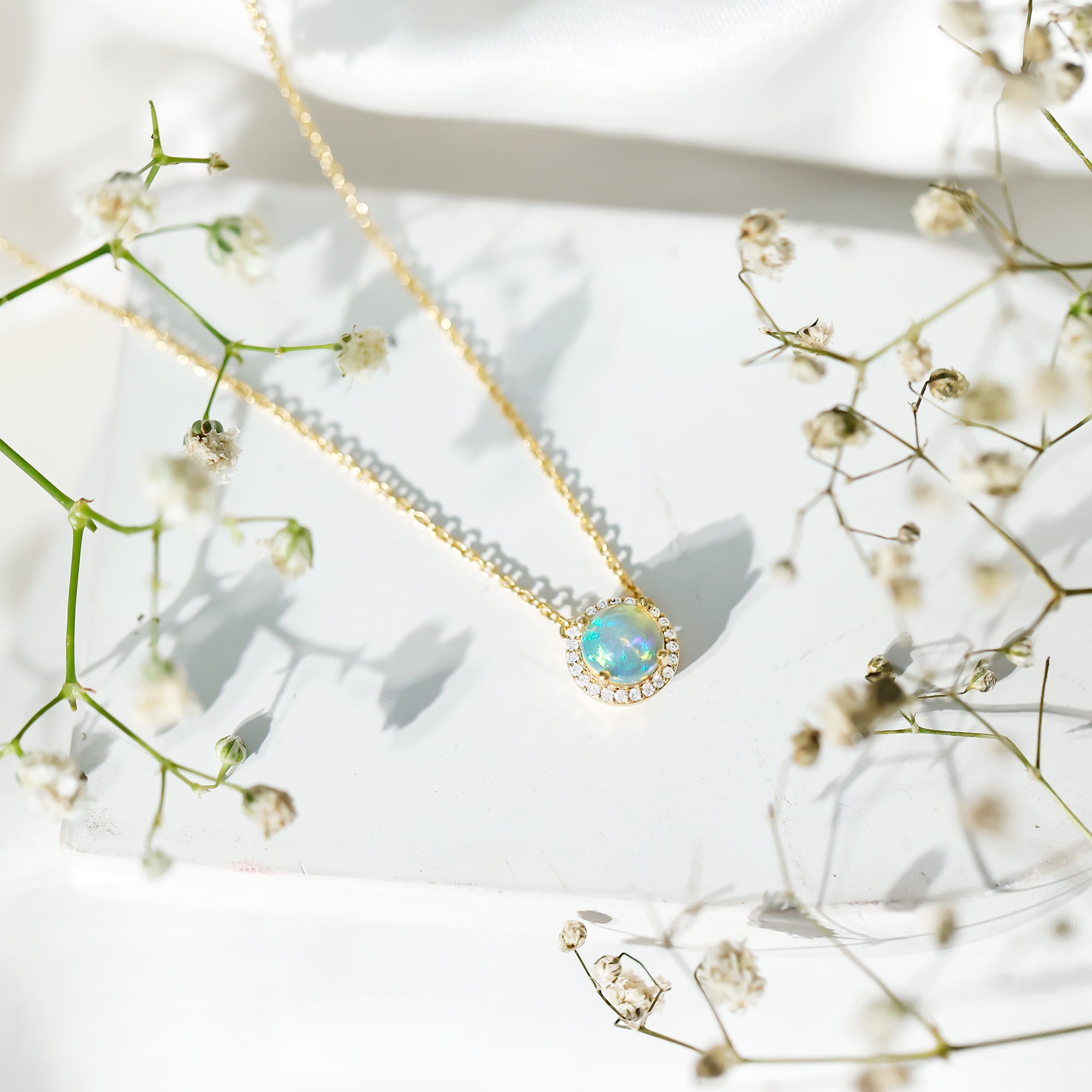 Thoughtfully crafted in 14k yellow gold plated silver, this opal and diamond necklace showcases a stunning 7 MM round cut Ethiopian Opal, set in a secure prong setting. Surrounding the opal is a delicate halo of lab grown diamonds, adding a sparkling contrast. Suspended from a durable chain, the real opal necklace hangs effortlessly, offering a lightweight and comfortable feel for all-day wear. The combination of vibrant opal and radiant diamonds makes this october birthstone necklace perfect for both special occasions and everyday elegance. Whether you are celebrating an October birthday, marking a personal milestone, or simply gifting someone special, this ethiopian opal pendant speaks volumes with its subtle charm and timeless design. Beautifully packaged in a premium jewelry box and accompanied by a Certificate of Authenticity, this halo pendant is ready to be cherished, today, tomorrow, and forever. Let this piece become a sparkling reminder of meaningful moments and beautiful connections.