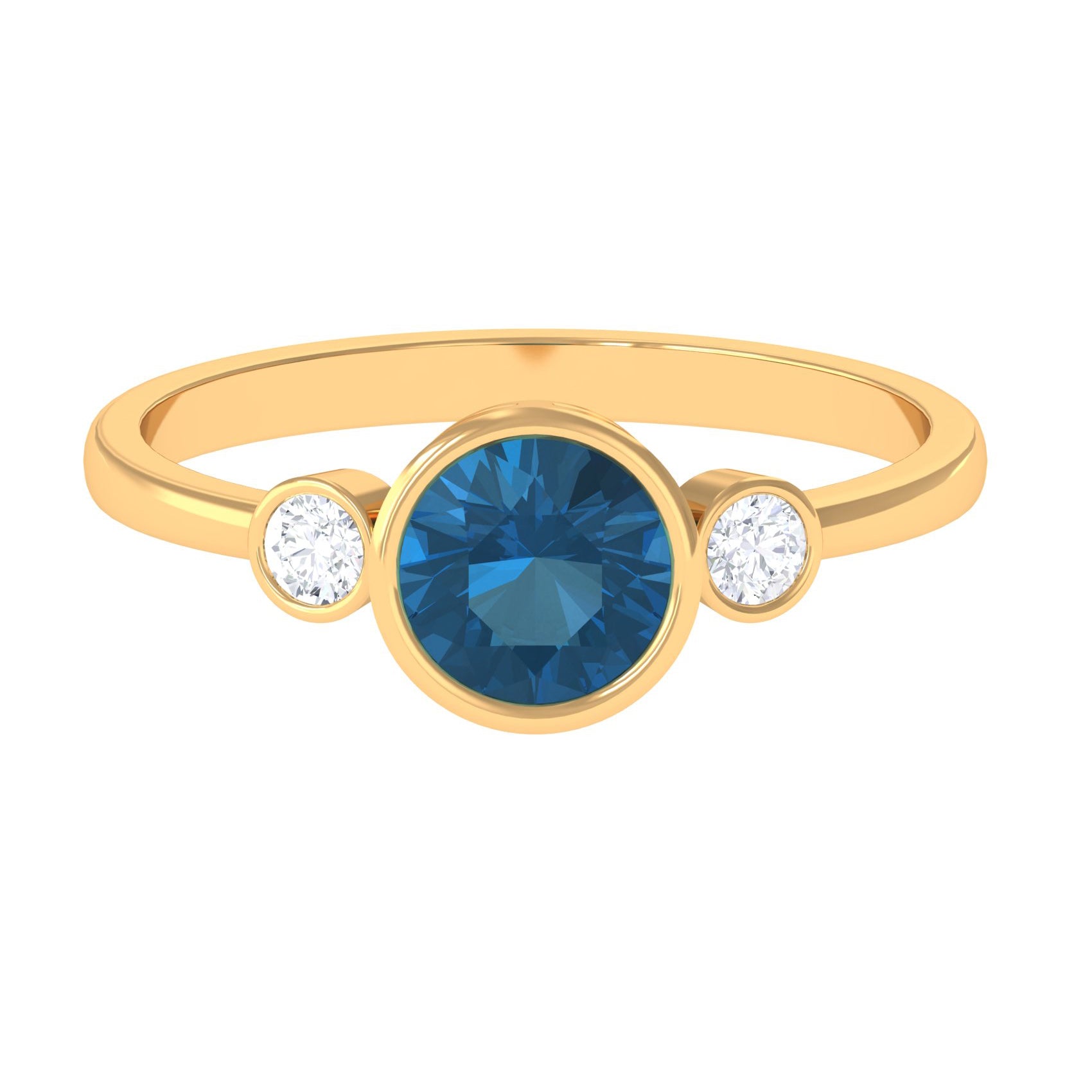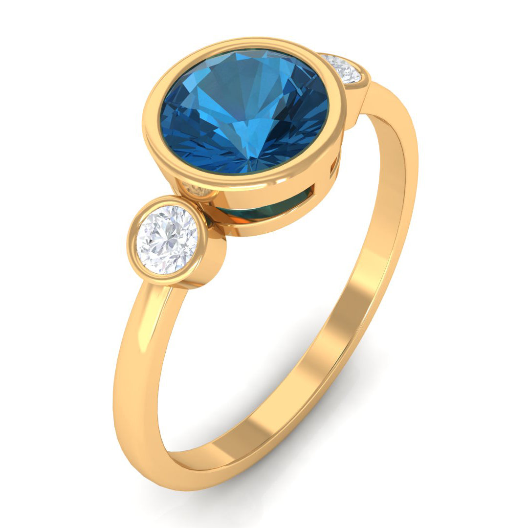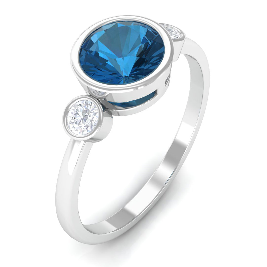 Celebrate love with enduring elegance through this exquisite Solitaire Engagement Ring. Showcasing a brilliant 7 MM round shape London Blue Topaz securely set in a sleek bezel setting with two round shape diamond accents set on both sides in a bezel setting, this Blue Topaz Solitaire Ring harmonizes simplicity and sophistication in a truly graceful manner. The beautiful design allows the center stone to radiate brilliantly, making it an ideal selection for those who value classic aesthetics with a contemporary flair. Designed for significant occasions, this London Blue Topaz Ring serves as a heartfelt emblem of love, whether you are preparing for a proposal or commemorating a significant event. The bezel setting not only enhances its stylish appeal but also ensures the stone remains safe and secure, making it suitable for daily wear. Presented in an elegant jewelry box, this Bezel Solitaire Ring is perfect for gifting or as a cherished personal keepsake. Whether for an engagement, anniversary, or a sincere surprise, this Round Solitaire Ring is crafted to create unforgettable moments. Simple, sophisticated, and brimming with charm, this Bezel Engagement Ring embodies the love and memories you will treasure for a lifetime.