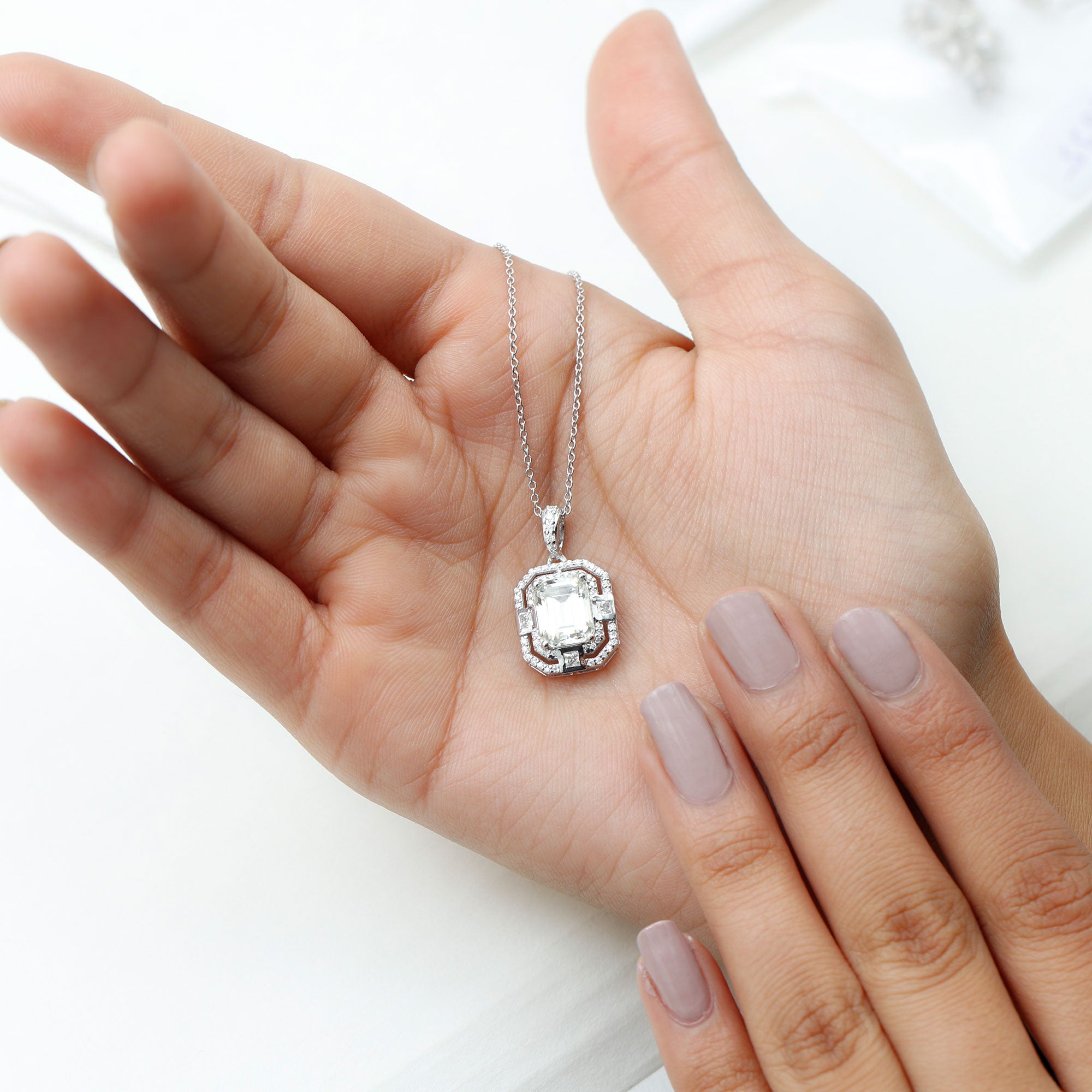 With the inspiration of vintage art, this Moissanite Pendant is handcrafted to adorn your neckline. This Art Deco Pendant is crafted with a 7X9 MM Emerald Cut Moissanite of D-VS1 Quality securely placed in Prong Setting that reflects a subtle shimmer. The center stone is surrounded by a double halo of smaller Moissanite, which enhances the appearance of the pendant as the petite stones catch the light in flashes and shine adorably. This Halo Necklace is accentuated with a petite round diamond Halo and studded bail, the pendant dangles with a sturdy cable chain that makes it beautifully sit on the neckline. This Emerald Cut Necklace will be shipped to you in premium packaging with a certificate of authenticity.