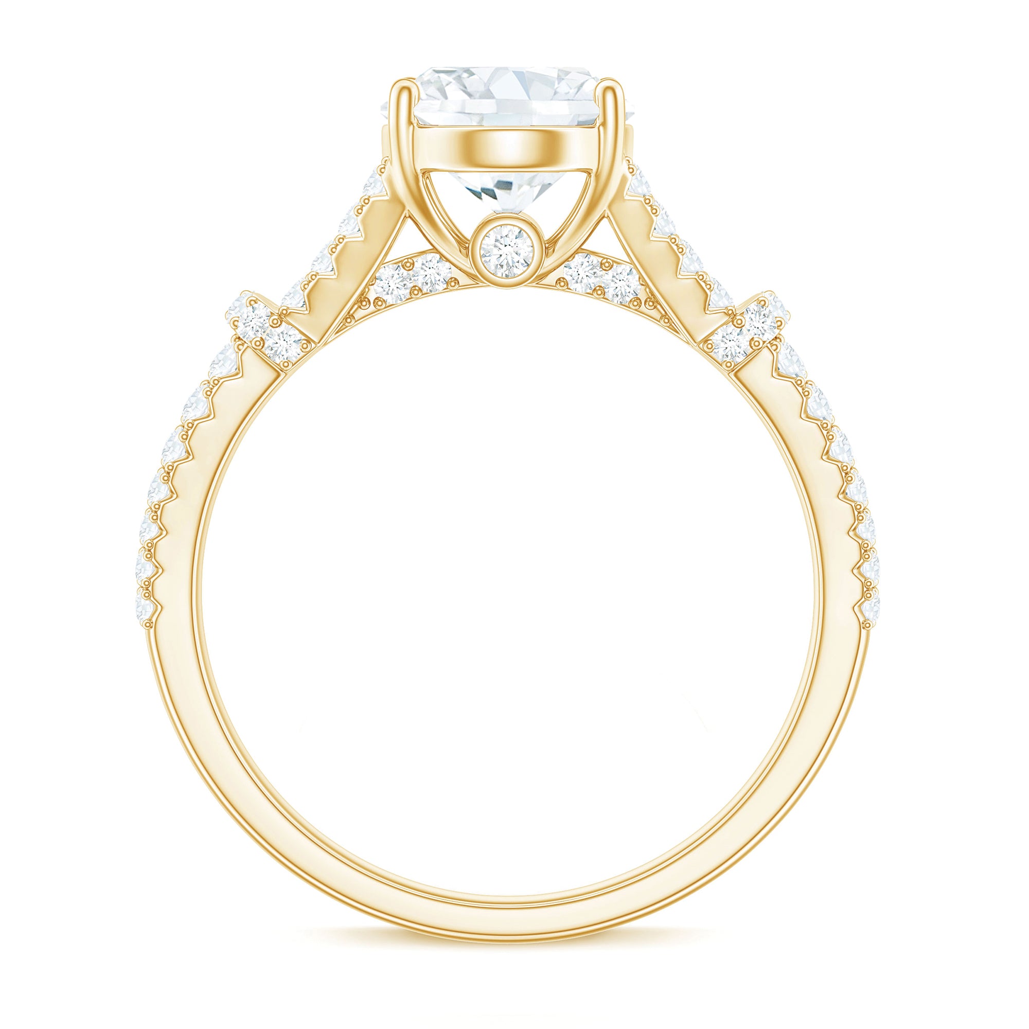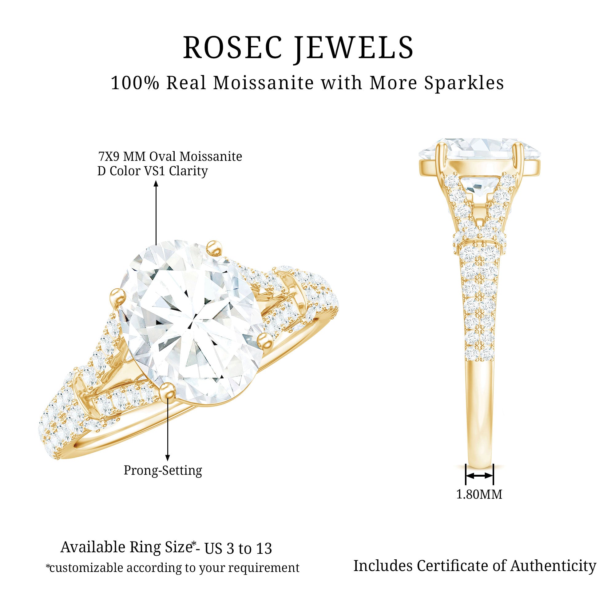 For the most special moments in your life, commence your eternal journey with a ring that embodies the profound nature of your love and the grace of your connection. This Oval Cut Engagement Ring represents a stunning fusion of elegance and emotion, crafted to honor your most significant occasions. At its core is a 7X9 MM oval cut moissanite, securely held in a prong setting. The center stone radiates timeless charm and modern elegance with every flicker of light. The true beauty of this Solitaire Engagement Ring lies in its split shank design, symbolizing two individual paths coming together as one. The elegantly divided band is adorned with small moissanite accents, carefully arranged to amplify the brilliance and importance of the design. This considerate feature not only introduces depth but also reflects the journey of unity and love that you share. To enhance its radiance, moissanite stones are also positioned along the bridge, forming a radiant pathway that directs attention to the center, where your love is highlighted. This 3 Carat Moissanite Ring seamlessly combines classic charm with a modern flair, making it a perfect selection for proposals, vow renewals, or any meaningful occasion. Crafted to be treasured for a lifetime, it provides a luxurious sparkle that is as lasting as your commitments.