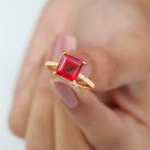 Unique Solitaire Ring is encased with sparkling 8.00 MM Princess Cut Created Ruby is set at the center in a prong setting. This Simple Engagement Ring is composed of Solid Gold, a perfect ring for your Love.