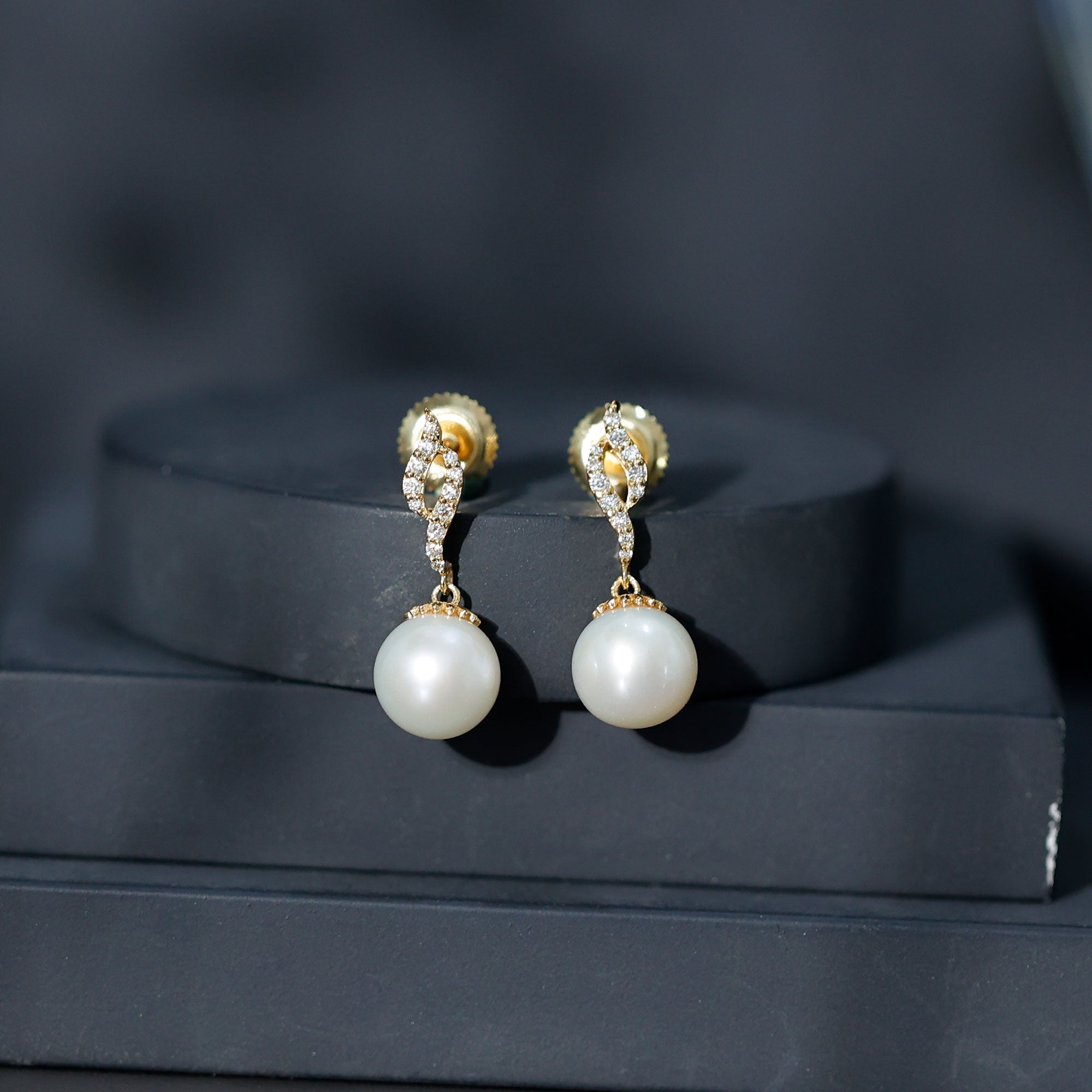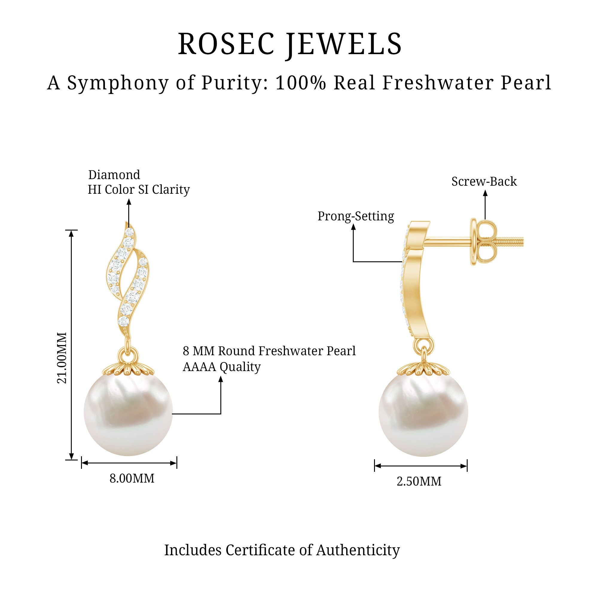 Bring a touch of elegance and charm to any special occasion with a pair of Freshwater Pearl Drop Earrings designed for timeless beauty. At the top, round diamonds form a delicate leafy motif, adding soft sparkle and graceful detail. From this design hangs an 8 MM round freshwater pearl, set in secure bead setting, moving gently with every step and catching the light beautifully. The Pearl and Diamond Earrings feature a screw back closure, ensuring a comfortable and secure fit for all-day wear. The smooth pearl drop balances perfectly with the sparkling diamonds, creating a classic and graceful look suitable for weddings, anniversaries, or other special moments. As June’s birthstone, freshwater pearls symbolize purity, calm, and balance, making these Freshwater Cultured Pearl Earrings meaningful as well as stunning. They make a thoughtful gift for a loved one or a cherished addition to a personal jewelry collection. Perfect for brides or anyone who loves elegant jewelry, these Wedding Drop Earrings add a touch of sophistication and beauty to every outfit, creating lasting memories on every special day.