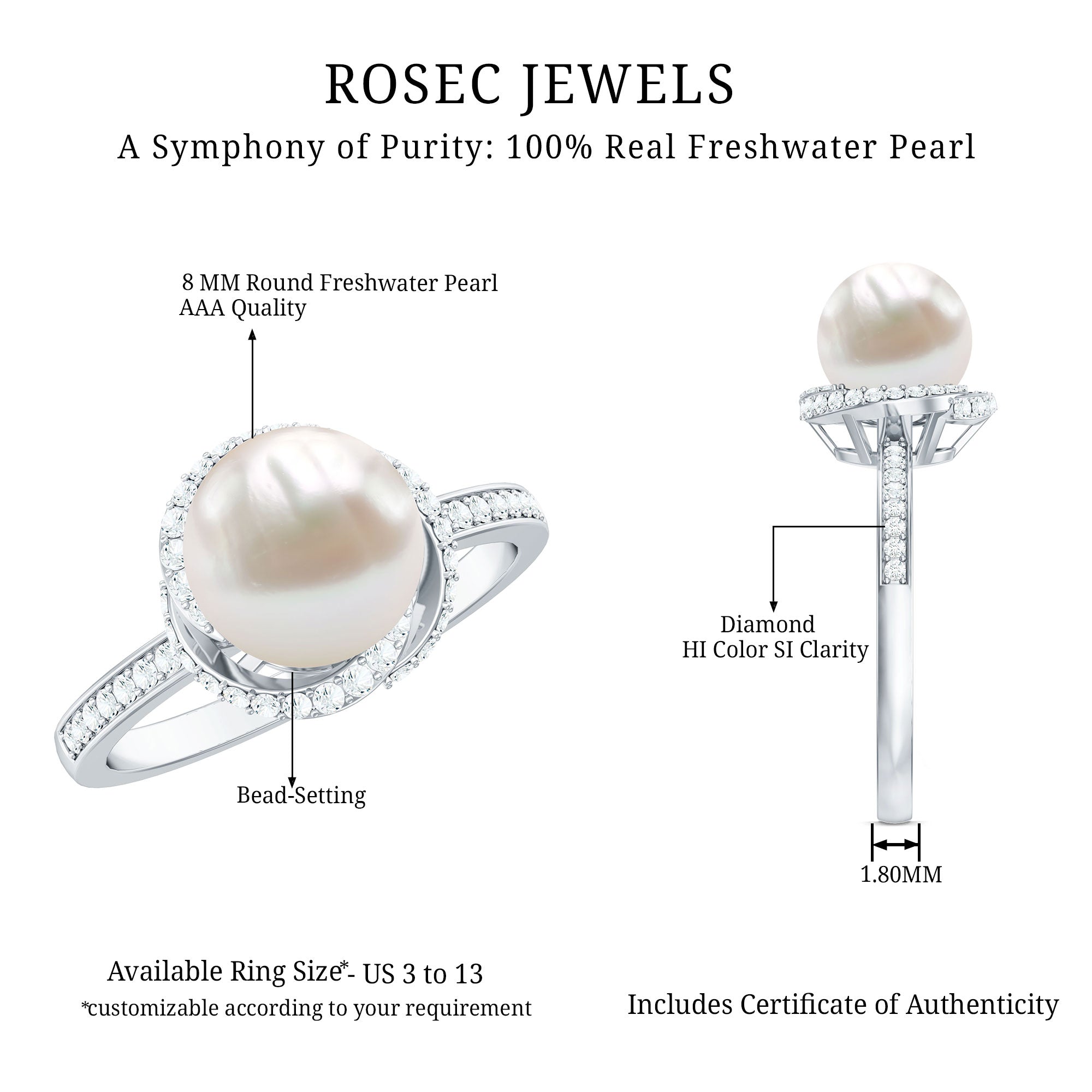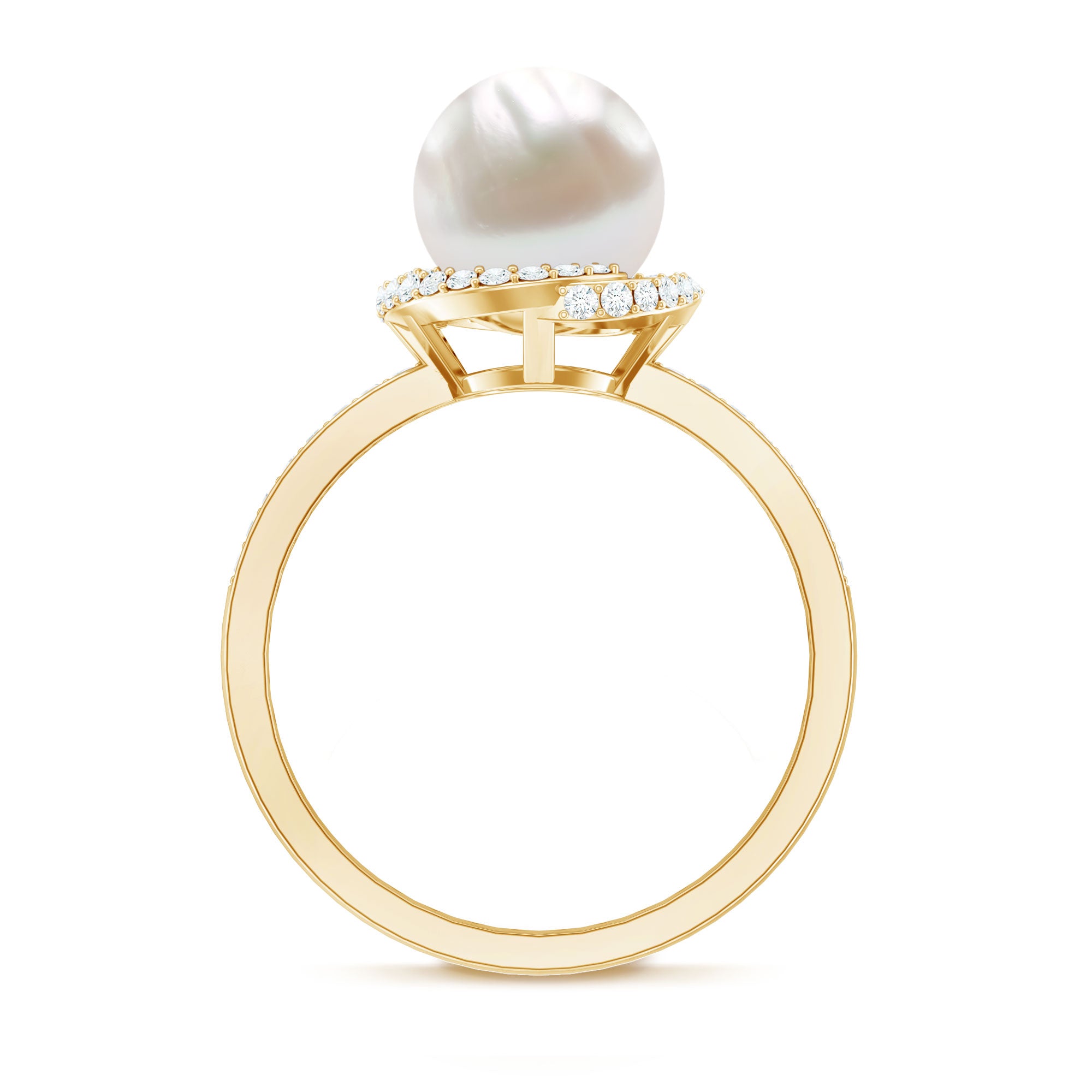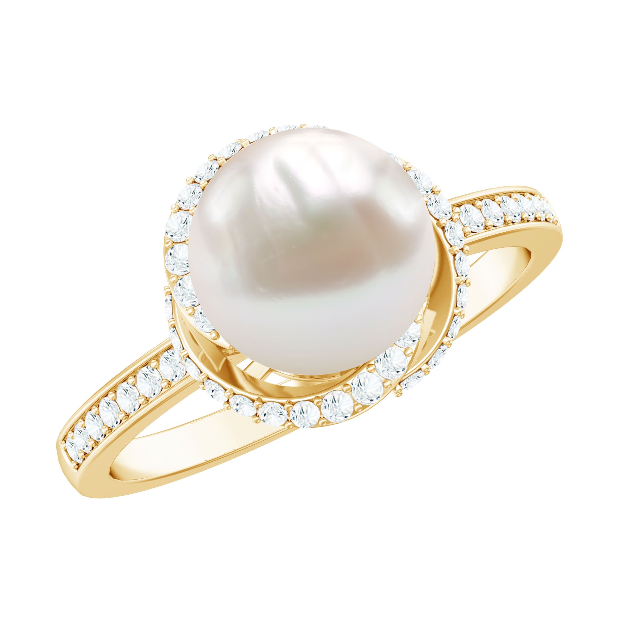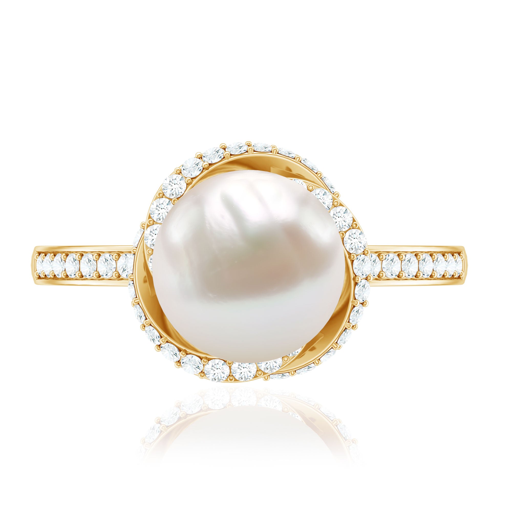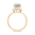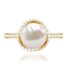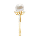 A bead set Round Shape Freshwater pearl takes the center stage in this design. Diamond swirl design and side stones grace the shank for added allure. This Freshwater Pearl and Diamond Ring is available in gold. This Freshwater Pearl Engagement Ring will be a unique present for women that they can wear on any occasion.