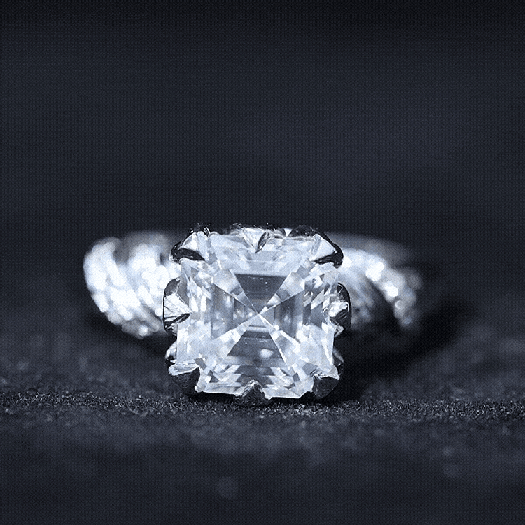 Refined and radiant, this Asscher Cut Engagement Ring is a breathtaking blend of classic elegance and modern artistry. At its center sits a dazzling 8 MM Asscher Cut Moissanite, set in a unique petal prong setting that mimics the soft curves of a blooming flower, adding a delicate, romantic touch to the bold geometry of the solitaire stone. Designed to let the center stone shine, this Moissanite Solitaire Ring is far from ordinary. The sleek band features a twisted design, accented with round cut dainty moissanites that glisten with every movement. Perfect for proposals, anniversaries, or simply as a statement of self-love, this 3 Carat Moissanite Ring captures timeless beauty with a designer twist. It is an ideal choice for someone who wants the elegance of a solitaire with the artistic charm of a truly unique setting, crafted to tell a story as enduring as love itself. We have handcrafted this Solitaire Moissanite Engagement Ring in a variety of precious metals, along with options for color and purity. Your Designer Ring will be shipped in a premium jewelry box, ensuring safe and secure delivery during transit and for storage afterwards. This timeless piece will surely become a treasured addition to her jewelry collection that she will cherish for a lifetime.
