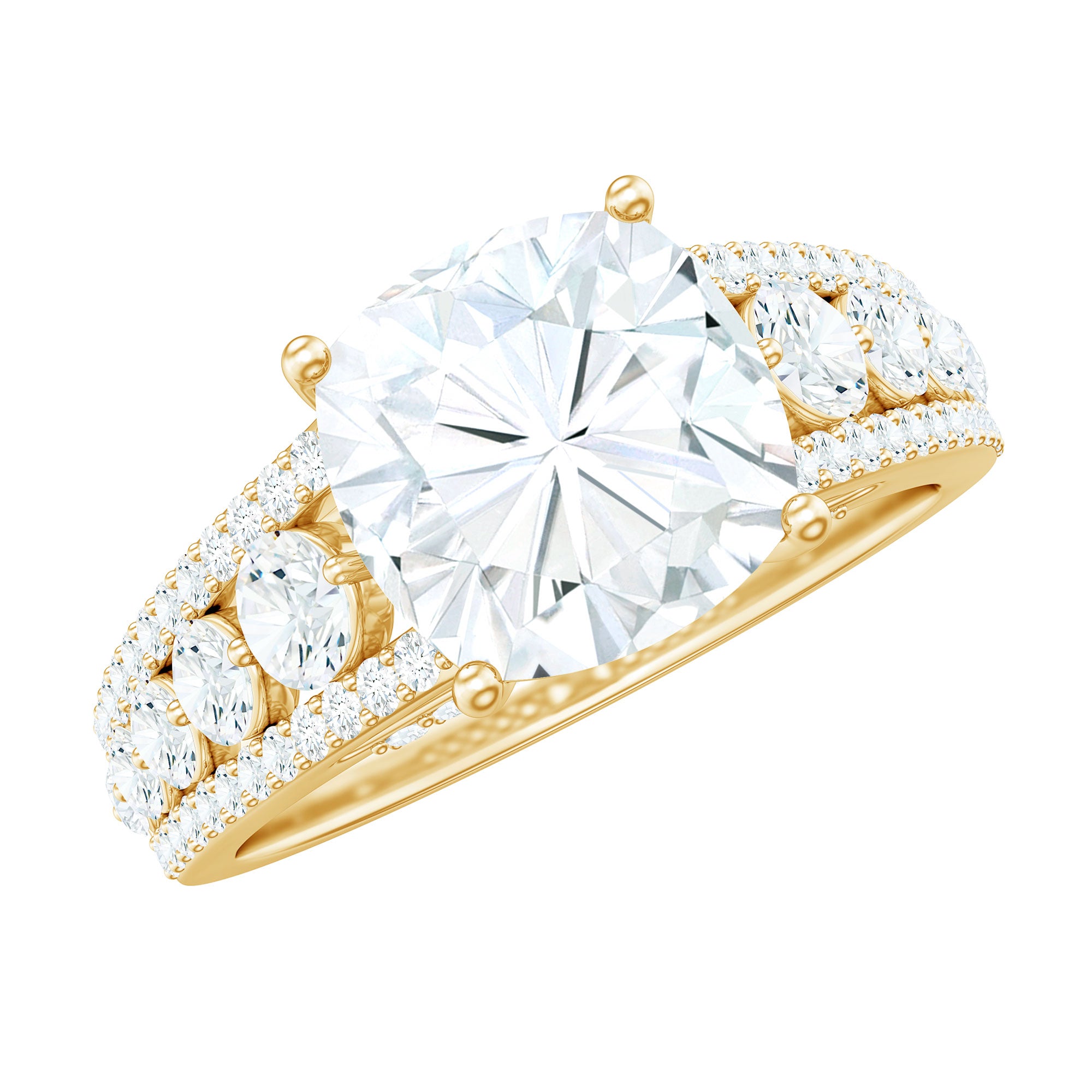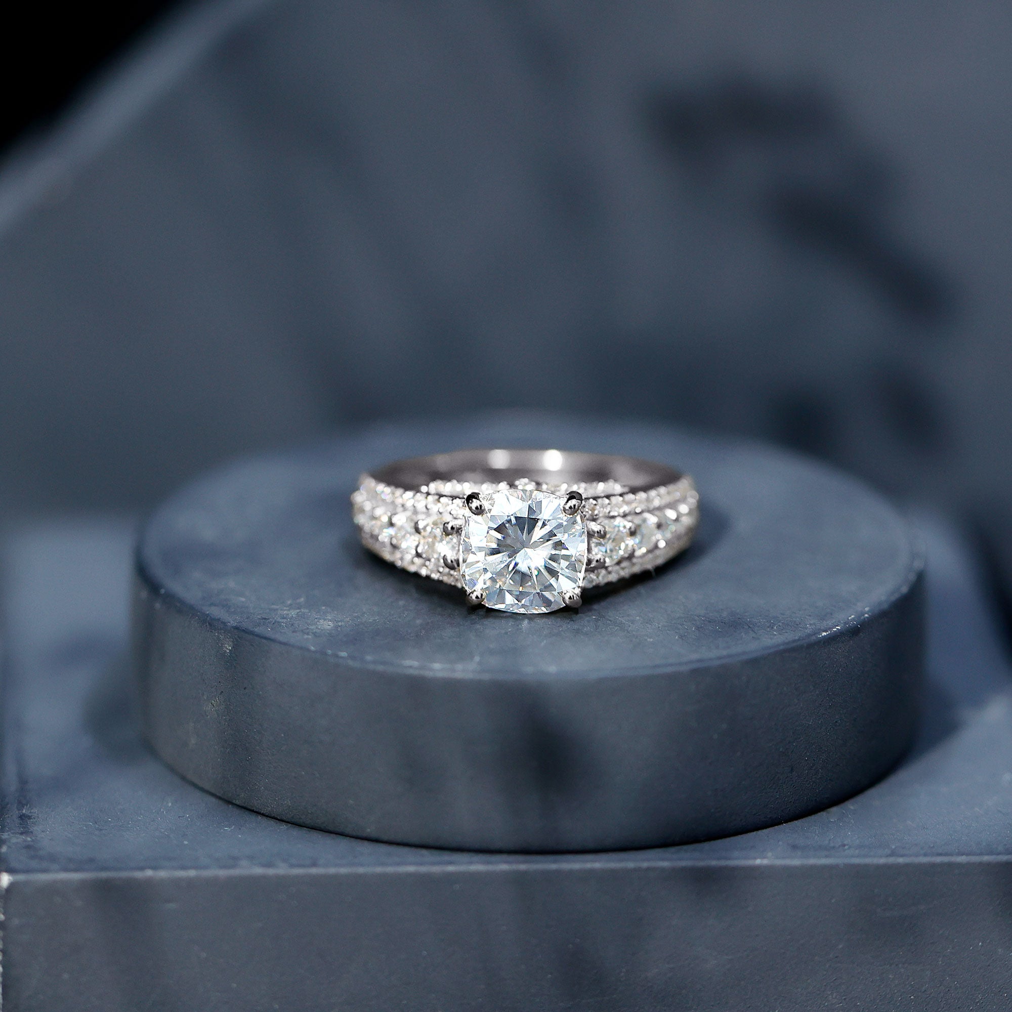 This Moissanite Engagement Ring is a symbol of perfection. The ring is embellished with an 8 MM Cushion Cut Moissanite securely placed in Prong Setting along with this ring features a hidden Moissanite. The inner shank is decorated with petite moissanite. The wide shank of this ring is decorated with the Moissanites in the Graduate Style. This Cushion Cut Ring is a timeless piece that she will treasure forever. This Classic Engagement Ring reflects the adorable shine of D-VS1 quality which makes it the perfect ring for the big day. Get her this ring and witness a priceless reaction of her and it will be delivered to you in the classic jewelry box with the authenticity certification.