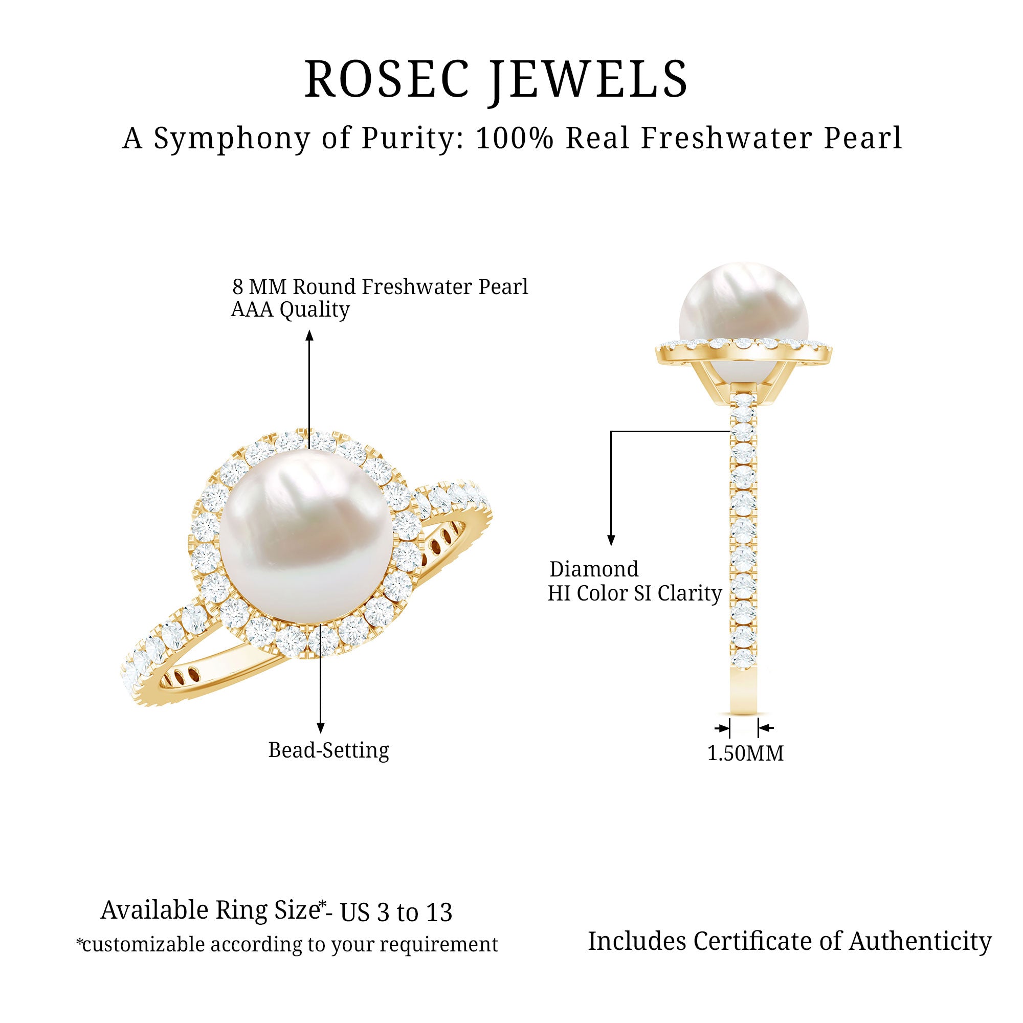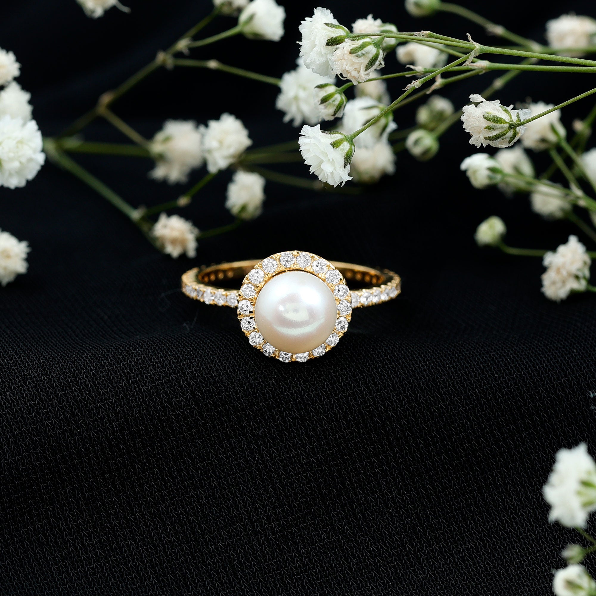 Unique Ring is the statement piece is embellished with Round Shape Freshwater Pearl as solitaire encircled with small Round Shape Diamond and more Diamond are set as a Side Stone. This Vintage Engagement Ring is available in 10K, and 18K Gold.