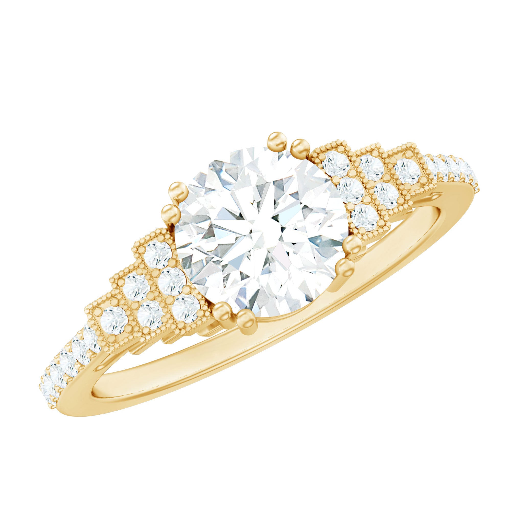 Make your special day even more memorable with this stunning Diamond Engagement Ring. This Solitaire Ring showcases an 8 MM round cut synthetic Diamond, beautifully held in double prong setting. The band is embellished with a sequence of round cut diamonds, highlighted by intricate beadwork that gives it a unique step-like design, making the center stone really pop. All the diamonds in this Classic Engagement Ring are lab-grown, and produced in an ethical and eco-friendly way. It's sure to be a beloved addition to her jewelry collection that shell treasure forever.