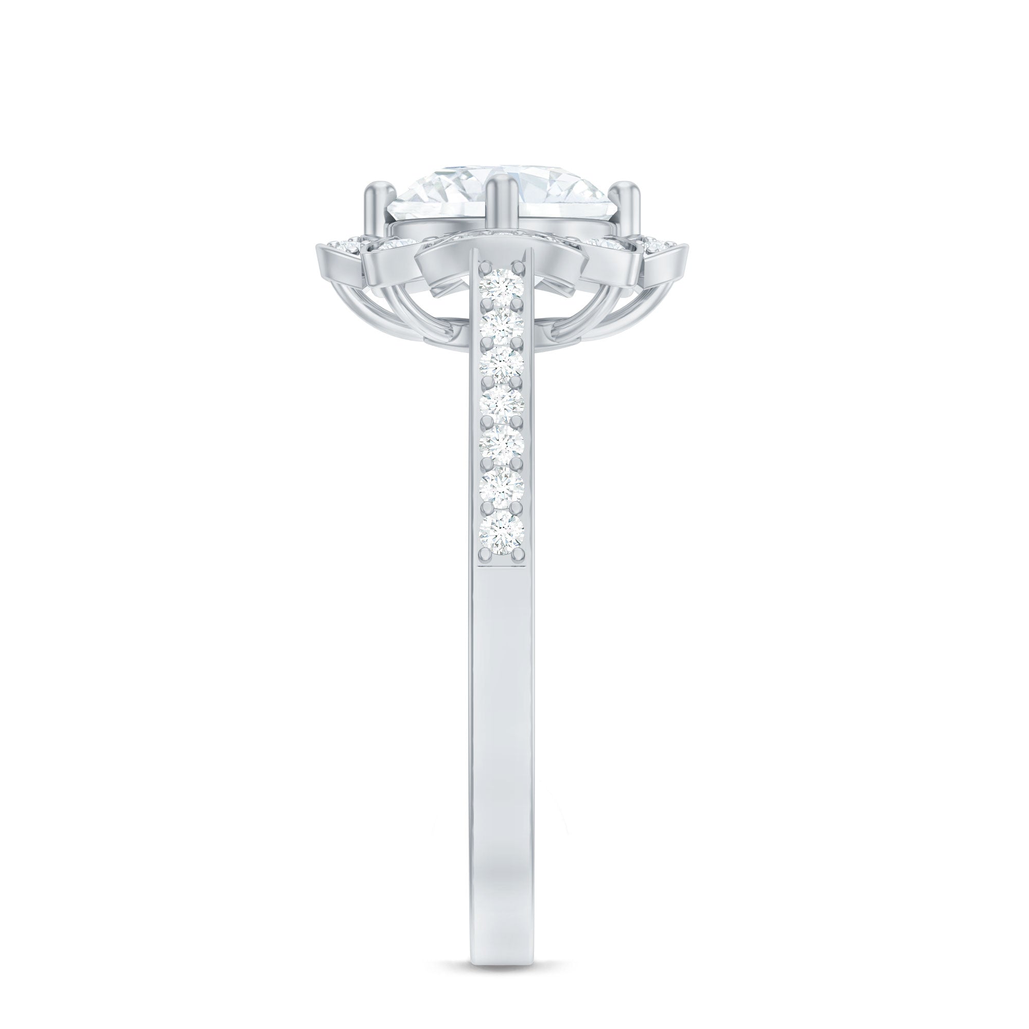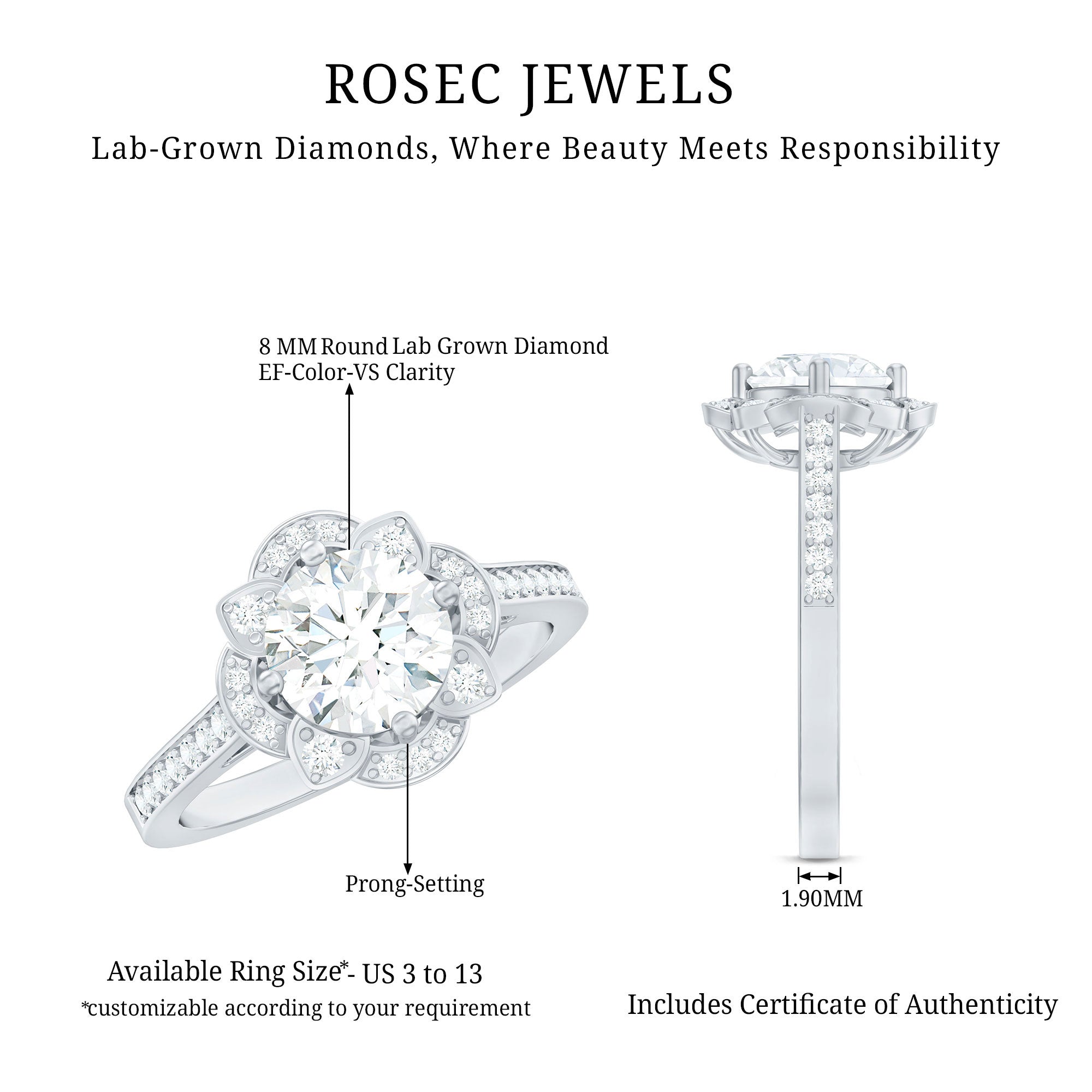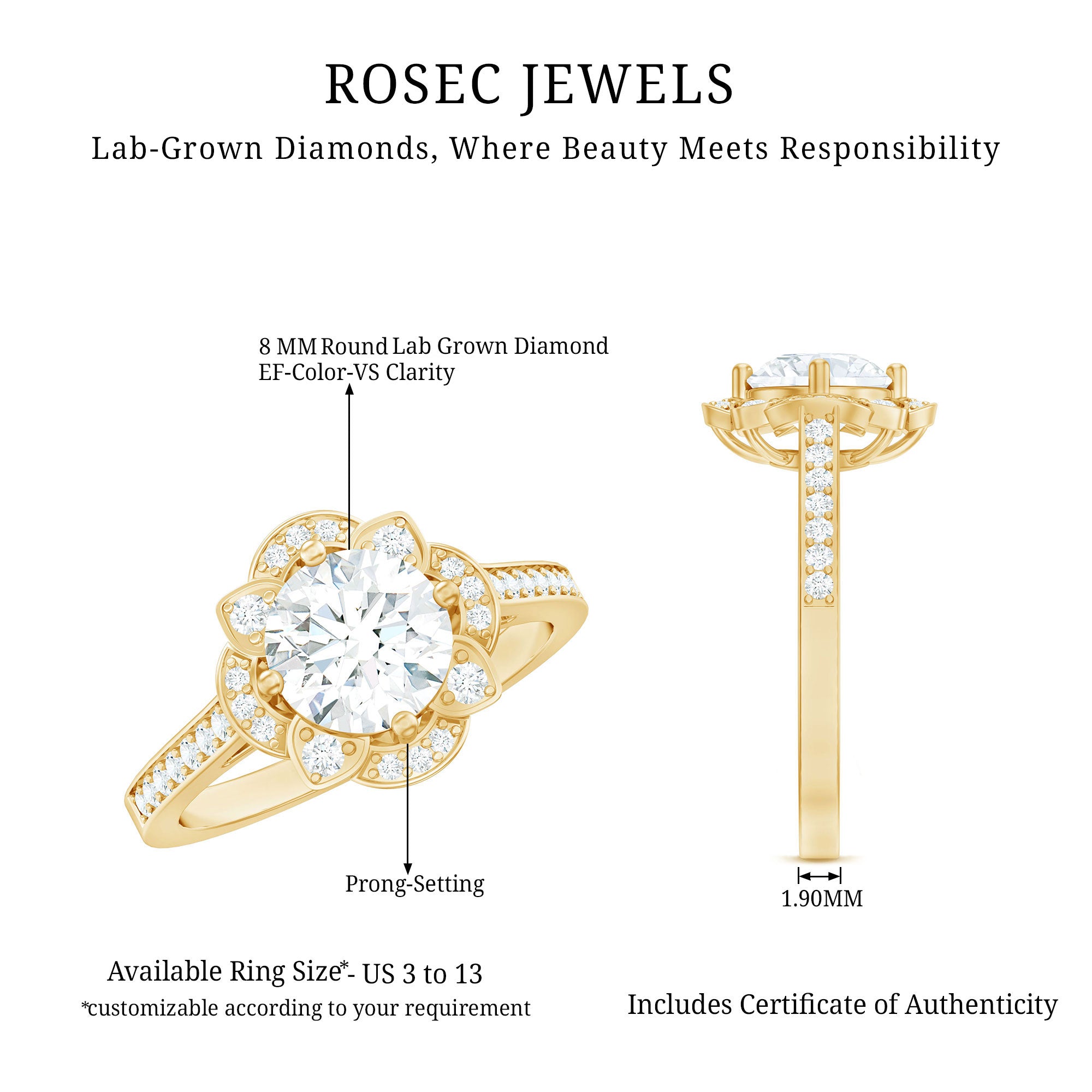 On your special day, embrace timeless elegance with this lab made Diamond Engagement Ring. Inspired by the beauty of nature, this Vintage Engagement Ring is embellished with an 8 MM round cut diamond (EF-VS quality) set in prong setting with brilliant small diamonds forming a floral halo. The simple and pinpoint band of this Antique Diamond Ring is gracefully adorned with a row of shimmering gemstones on both sides, adding an extra touch of sparkle. Every curve, every stone, and every detail in this Diamond Halo Ring is a testament to fine craftsmanship, blending natures beauty and old world charm in a way that feels both timeless and mesmerizing.