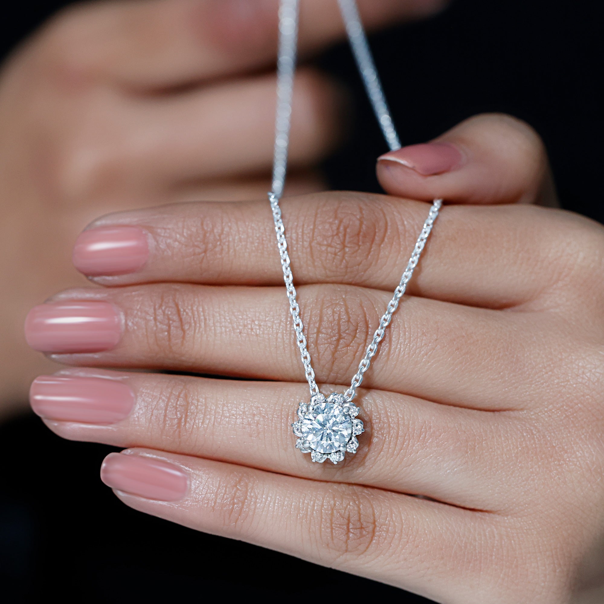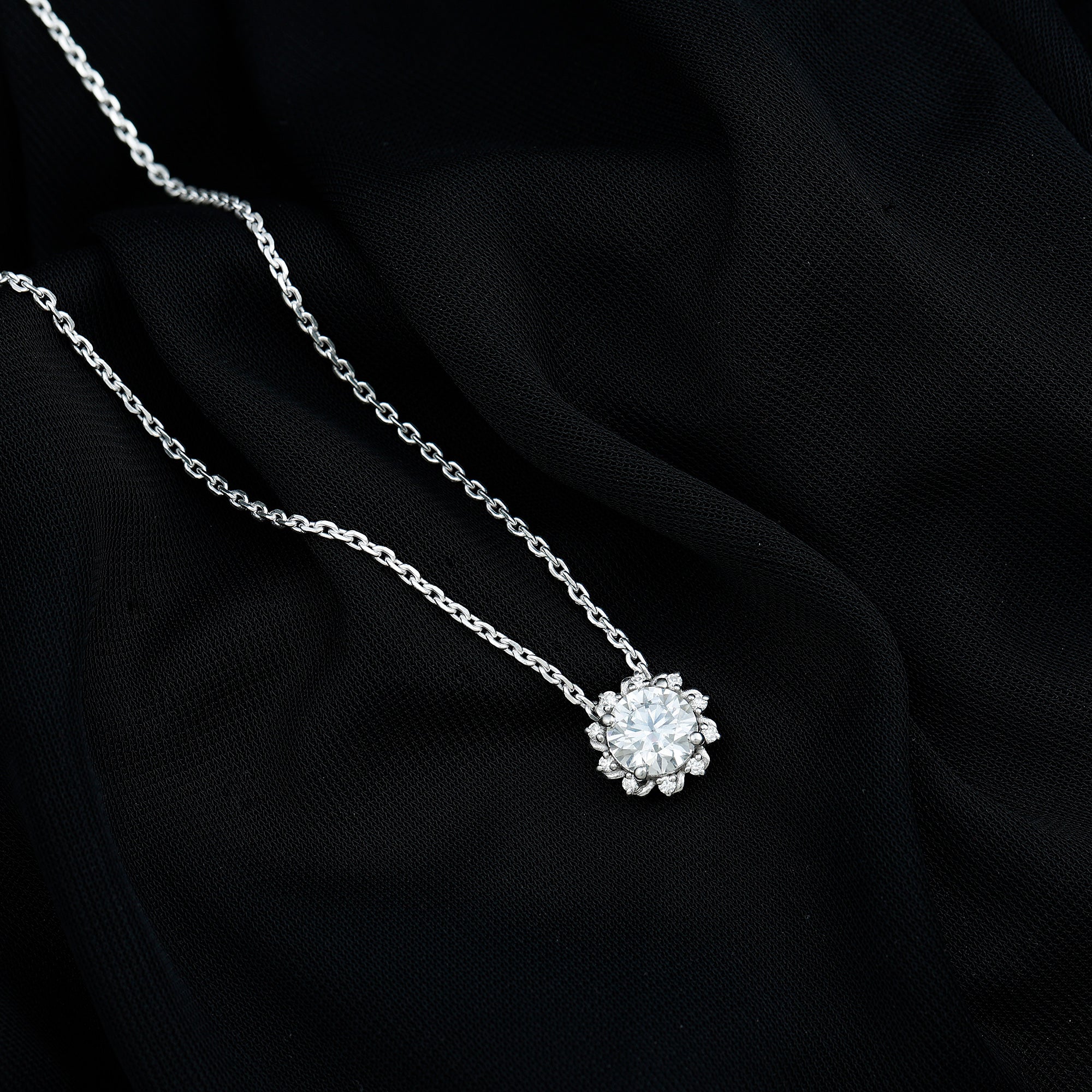 This mesmerizing 2 CT Diamond Necklace is a fine piece of jewelry with a soft and subtle appeal. It features a brilliant 8 MM round-shaped diamond (lab grown) stone of EF-VS quality. The gem is securely nestled in a prong setting, ensuring a sleek and polished look. The sunburst design with smaller diamonds surrounds the main stone and adds a unique, nature-inspired charm that makes this Round Diamond Pendant both timeless and striking. This Sunburst Pendant is a thoughtful and meaningful gift for anyone born in April or for those who appreciate the beauty of nature. Our beautiful pieces of jewelry are delivered to you in a premium jewelry box and handed over to you in a ready-to-gift state.