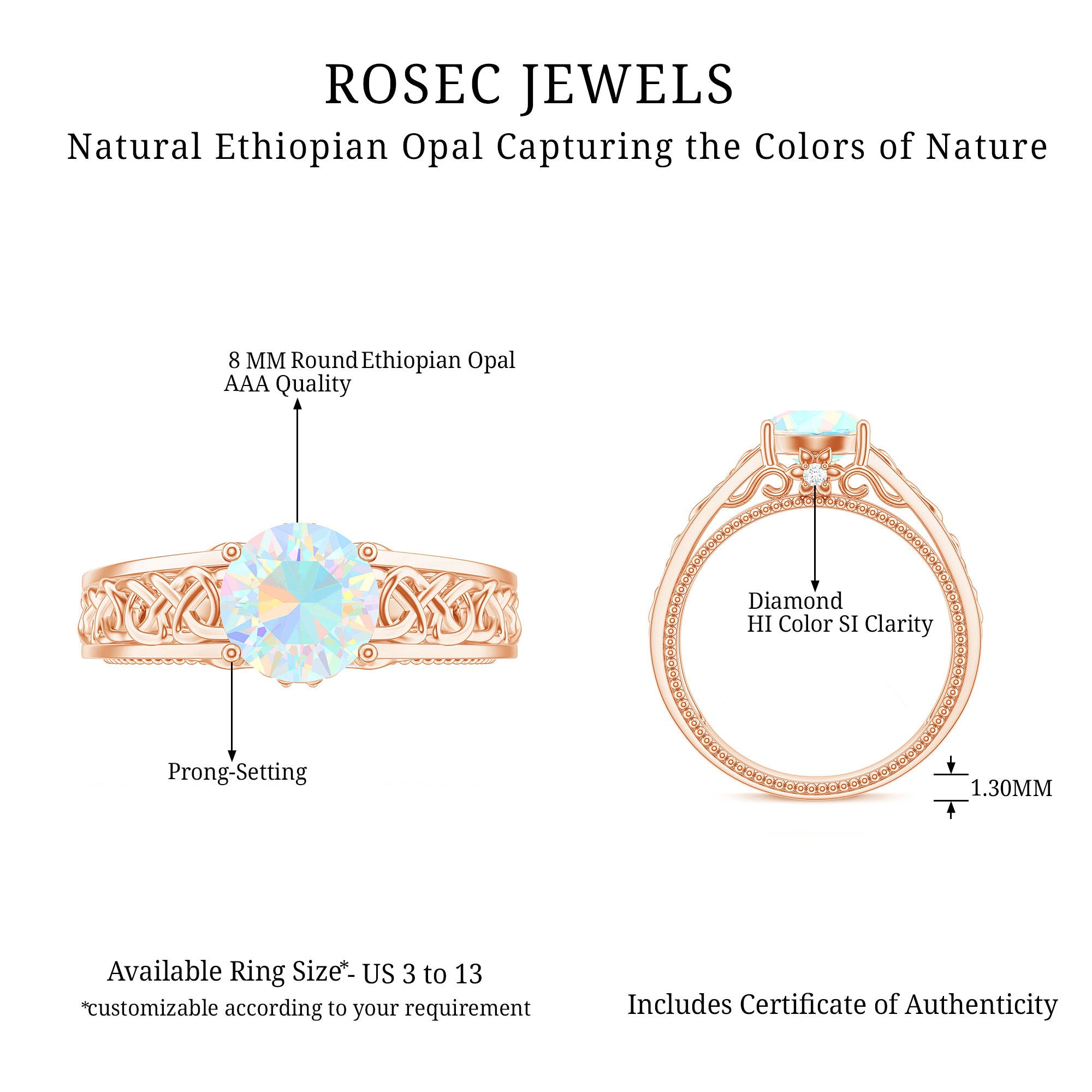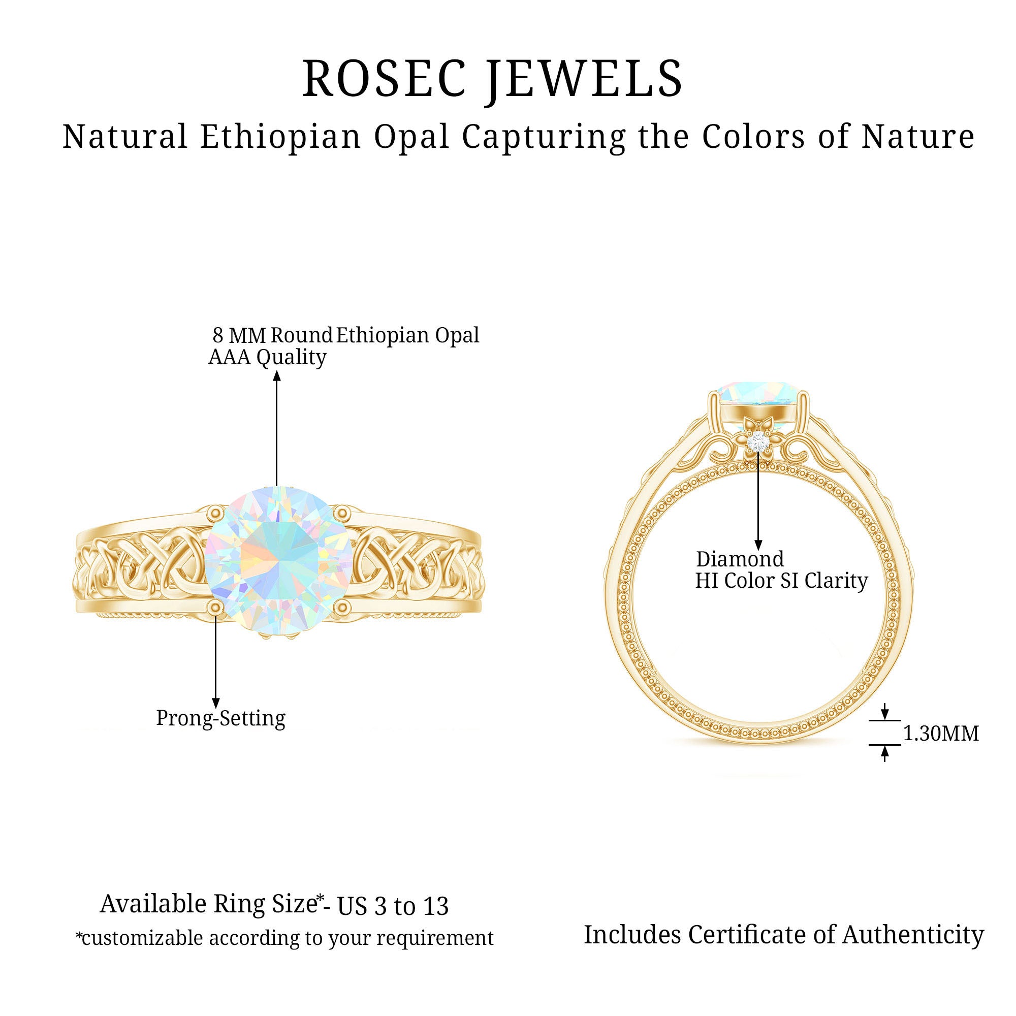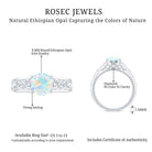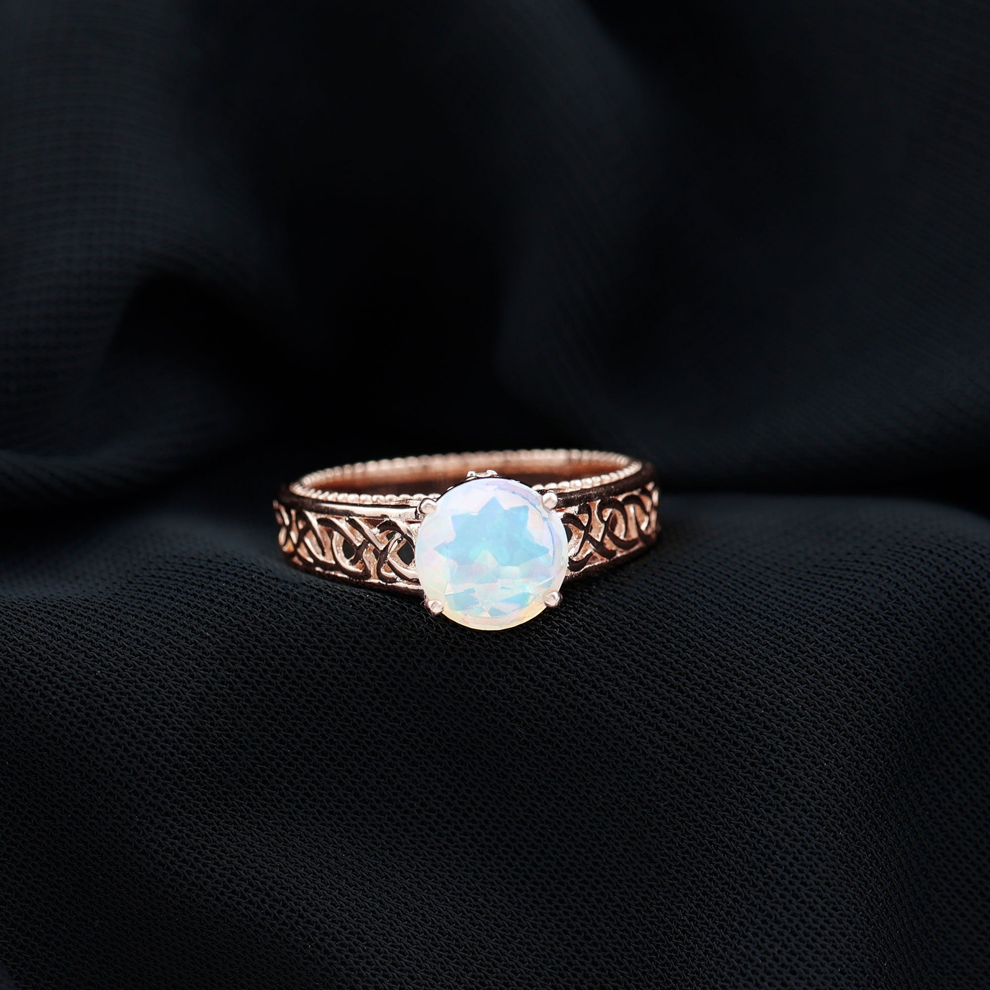 Timeless and elegant, this Vintage Looking Engagement Ring features a design rich in symbolism and full of soul. Handcrafted with perfection and attention to detail, this Solitaire Ring for Engagement features a mesmerizing 8 mm Ethiopian Opal set in Prong Setting, alive with shifting rainbows and timeless mystique. Intricate Celtic Knotwork winds along the band, symbolizing eternal love, loyalty and connection. Hidden within the design lie two Surprise Diamond stones beneath the center stone, a secret sparkle just for you. The Beaded Detailing along the shank adds a vintage inspired touch that feels as special as the love it represents. Every detail of this Celtic Knot Engagement Ring is crafted to honor both tradition and individuality, blending ancient symbolism with a modern edge. Arrives in a keepsake jewelry box, ready to mark a forever moment. Available in a variety of sizes for a flawless fit. For the ones who believe in fate, this Opal Solitaire Ring is a meaningful heirloom in the making. Make your big day more special with something truly mesmerizing.