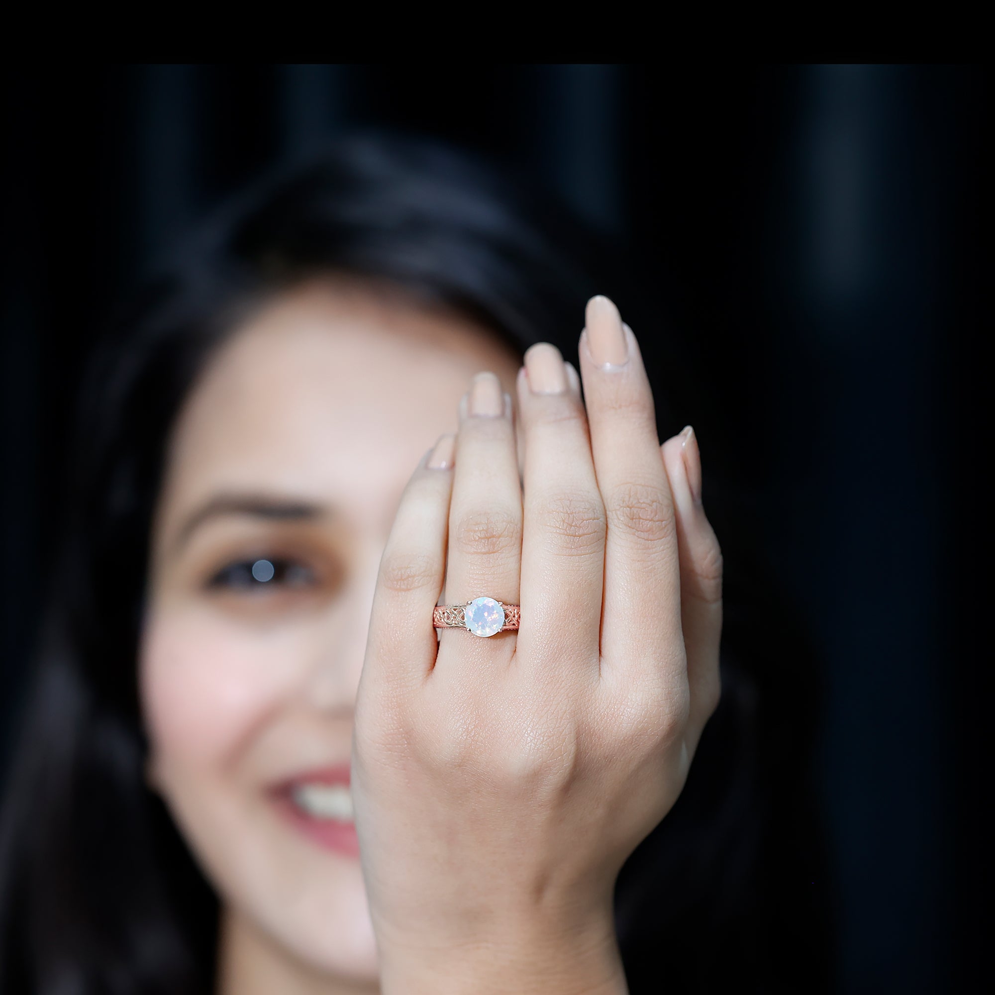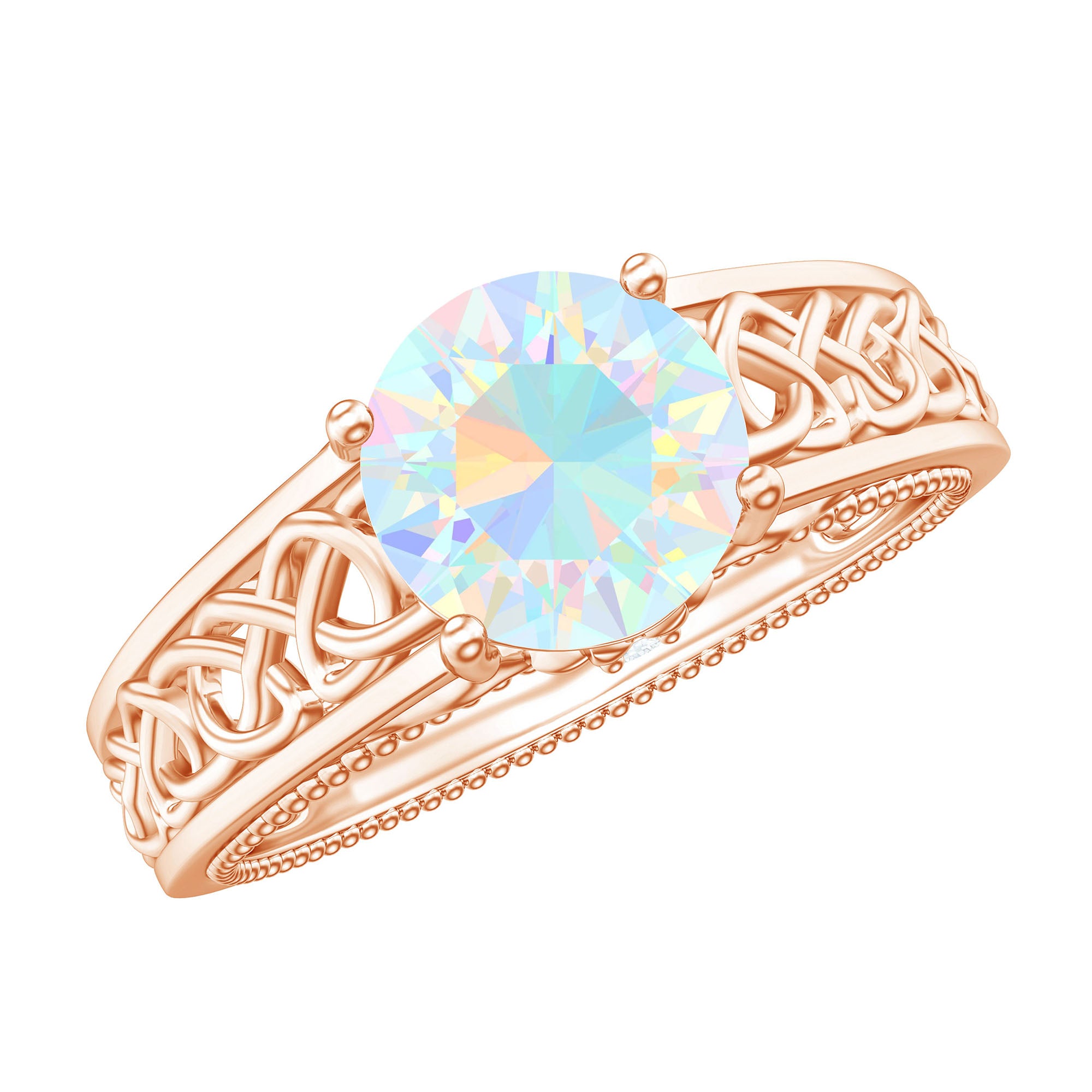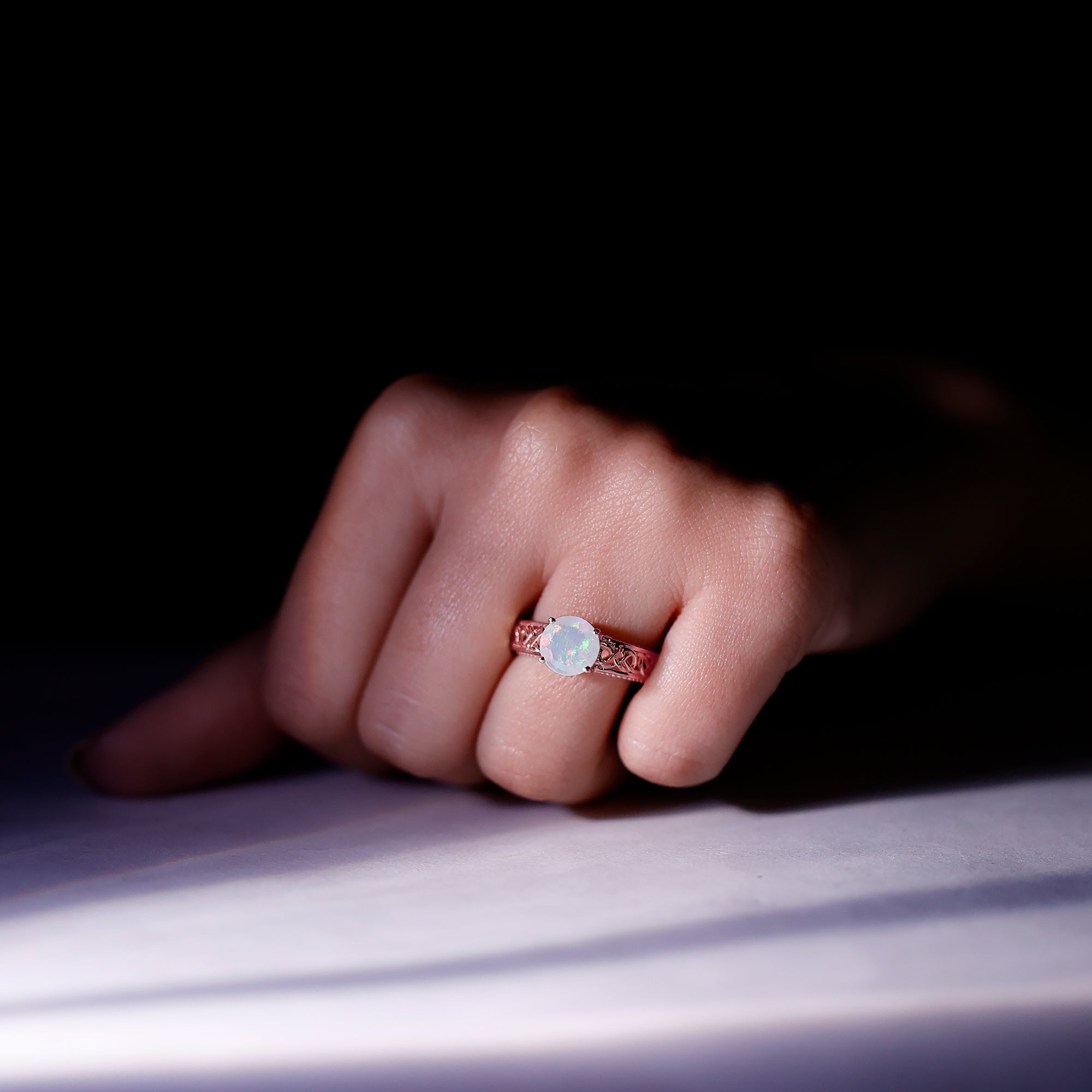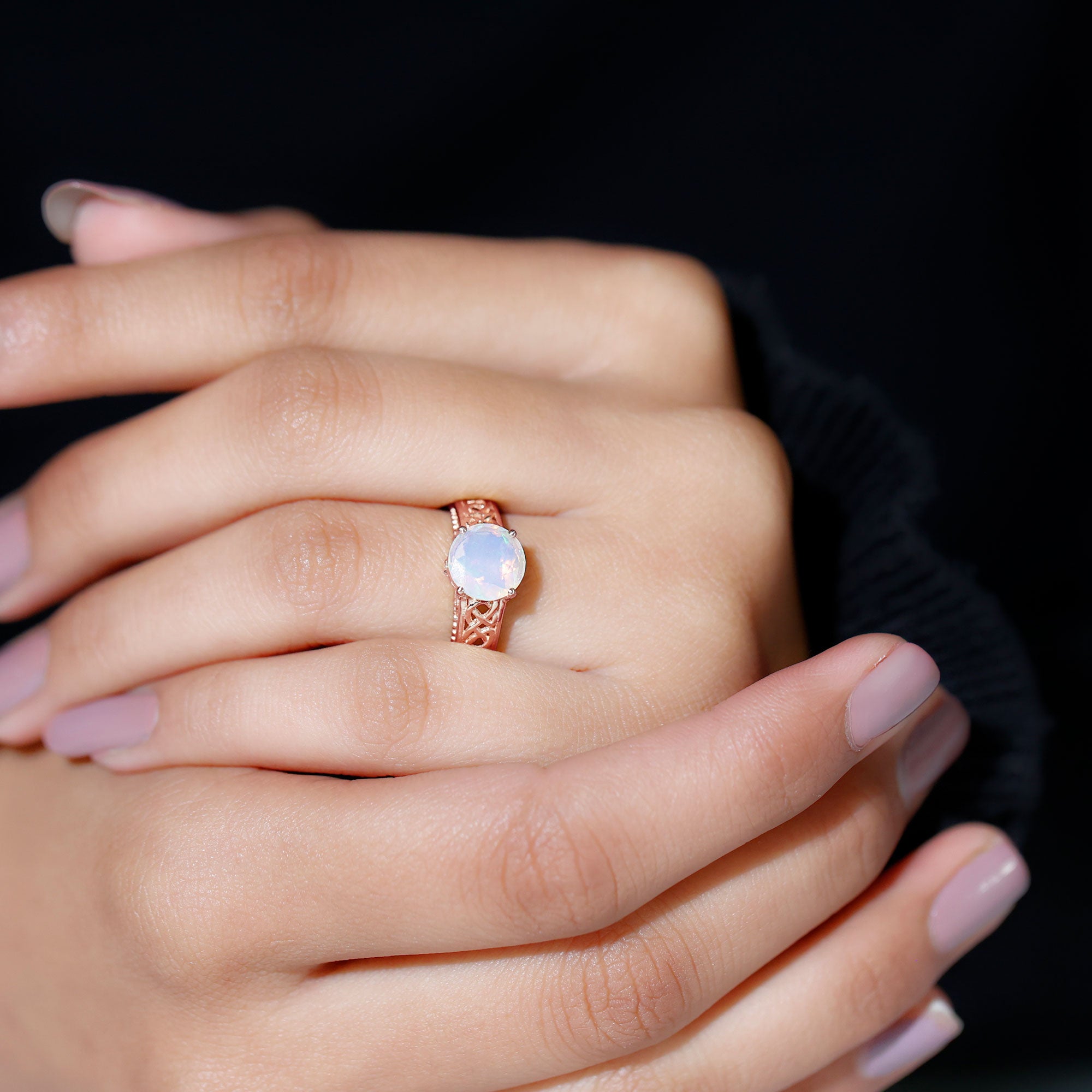 Timeless and elegant, this Vintage Looking Engagement Ring features a design rich in symbolism and full of soul. Handcrafted with perfection and attention to detail, this Solitaire Ring for Engagement features a mesmerizing 8 mm Ethiopian Opal set in Prong Setting, alive with shifting rainbows and timeless mystique. Intricate Celtic Knotwork winds along the band, symbolizing eternal love, loyalty and connection. Hidden within the design lie two Surprise Diamond stones beneath the center stone, a secret sparkle just for you. The Beaded Detailing along the shank adds a vintage inspired touch that feels as special as the love it represents. Every detail of this Celtic Knot Engagement Ring is crafted to honor both tradition and individuality, blending ancient symbolism with a modern edge. Arrives in a keepsake jewelry box, ready to mark a forever moment. Available in a variety of sizes for a flawless fit. For the ones who believe in fate, this Opal Solitaire Ring is a meaningful heirloom in the making. Make your big day more special with something truly mesmerizing.