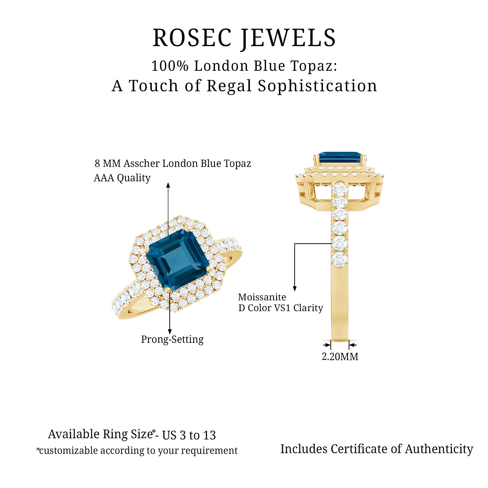 Enter a realm of enduring elegance with this eye-catching London Blue Topaz Ring. Showcasing an 8 mm Asscher Shaped London Blue Topaz set in a Prong Setting, it is surrounded by a radiant Moissanite Double Halo, resulting in an unforgettable display of sophistication. This Art Deco Engagement Ring having AAA quality London Blue Topaz stone and D color VS1 clarity Moissanites, going through strict quality check to ensure better quality. This Statement Engagement Ring has geometric style shape, making it an ideal jewelry for ancient design lovers. The combination of deep color and brilliant illumination renders it an ideal emblem of love, commitment, and everlasting beauty. This Double Halo Engagement Ring, featuring a double halo, enhances depth and visual impact, establishing a striking contrast between the rich AAA London Blue Topaz and the vibrant sparkle of the D-Vs1 Moissanite. Adorning the sides are brilliant cut Moissanite stones, making it a remarkable piece of jewelry for your engagement, wedding, or any special celebration. This Geometric Engagement Ring is available in various sizes to choose from, deliver in a signature jewelry box, ready to gift to your loved ones.