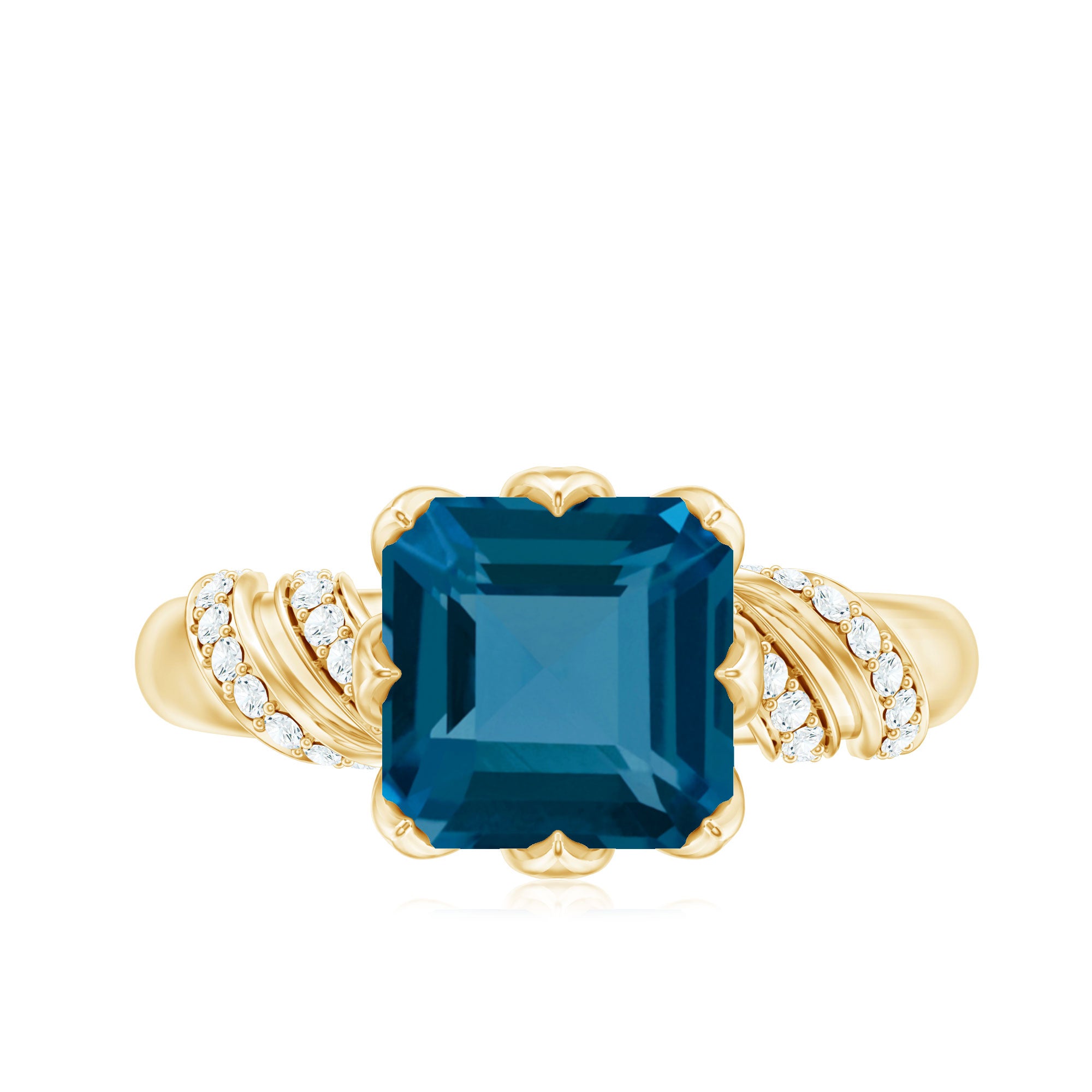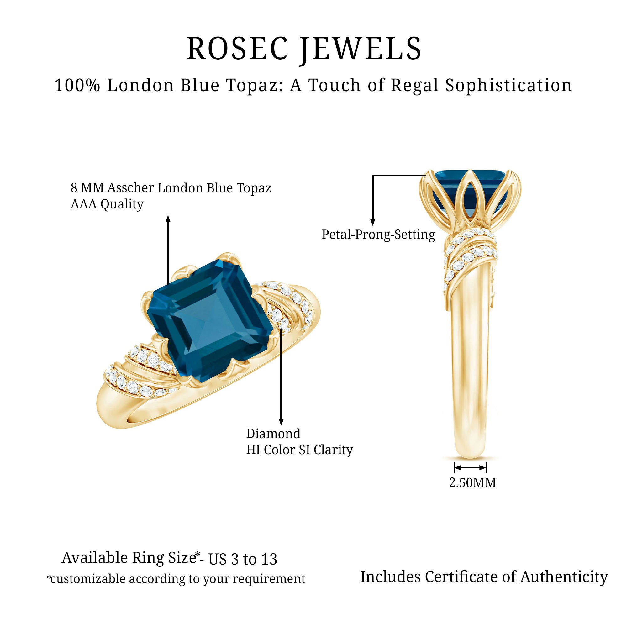 Elegant and luminous, this Asscher Cut Engagement Ring represents a stunning fusion of traditional sophistication and contemporary artistry. At its heart lies a brilliant 8 MM Asscher Cut London Blue Topaz, nestled within a distinctive petal prong setting that emulates the gentle curves of a blossoming flower, imparting a subtle, romantic essence to the striking geometry of the solitaire stone. Designed to showcase the center stone, this Blue Topaz Solitaire Ring is anything but conventional. The streamlined band boasts a twisted design, embellished with petite round cut Diamonds that sparkle with every movement. Ideal for proposals, anniversaries, or simply as a declaration of self-appreciation, this London Blue Topaz Ring embodies timeless elegance with a designer flair. It is the perfect selection for anyone desiring the grace of a solitaire combined with the artistic allure of a truly distinctive setting, crafted to narrate a tale as lasting as love itself. We have meticulously crafted this London Blue Topaz Engagement Ring in a range of precious metals, along with choices for color and purity. Your Designer Engagement Ring will be delivered in a luxurious jewelry box, ensuring safe and secure transport and storage thereafter. This everlasting piece is destined to become a cherished addition to her jewelry collection, one she will hold dear for a lifetime.