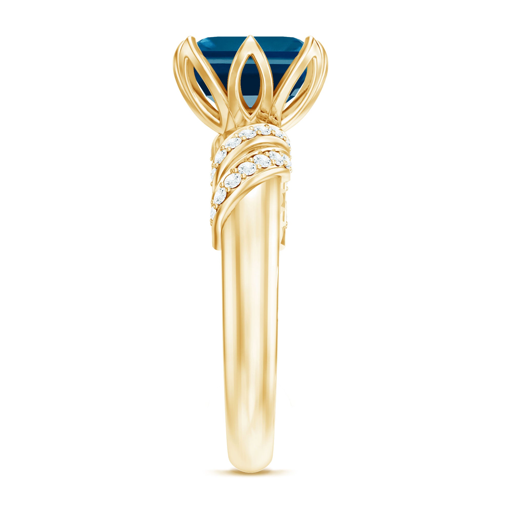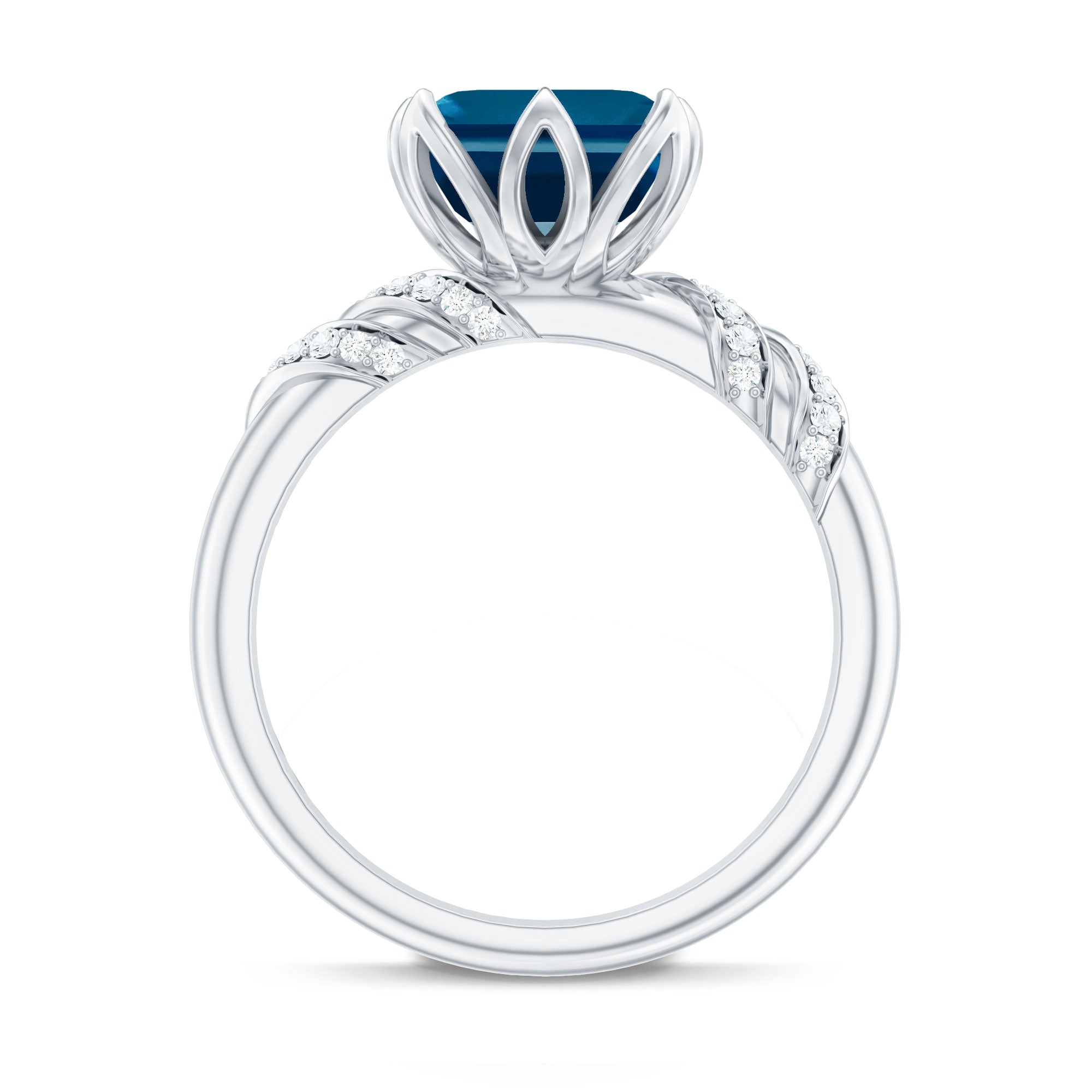 Elegant and luminous, this Asscher Cut Engagement Ring represents a stunning fusion of traditional sophistication and contemporary artistry. At its heart lies a brilliant 8 MM Asscher Cut London Blue Topaz, nestled within a distinctive petal prong setting that emulates the gentle curves of a blossoming flower, imparting a subtle, romantic essence to the striking geometry of the solitaire stone. Designed to showcase the center stone, this Blue Topaz Solitaire Ring is anything but conventional. The streamlined band boasts a twisted design, embellished with petite round cut Diamonds that sparkle with every movement. Ideal for proposals, anniversaries, or simply as a declaration of self-appreciation, this London Blue Topaz Ring embodies timeless elegance with a designer flair. It is the perfect selection for anyone desiring the grace of a solitaire combined with the artistic allure of a truly distinctive setting, crafted to narrate a tale as lasting as love itself. We have meticulously crafted this London Blue Topaz Engagement Ring in a range of precious metals, along with choices for color and purity. Your Designer Engagement Ring will be delivered in a luxurious jewelry box, ensuring safe and secure transport and storage thereafter. This everlasting piece is destined to become a cherished addition to her jewelry collection, one she will hold dear for a lifetime.
