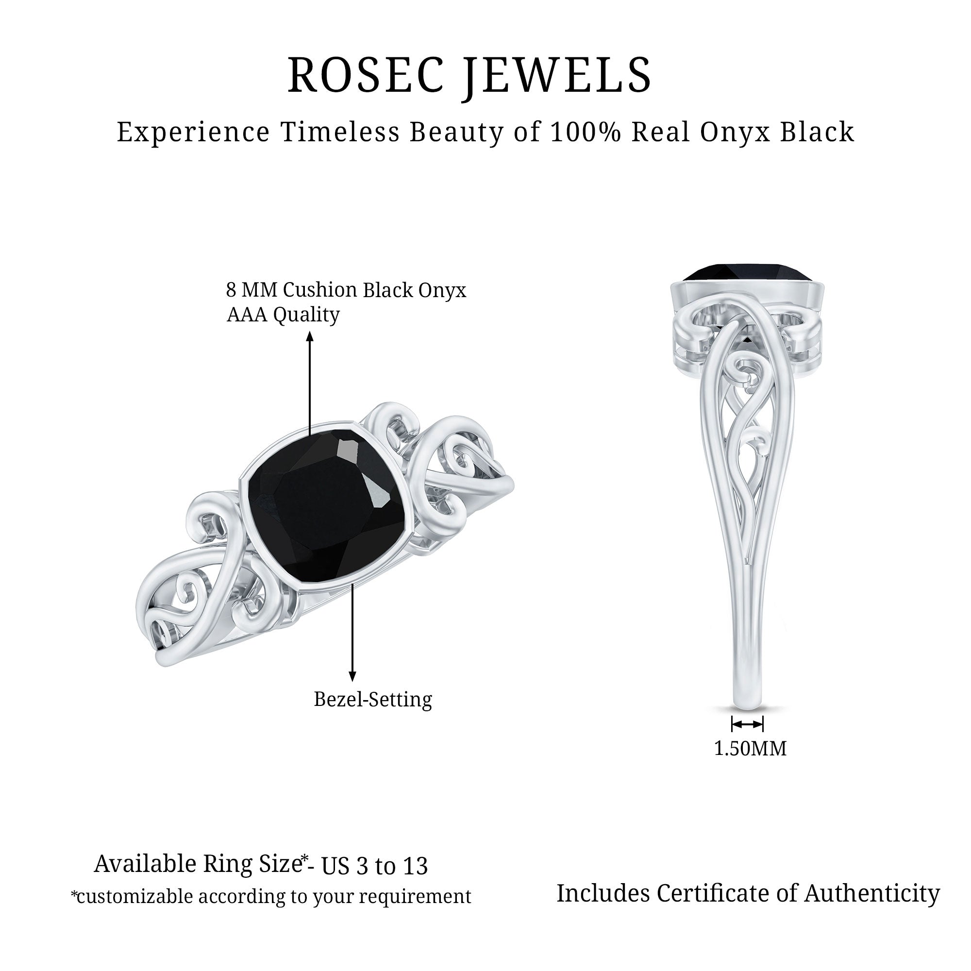Crafted with a hint of history, this Vintage Onyx Engagement Ring possesses a beauty that remains timeless. Drawing inspiration from antique styles, this Art Deco Ring is ideal for those who appreciate classic sophistication combined with a contemporary sparkle. At its heart, a 8 mm Cushion Cut Black Onyx set at the center as Solitaire, in secured bezel setting. The band is further embellished with cutwork design, providing brilliance from every perspective and resulting in a truly captivating piece. Constructed with AAA quality Black Onyx stone, this Antique Style Engagement Ring radiates beautifully and delivers a luminous shine, all without the exorbitant price tag. This Vintage Engagement Ring harmonizes traditional beauty with a modern flair, serving as a significant emblem of eternity. It is offered in a variety of metal colors and purity levels, allowing you to select the option that best reflects your personal style. Additionally, it is presented in an exquisitely designed jewelry box, perfect for gifting or commemorating a special occasion. Elegant, distinctive, and brimming with charm, this Retro Engagement Ring is a timeless treasure you will hold dear for years to come.