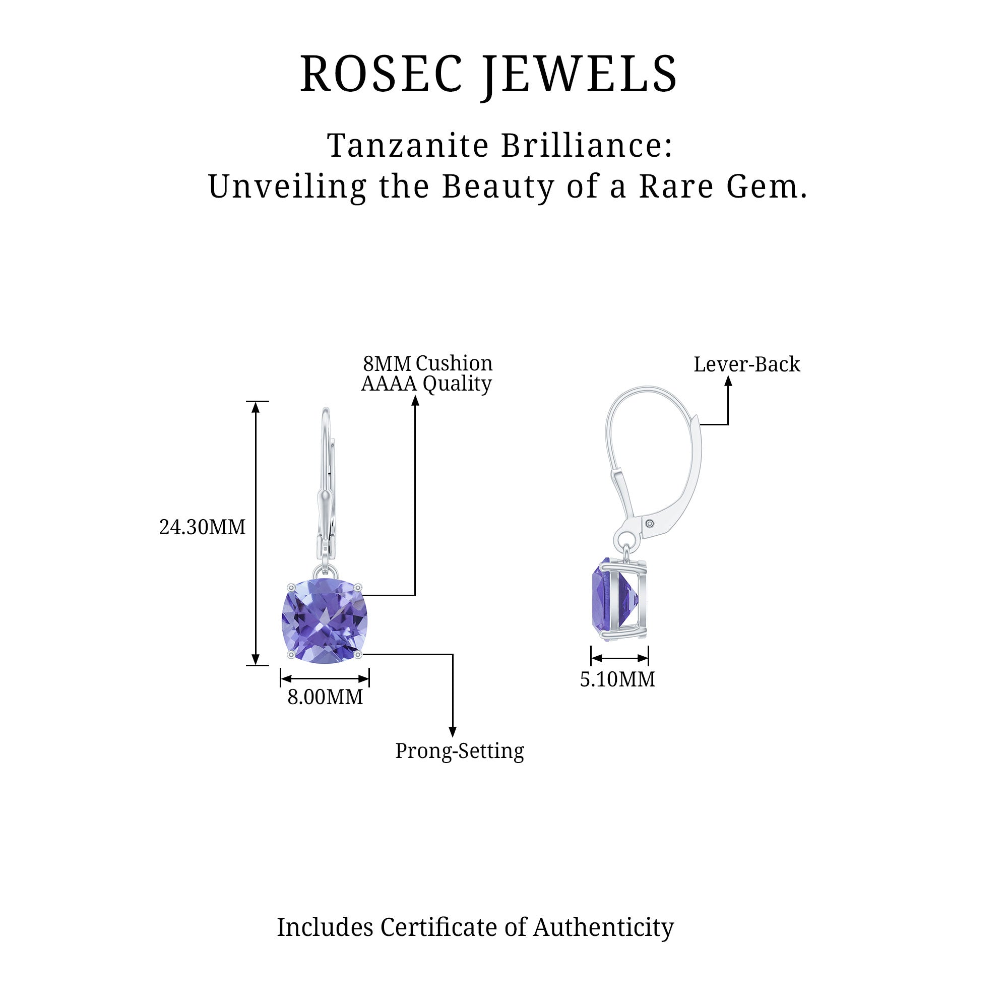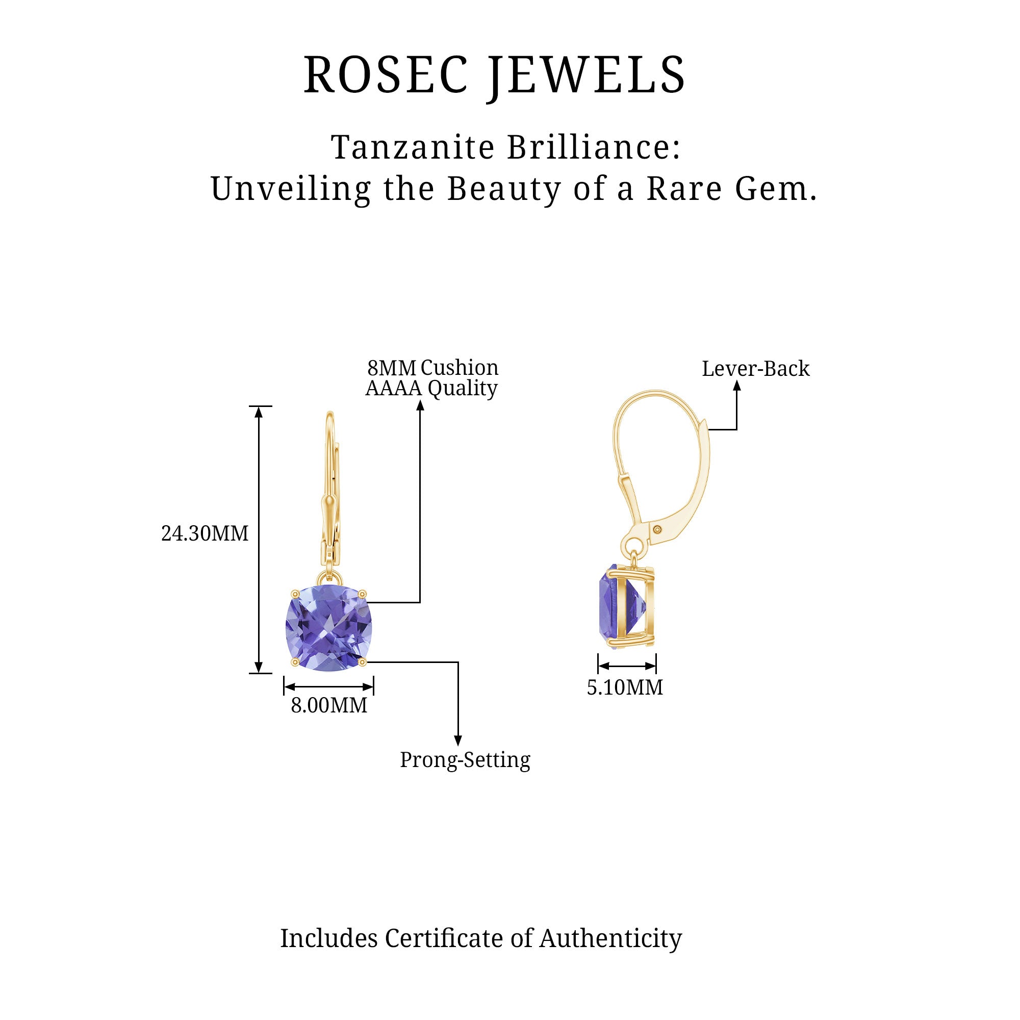Elevate her special day to new heights of memorability with these stunning Tanzanite Drop Earrings. These exquisite Solitaire Earrings feature an 8 MM Cushion Cut Lab Created Tanzanite, beautifully nestled in prong setting. The addition of a lever back adds a charming and captivating touch to these Cushion Cut Earrings, ensuring they catch the eye and capture the heart. Present the gift of timeless beauty and elegance with these enchanting Lab Created Tanzanite Earrings, a symbol of your affection and thoughtfulness. Their timeless yet modern appeal makes them a versatile addition to any jewelry collection, perfect for evening events, weddings, or simply adding sophistication to an everyday outfit. The refined combination of the sparkling stone and polished metal offers a unique statement of beauty and strength. Ethically made and eco-friendly, these Dangle Drop Earrings are crafted to last, offering both elegance and peace of mind.