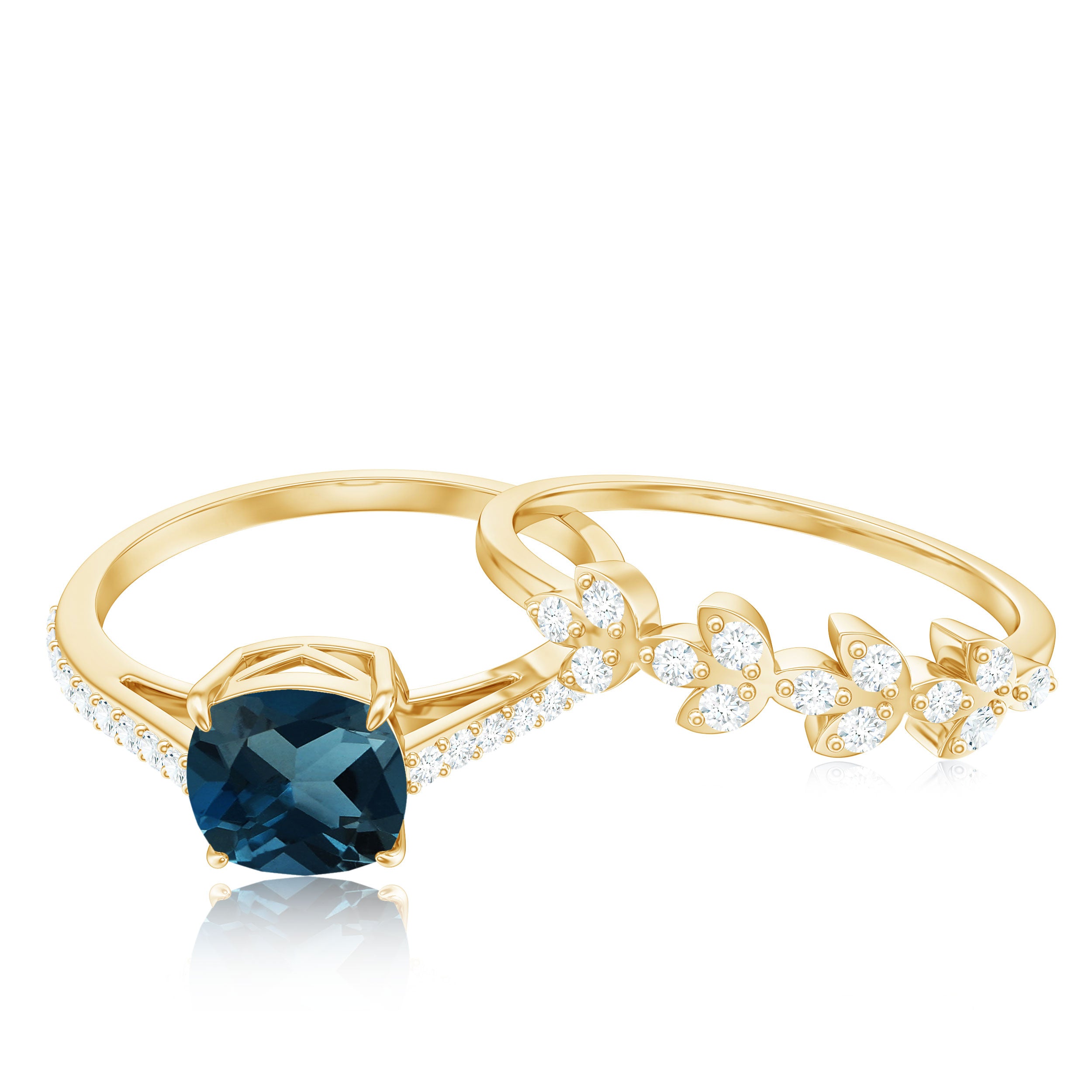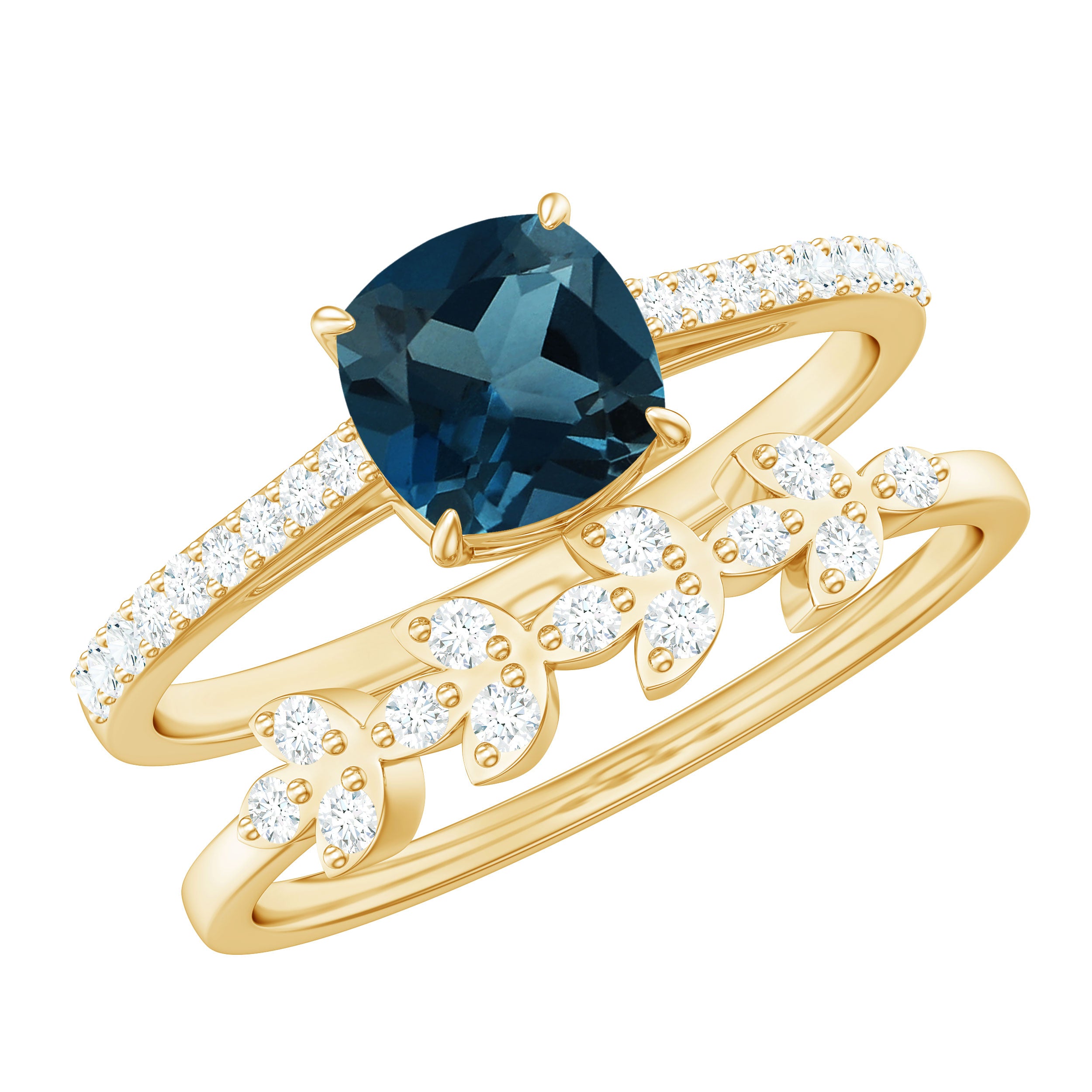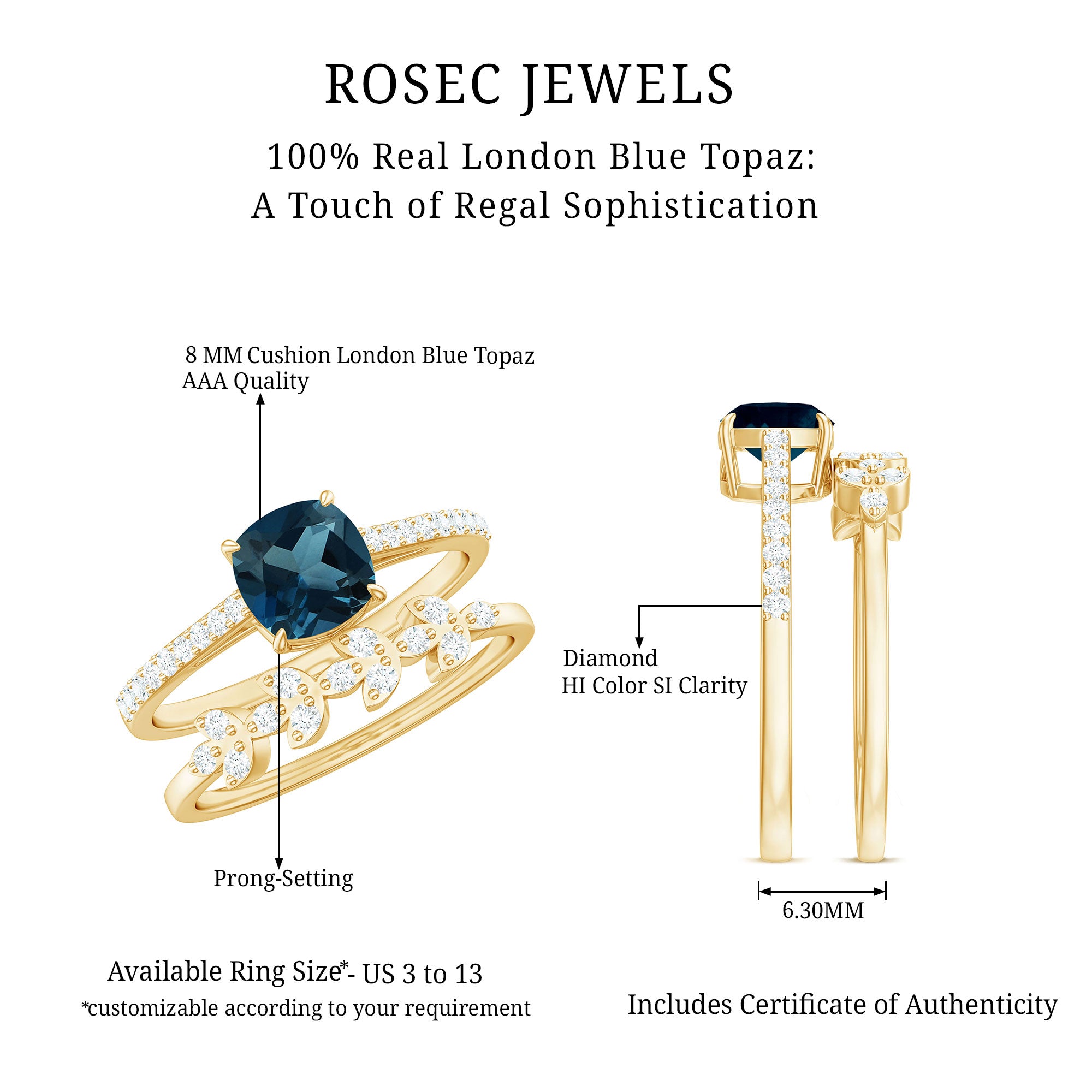 8mm Cushion Cut London Blue Topaz and Diamond Engagement Ring with Wedding Band
