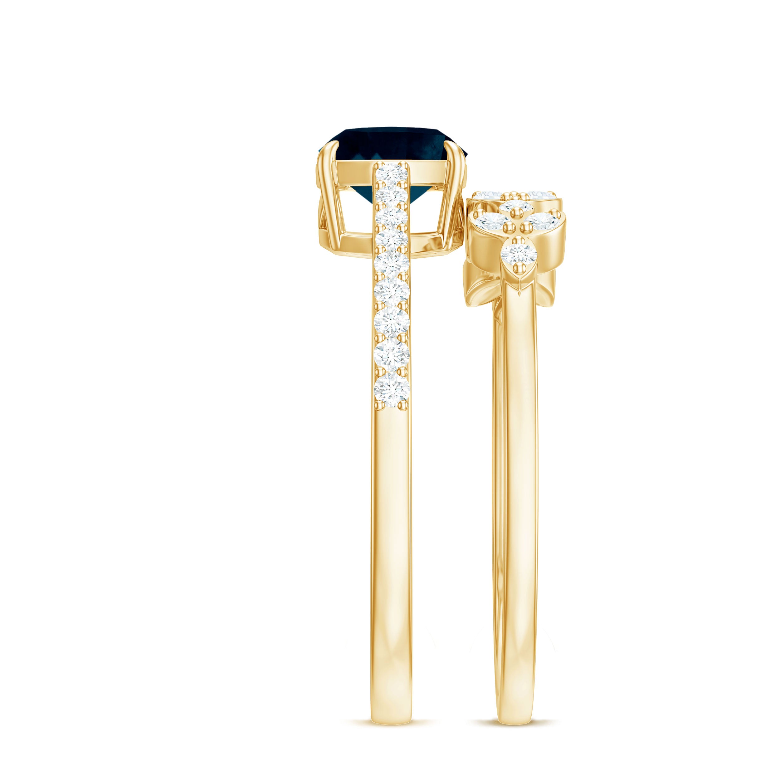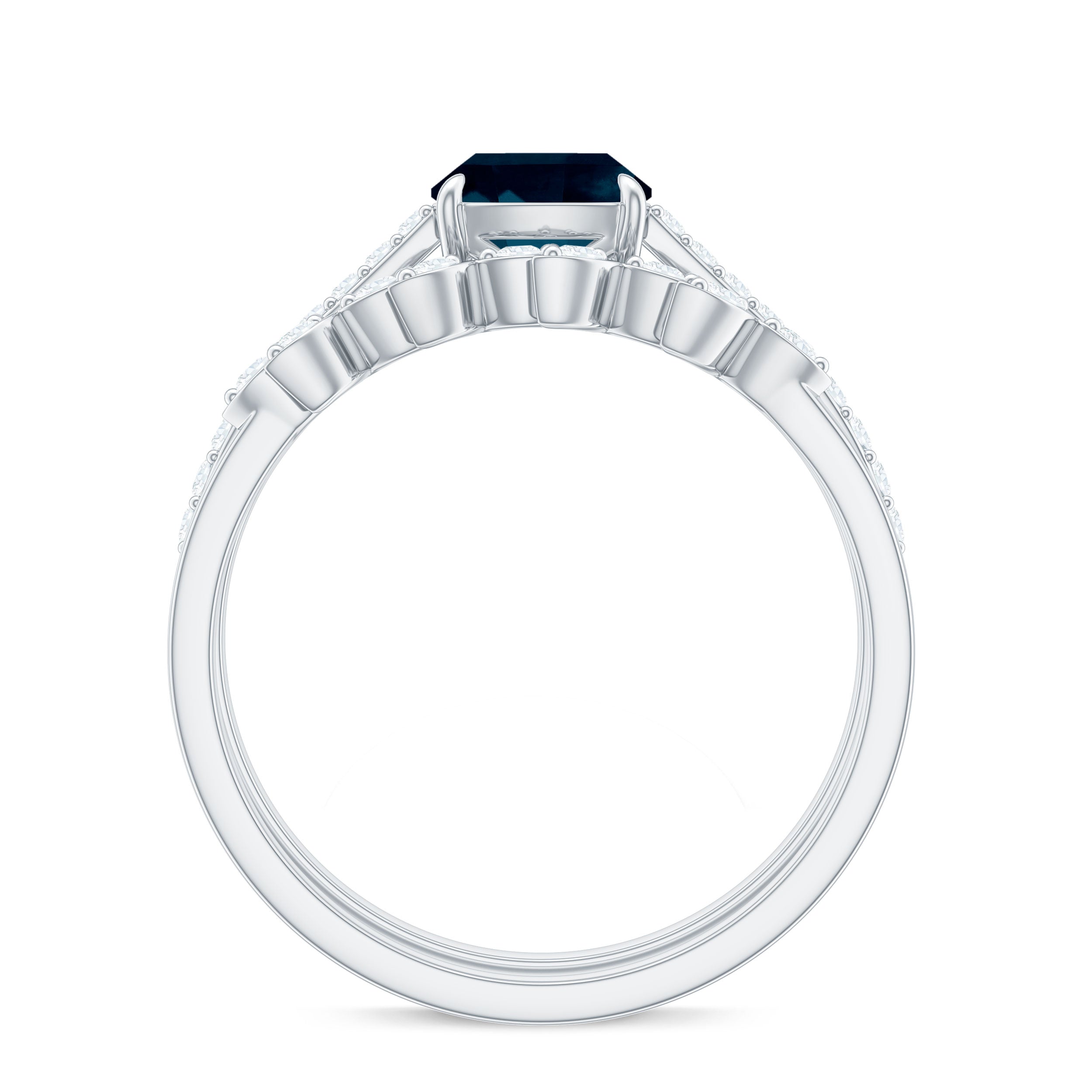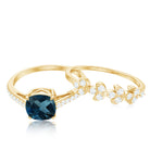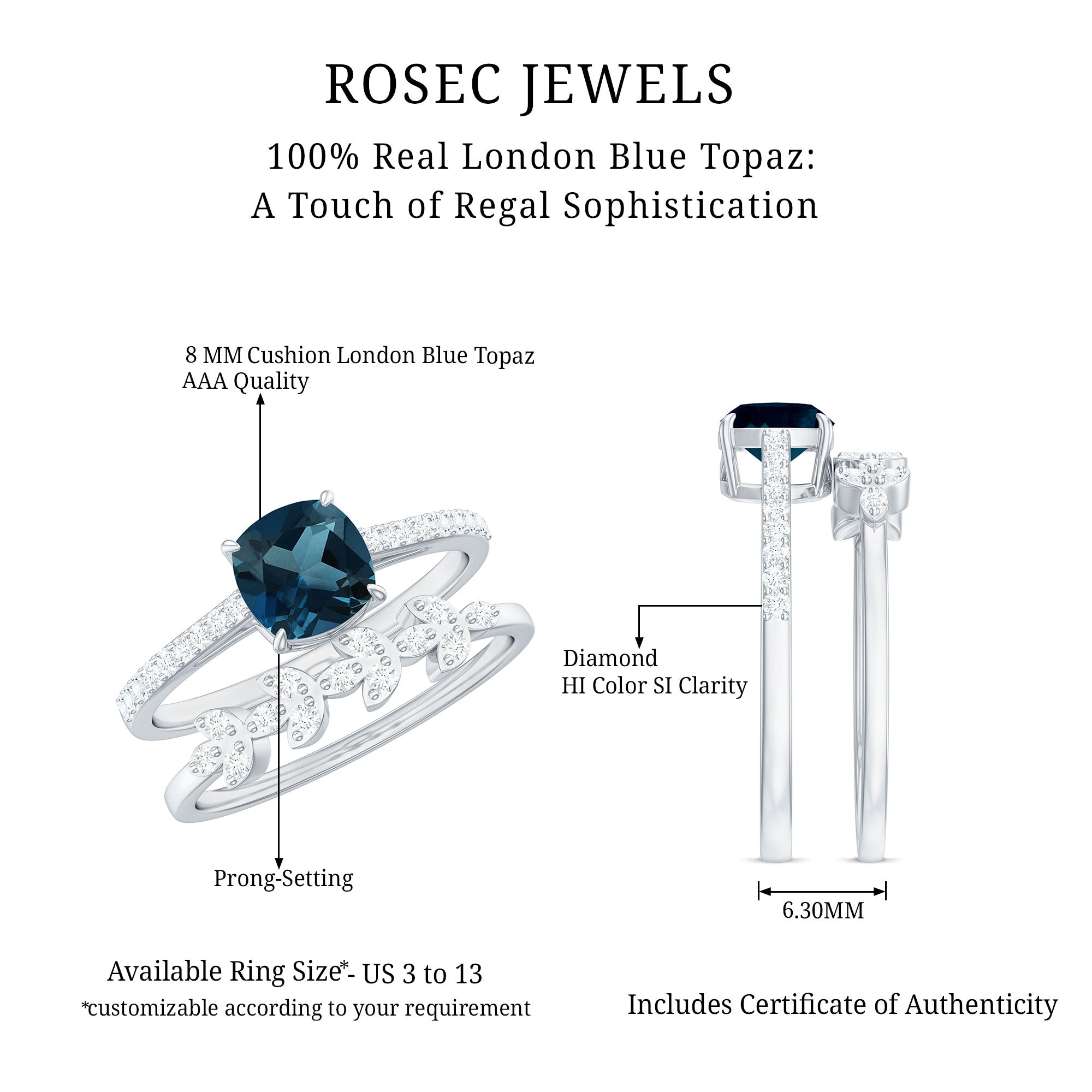 Share your love story with our timeless London Blue Topaz Ring Set, which beautifully combines nature-inspired elegance with classic style. This Blue Topaz Bridal Set is an ideal choice for those who appreciate both bold sophistication and meaningful craftsmanship. The Solitaire Wedding Ring Set features two meticulously designed rings: a traditional engagement ring and a wedding band adorned with a leaf motif. At the heart of the engagement ring lies an 8 MM cushion cut london blue topaz, securely held in a claw setting, while small, shimmering diamond side stones along the band provide a subtle touch of brilliance. The coordinating wedding band adds a romantic essence to the ensemble. Crafted with intricate leaf branch designs, each band is embellished with round cut diamond stones, forming a delicate pattern that encircles the finger. Both rings prioritize comfort, ensuring a smooth and secure fit for everyday wear. Whether worn together or separately, they create a stunning expression of love and unity. Ideal for engagements, anniversaries, or vow renewals, this Engagement Ring with Wedding Band Set serves as a meaningful way to commemorate a significant occasion. Presented in an elegant jewelry box, it is ready to be gifted or cherished as a lasting symbol of your devotion.