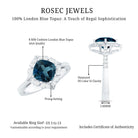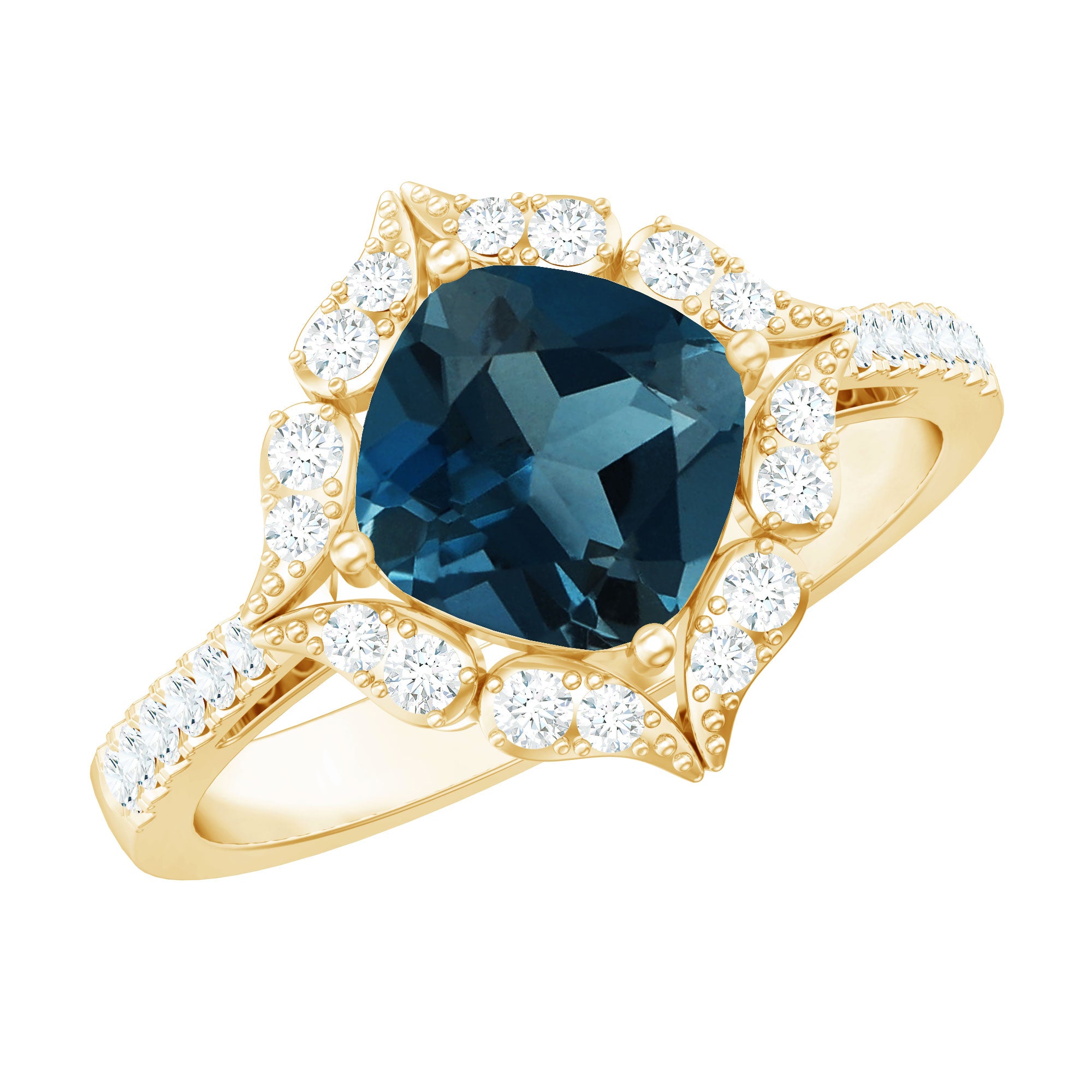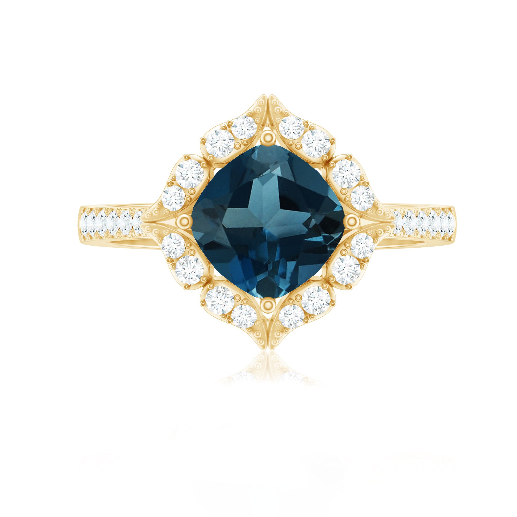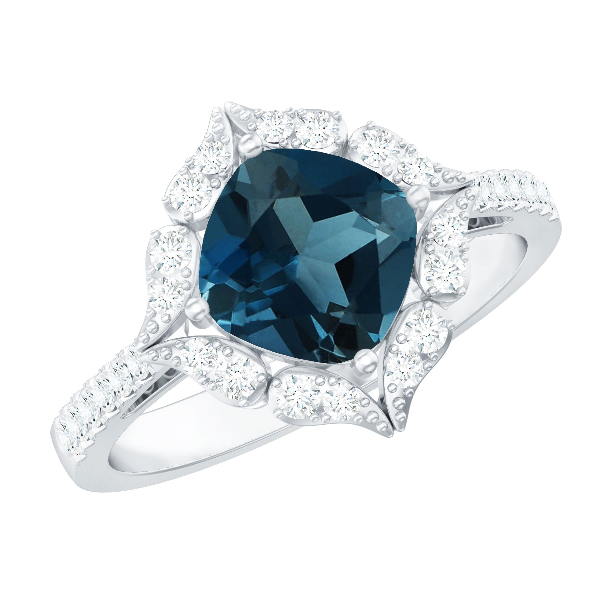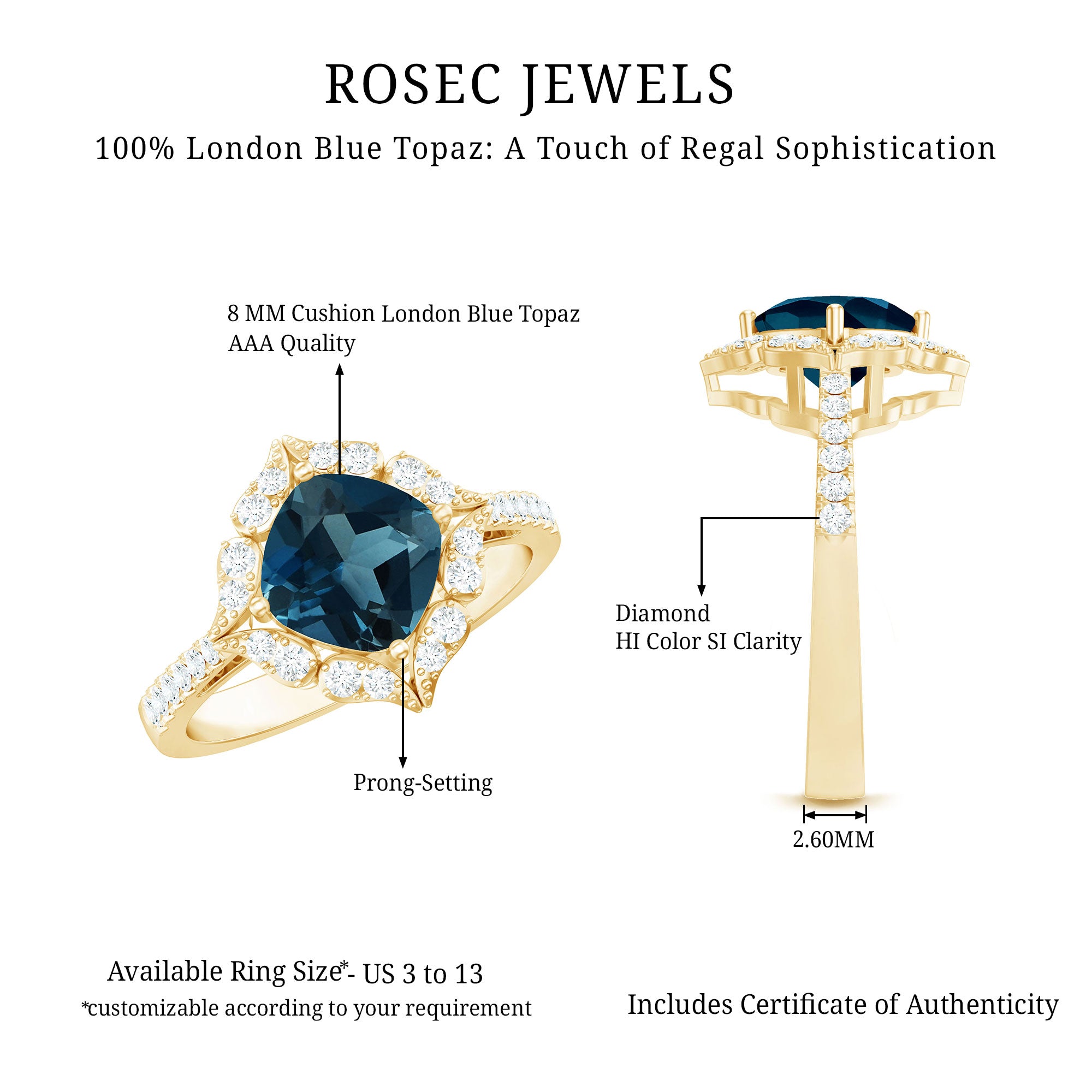 Timeless romance harmoniously merges with contemporary elegance in this Vintage Style Engagement Ring, meticulously crafted to honor love and treasured memories. At the core of this exquisite piece is a 8 MM cushion cut London Blue Topaz, celebrated for its dazzling brilliance and clarity. Set in a prong setting, the diamond is surrounded by a delicate halo of smaller stones, forming a floral-inspired design that imparts a hint of vintage allure and feminine elegance. This floral motif in the London Blue Topaz Engagement Ring not only elevates the overall aesthetic but also provides greater coverage on the finger, rendering it a flattering option for daily wear. Offered in a variety of precious metal choices, this Blue Topaz Halo Ring for Women caters to a diverse array of budgets and personal tastes. Whether commemorating a wedding, anniversary, birthday, or any significant event, this handcrafted Vintage London Blue Topaz Ring serves as a thoughtful and unforgettable gift. Expertly crafted by the skilled artisans at Rosec Jewels, it is a beautiful way to honor the remarkable woman in your life with a ring that fuses tradition, artistry, and contemporary values.