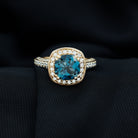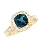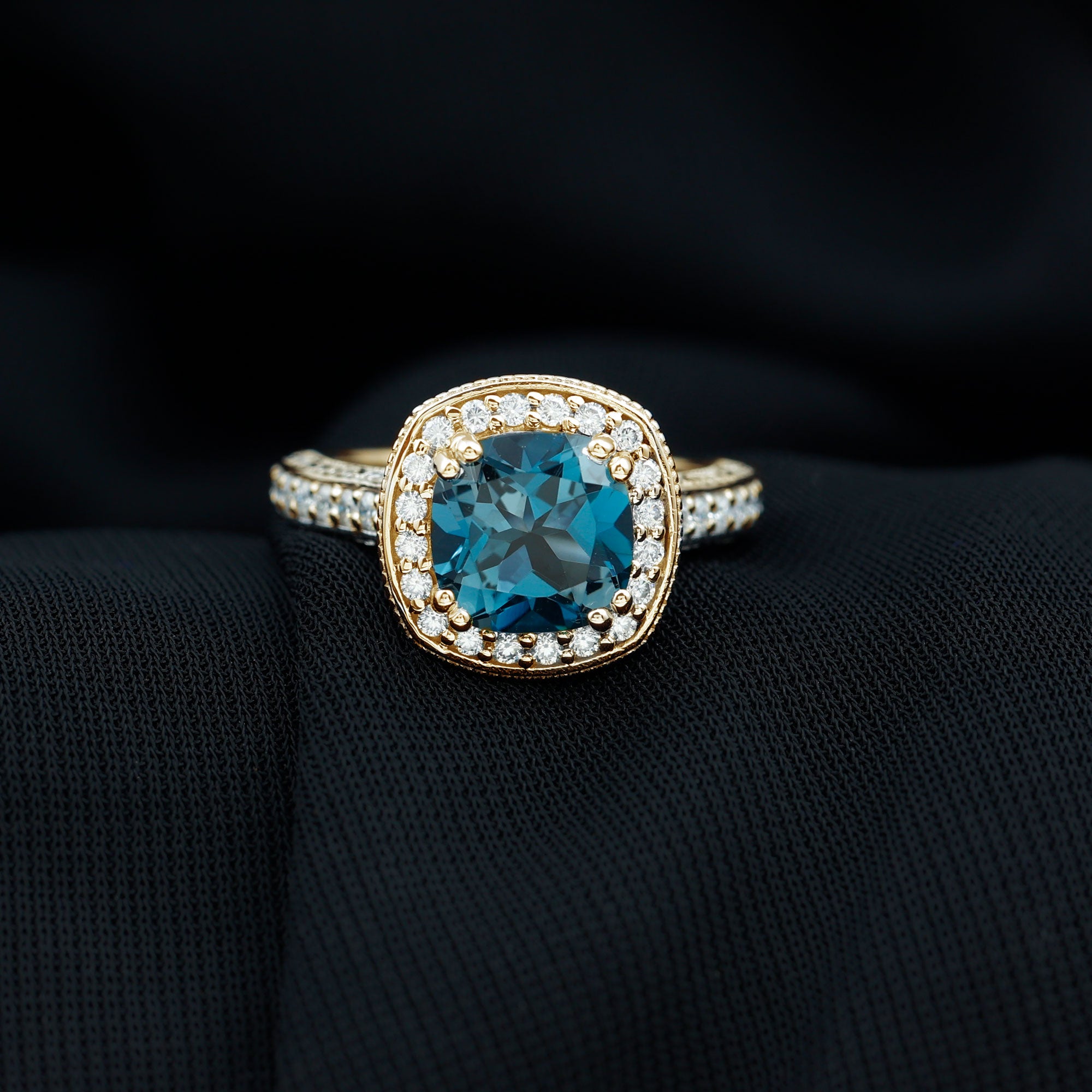 8mm Cushion Cut London Blue Topaz Vintage Inspired Ring with Diamond Halo