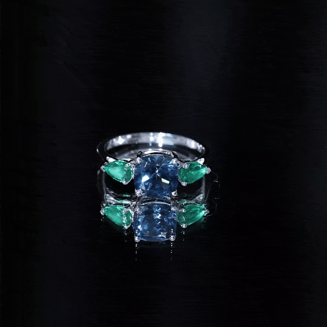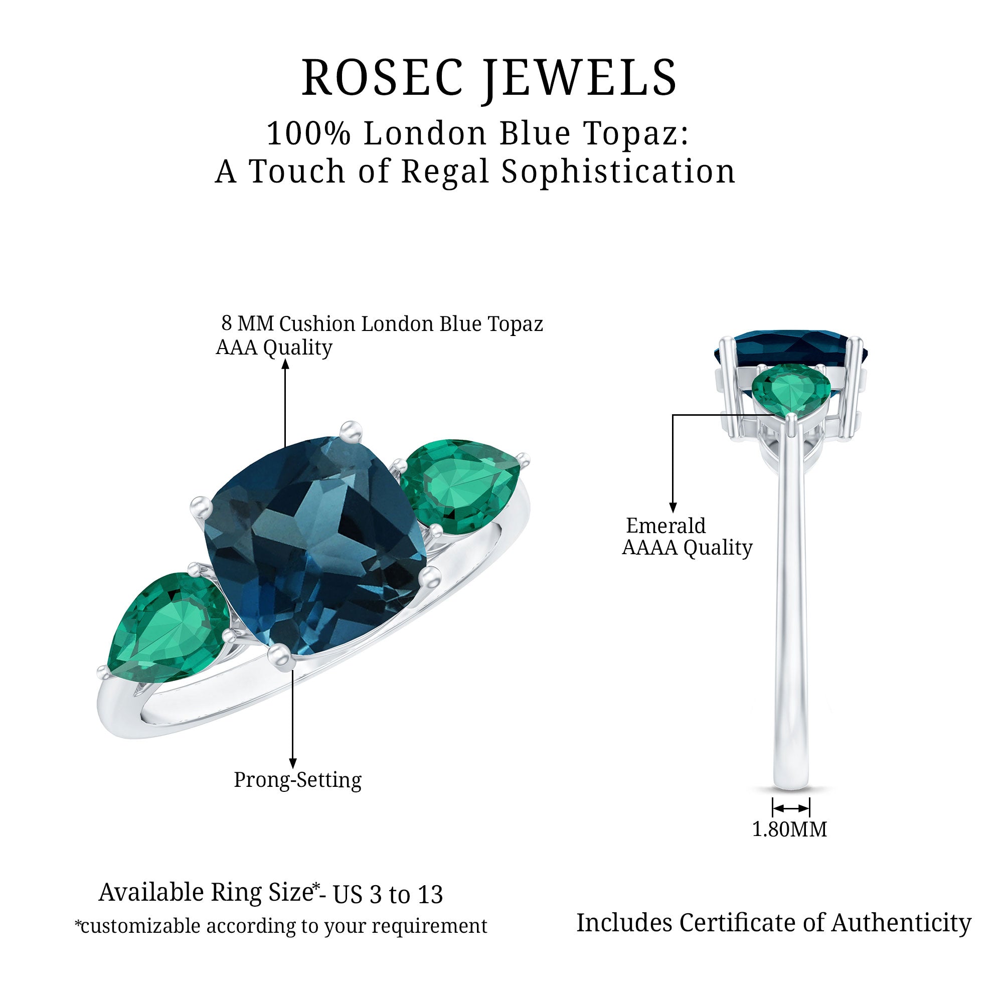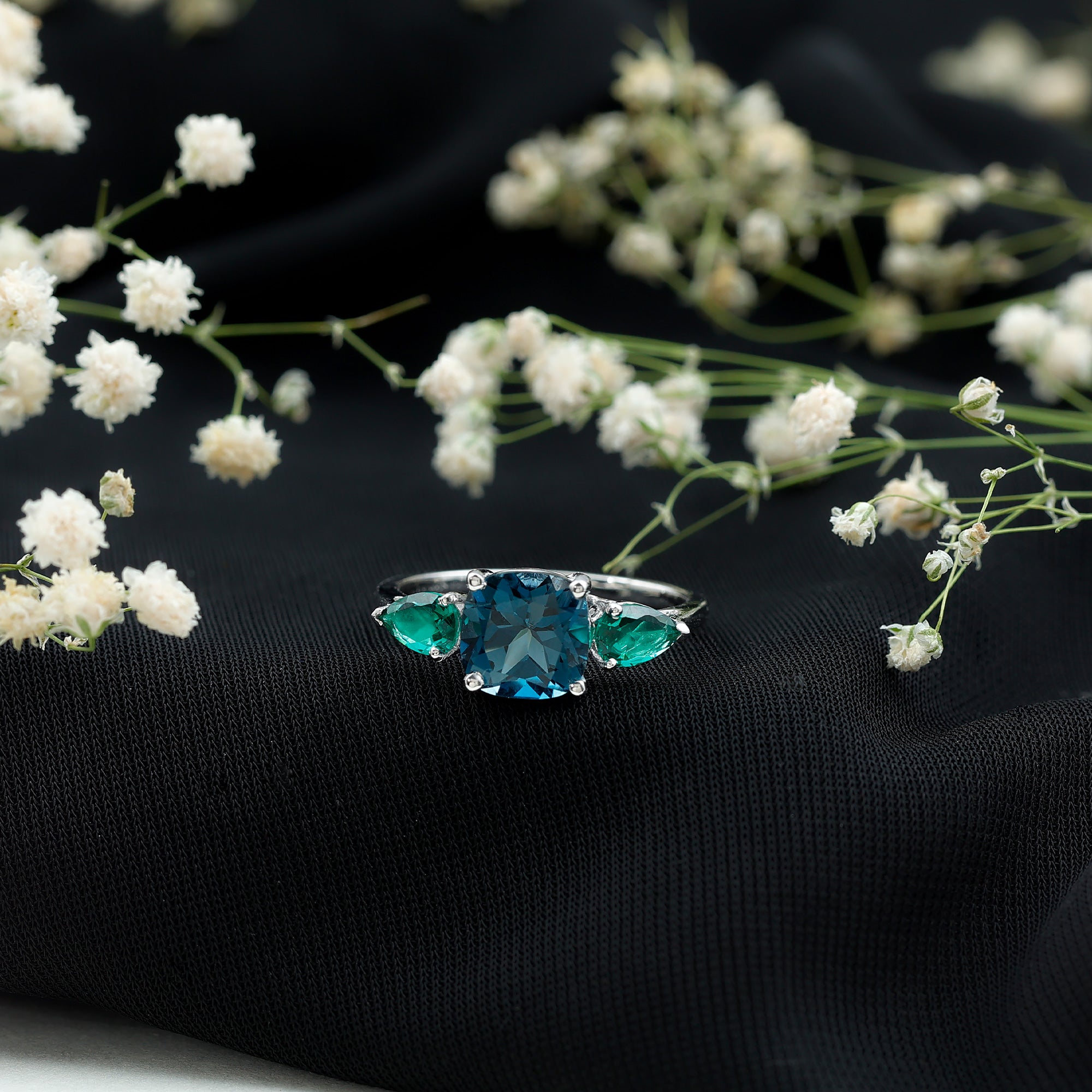 8mm Cushion Shape London Blue Topaz Three Stone Engagement Ring with Lab Emerald