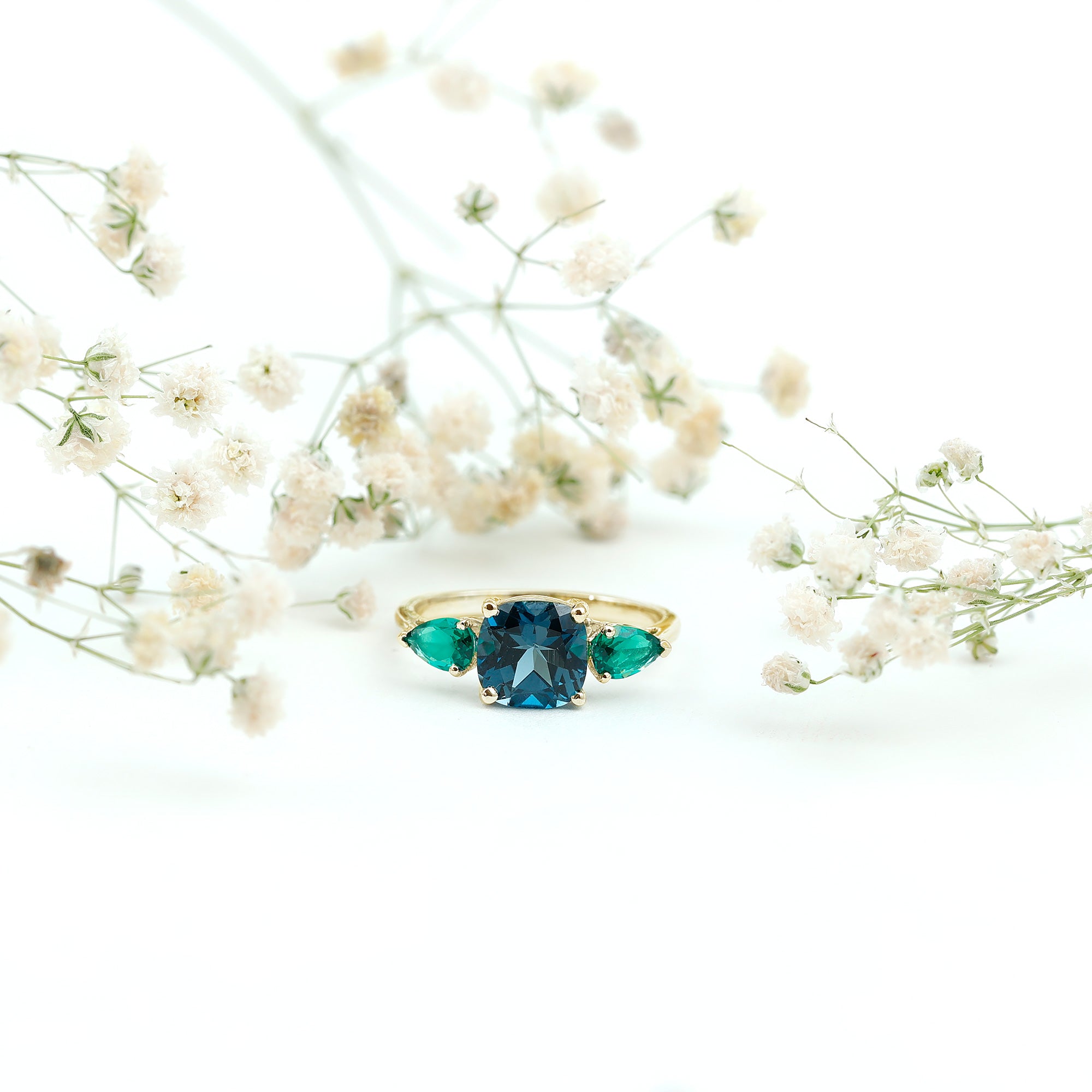 Commemorate the most significant moments in life with a ring that reflects your individual journey. This exquisite London Blue Topaz Engagement Ring is meticulously crafted to represent your past, present, and future together - a timeless homage to everlasting love. At the center of the Trilogy Engagement Ring is a dazzling 8 MM cushion shape London Blue Topaz, elegantly enhanced by two 4X6 MM pear shape Lab Created Emerald side stones. Collectively, these three stones symbolize the memories you have created, the love you experience today, and the future you are constructing together. Designed with a sleek and resilient band, this 3 Stone Engagement Ring harmonizes classic elegance with contemporary sophistication. Offered in a range of ring sizes, it ensures a perfect fit and enduring comfort - intended to be worn and treasured daily. Whether you are making a proposal, celebrating an anniversary, or simply honoring your relationship, this Past Present and Future Ring brings a significant sparkle to your love narrative. The brilliance of blue topaz and created emerald captures the essence of your most cherished moments, guaranteeing that the ring remains as luminous as your connection. Presented in a signature jewelry box, it is ready to be gifted or preserved as a beloved heirloom.