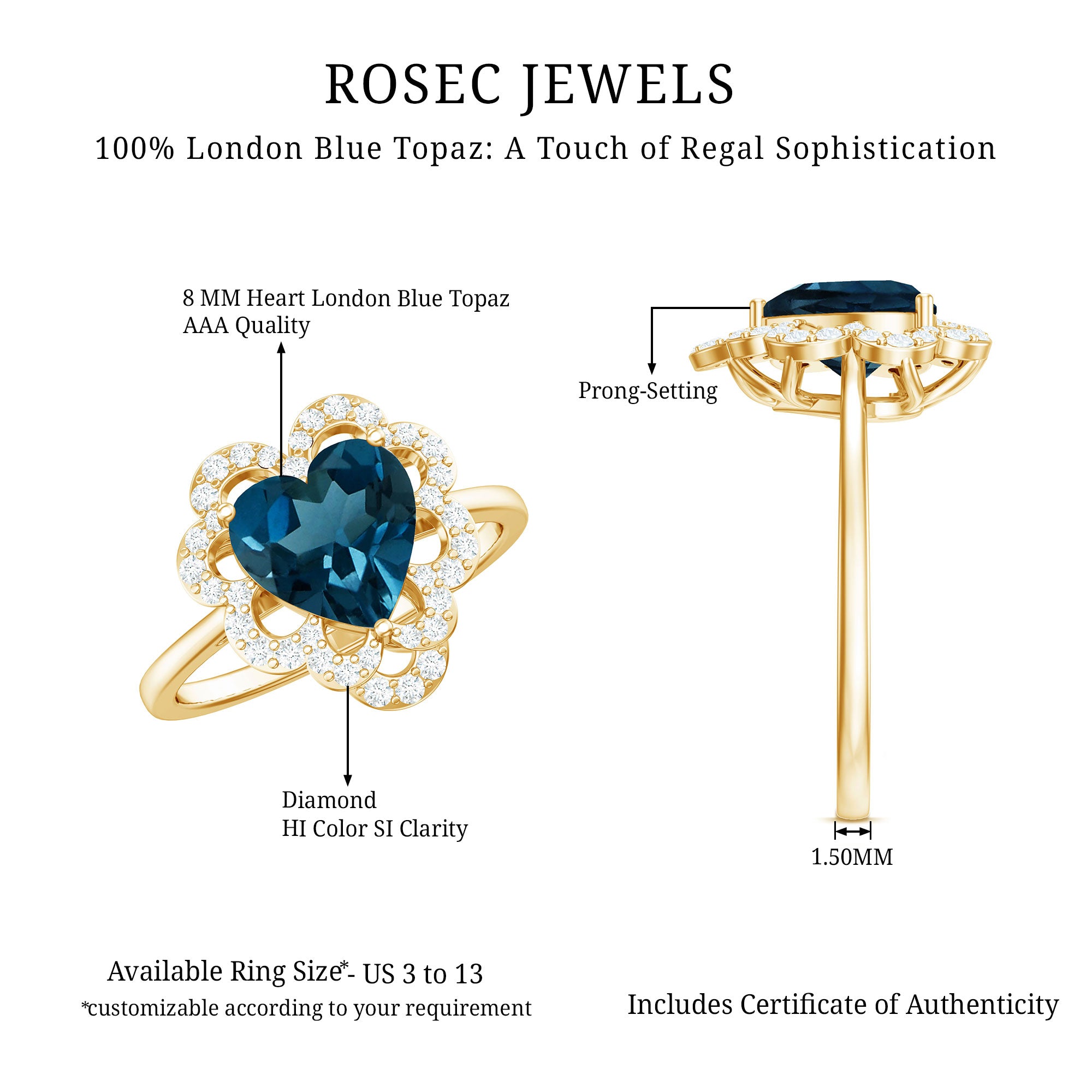 Express your feelings sincerely with this exquisite Heart Shaped Engagement Ring, crafted for unforgettable moments. At its core lies an 8 MM heart shaped London Blue Topaz, securely held in a prong setting. A dazzling diamond halo accentuating the central stone, providing the perfect touch of brilliance while preserving the topaz natural beauty. This London Blue Topaz and Diamond Engagement Ring is an ideal selection for someone who appreciates classic designs with a contemporary flair. Whether you are preparing to propose or simply wish to present her with a ring that conveys your deep affection, this London Blue Topaz Heart Ring offers a charming blend of beauty and significance. It is suitable for special occasions and enough to commemorate a significant occasion. The heart shape embodies love, commitment, and a shared future. Crafted with AAA quality london blue topaz and HI-SI quality diamonds, along with meticulous attention to detail, this Heart Engagement Ring transcends mere jewelry; it is a part of your narrative. It arrives beautifully packaged in a lovely jewelry box, ready for gifting or that memorable YES moment.