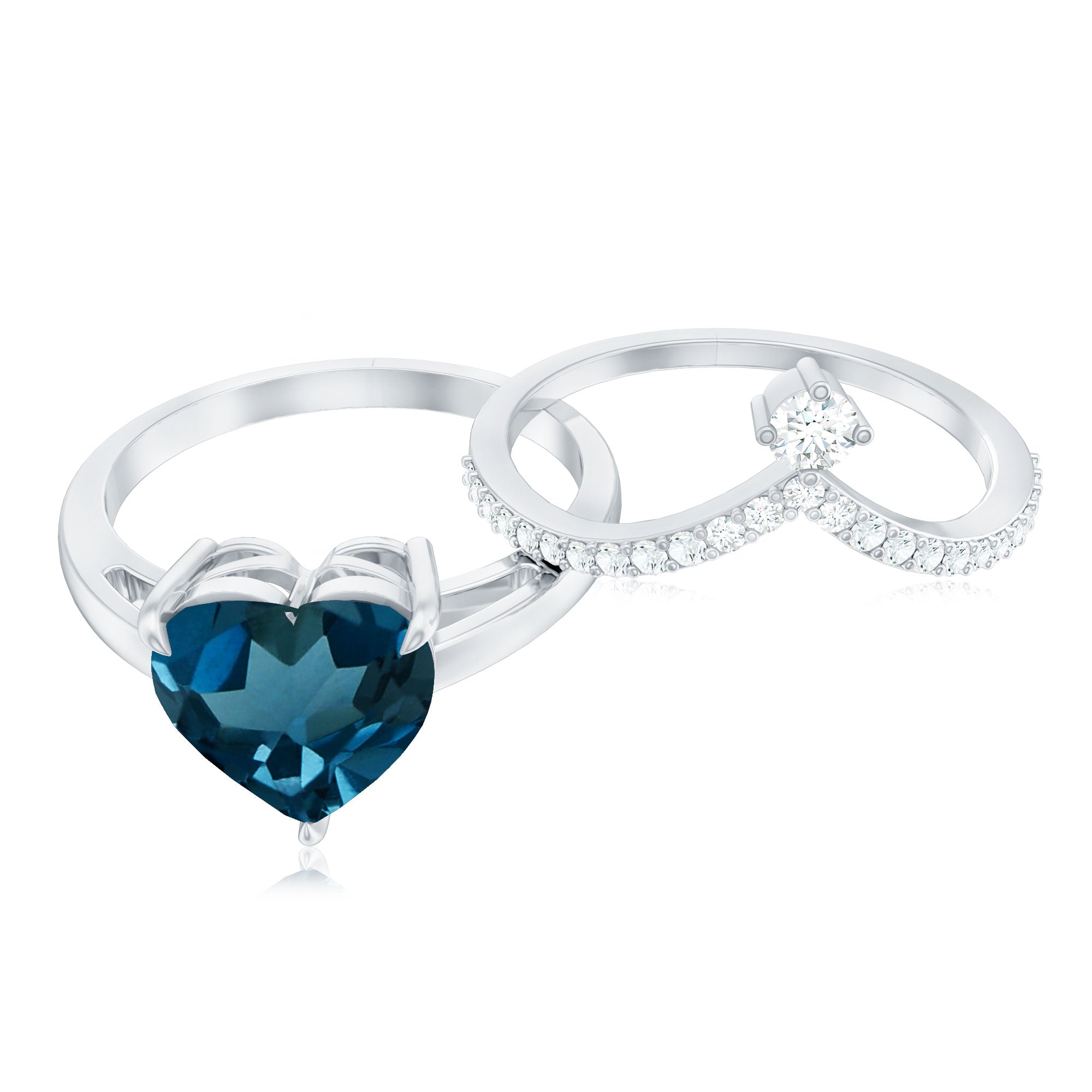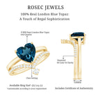 This exquisite Blue Topaz Bridal Ring Set is crafted to enchant hearts and commemorate commitment with its timeless allure and contemporary sophistication. The Solitaire Wedding Set features a radiant solitaire engagement ring that is perfectly complemented by a gracefully curved wedding band. At the heart of the engagement ring lies a stunning 8 MM heart-shaped london blue topaz, meticulously set in a secure claw setting to enhance its brilliance and fire, boasting an impressive AAA quality. The wedding band is designed to harmonize seamlessly with the engagement ring. Adorned with delicate round cut diamond stones, it gently curves to fit snugly against the heart-shaped ring, creating a breathtaking layered effect that amplifies the overall sparkle and elegance. Crafted with exceptional attention to detail and designed for comfort, this Heart Shaped Wedding Ring Set is ideal for those who appreciate a bold, stacked appearance as well as for those who prefer to wear each ring individually for a more subtle style. Crafted with attention to both comfort and aesthetics, this Engagement Ring with Wedding Band Set represents enduring love. Each time you adorn it, you will recall your distinctive love narrative. This set is ideal for those seeking a classic, intricately designed, and sophisticated ring that conveys a sense of individuality and significance.