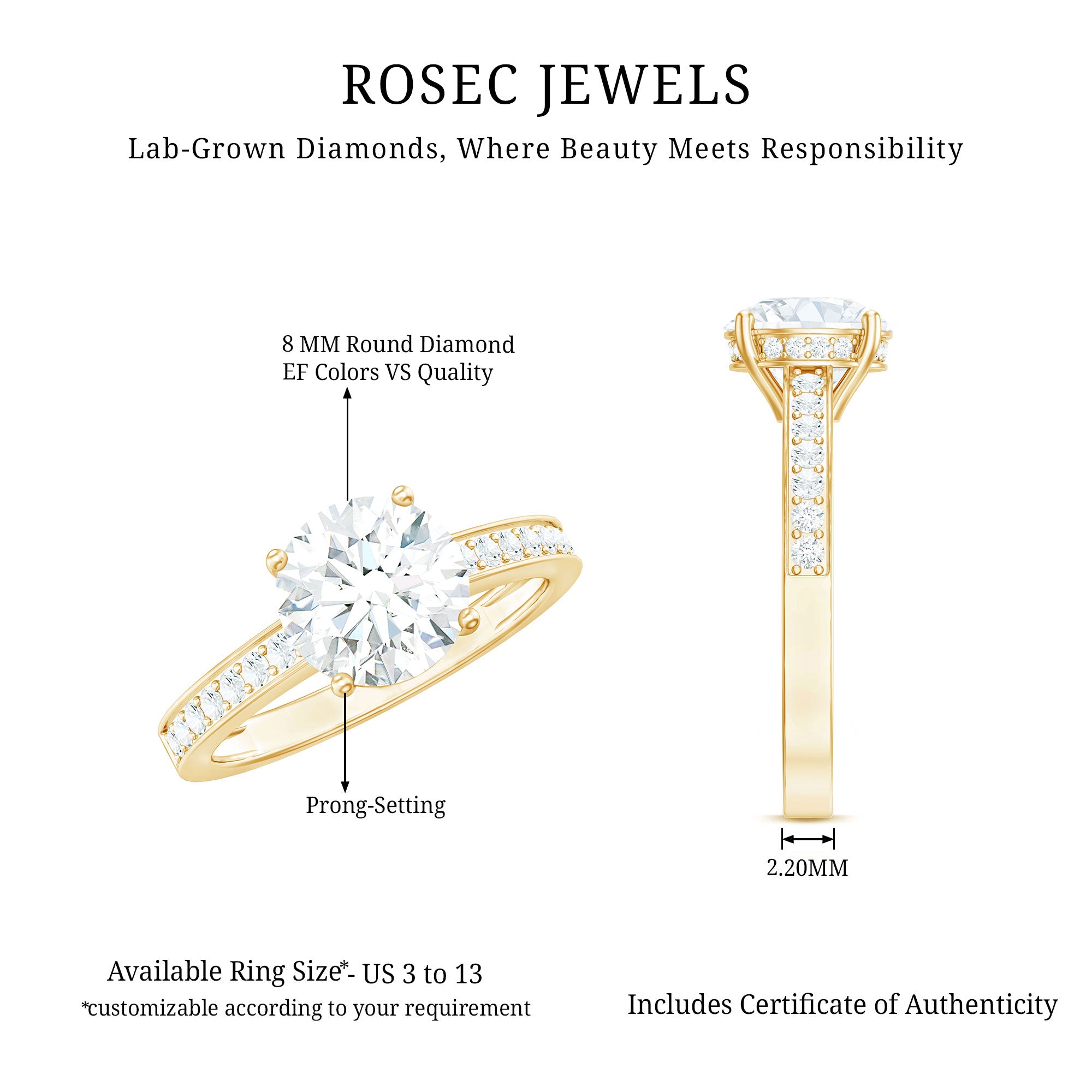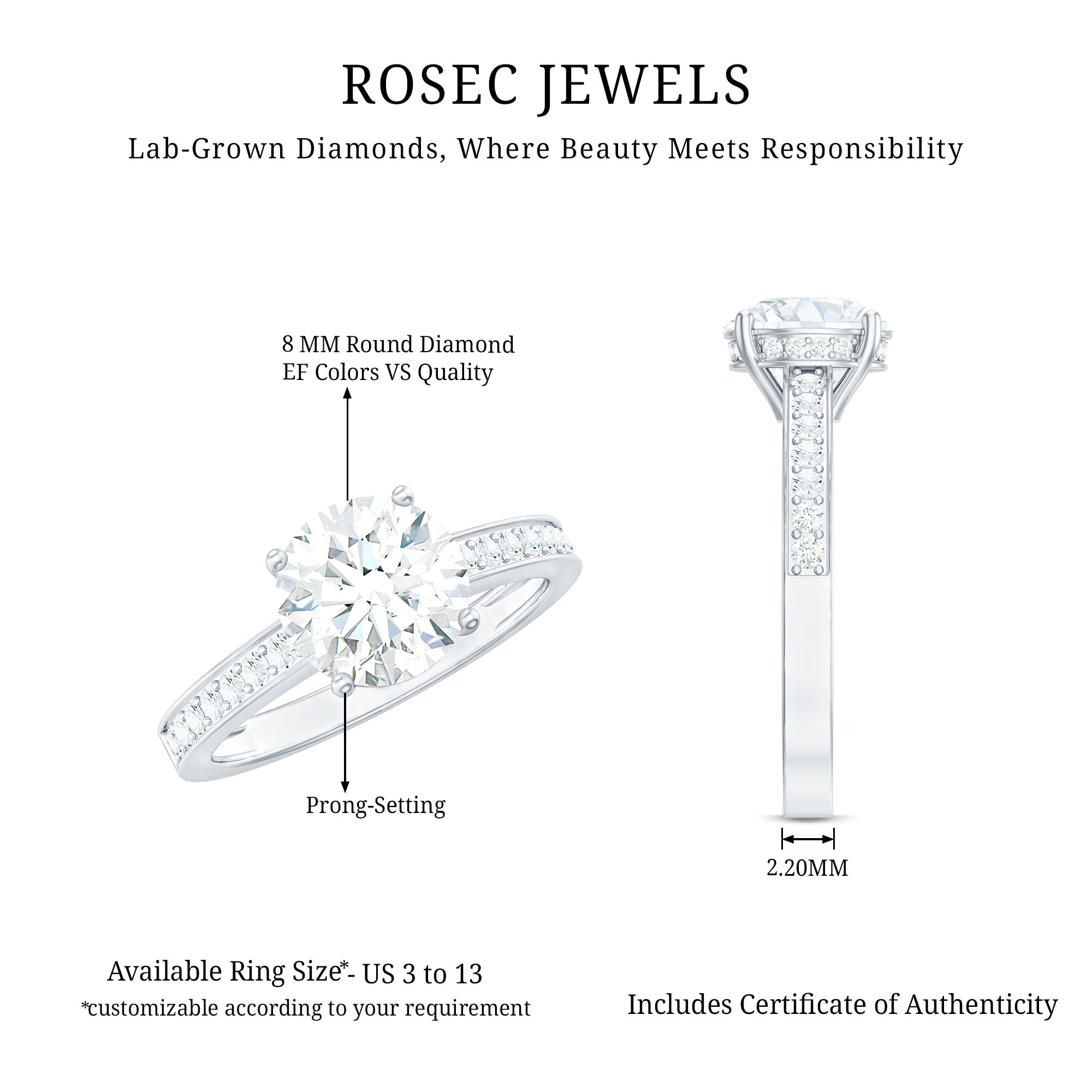 Make your special lady feel loved with our beautiful Lab Grown Diamond Engagement Ring on her special day. Its elegant yet simple design highlights the center gemstone perfectly. This classic Round Engagement Ring features an EF-VS quality lab diamond, guaranteeing the fire and brilliance that symbolize love and commitment. At its center is an 8 MM round brilliant cut lab grown diamond, complemented by a hidden halo beneath the main stone for an extra surprise. The dazzling round cut side stones on the Solitaire Diamond Engagement Ring create a striking and captivating appearance, reflecting your individual style and personality. This Hidden Halo Engagement Ring boasts a timeless and brilliant shape that captures all the attention. It seamlessly combines classic beauty with a modern touch, offering an elegant look that shines with stunning brilliance. This Diamond Solitaire Ring is available in various sizes, ensuring a perfect fit that feels custom-made for you. Every detail of this 2 Carat Diamond Ring for Women showcases precision, passion, and a touch of magic that only true craftsmanship can deliver. Let your fingers tell your story and allow your love to shine with a brilliance that is as special as your bond.