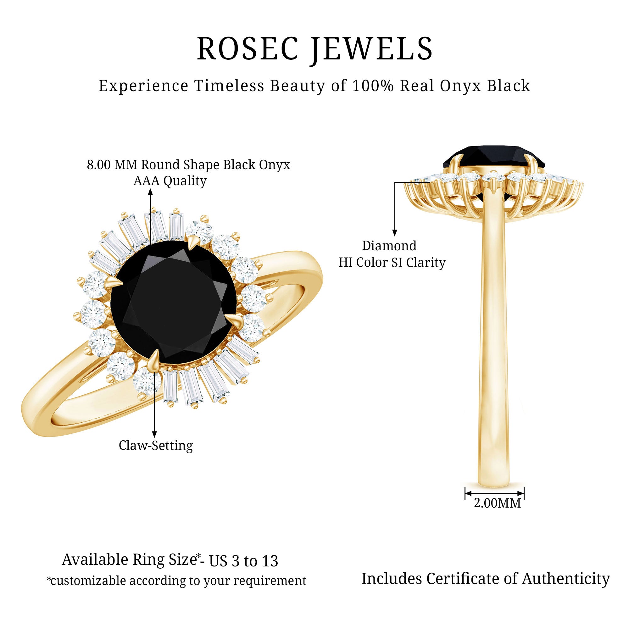 Experience the enchantment of vintage romance with this stunning Cocktail Ring, crafted to captivate with its timeless allure and exceptional artistry. At the core of the design is a remarkable 8 MM Round shape Black Onyx, celebrated for its extraordinary fire and brilliance. Surrounding the central stone is a magnificent halo of baguette and round Diamond stones, producing a dazzling display of sparkle that evokes the glamour of the Art Deco era. The interplay of shapes enhances the visual appeal of this Black Onyx Engagement Ring, infusing it with a seamless fusion of vintage elegance and contemporary brilliance. This Halo Engagement Ring is perfect for individuals who value intricate craftsmanship and a classic design with a modern twist. Whether it serves as a token of a lifelong commitment or is treasured as a future family heirloom, its beauty is both striking and timeless. Meticulously crafted for a refined and comfortable fit, this Real Black Onyx Ring is ideal for both daily wear and significant celebrations.
