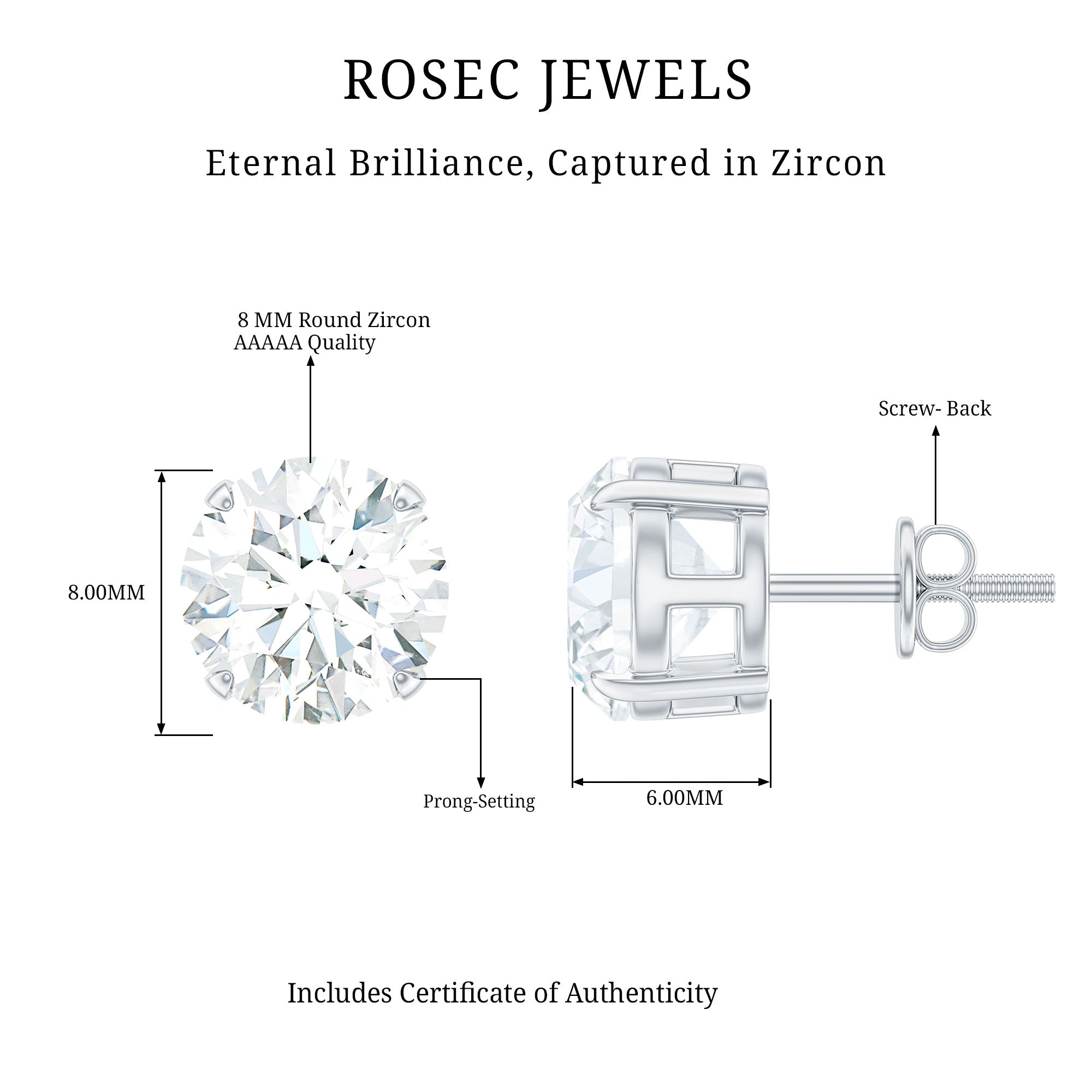 These CZ Stud Earrings exude effortless elegance, adding just the right touch of sophistication. Made from white gold plated silver, these Everyday Stud Earrings showcase a unique style that fits seamlessly into your daily accessory collection. This sparkling pair highlights the fire and brilliance of AAAAA quality cubic zirconia with a classic touch. The timeless design features 8 MM round shape Simulated Diamonds set in a claw setting. Renowned for their dazzling shine, these Cubic Zirconia Earrings come with a Screwback closure to ensure they stay secure throughout the day, making them a fantastic choice for fashion lovers. These CZ Diamond Studs offer a sophisticated and elegant appearance, adding a hint of glamor to any outfit. As a versatile and timeless accessory, they emphasize the sparkle and brilliance at their finest.