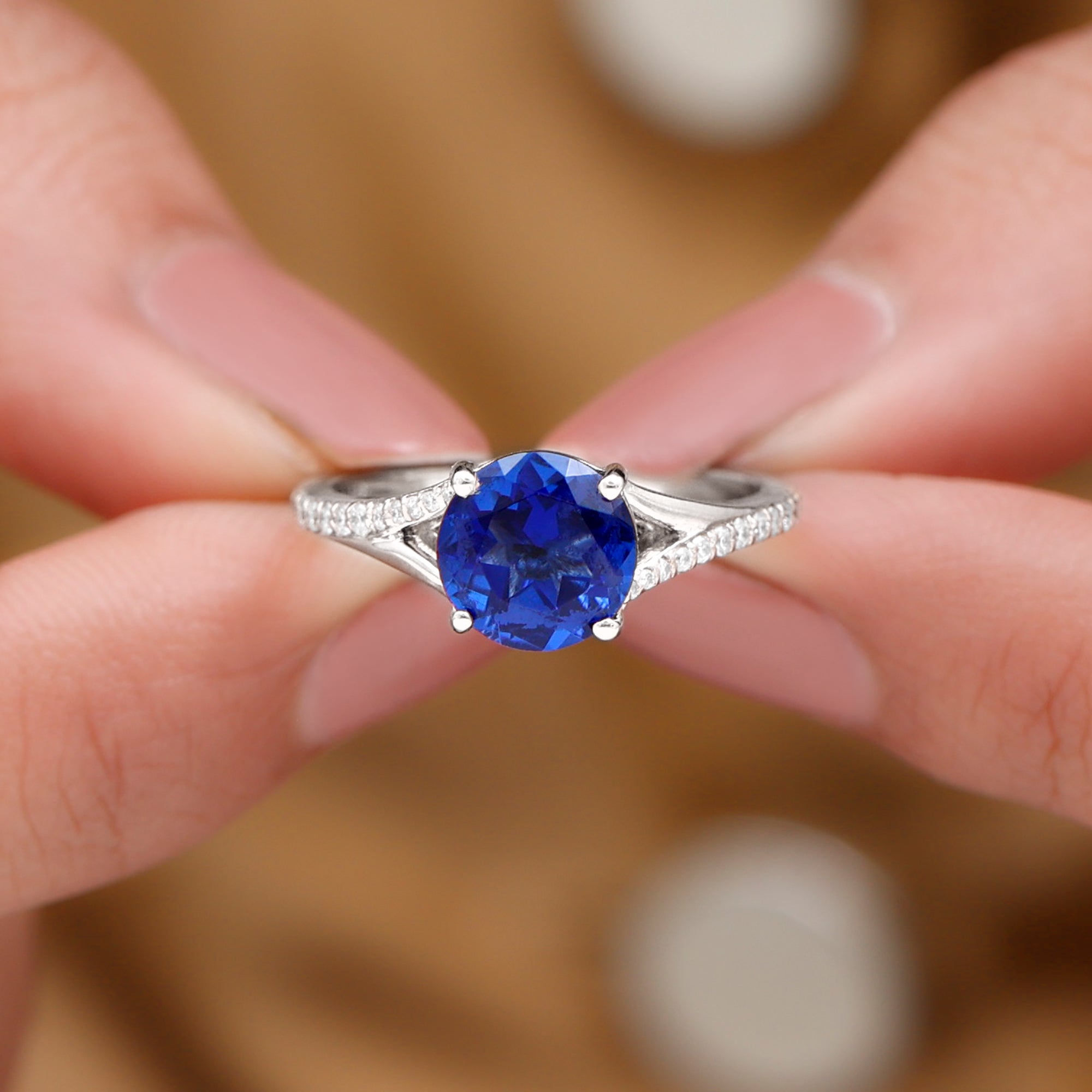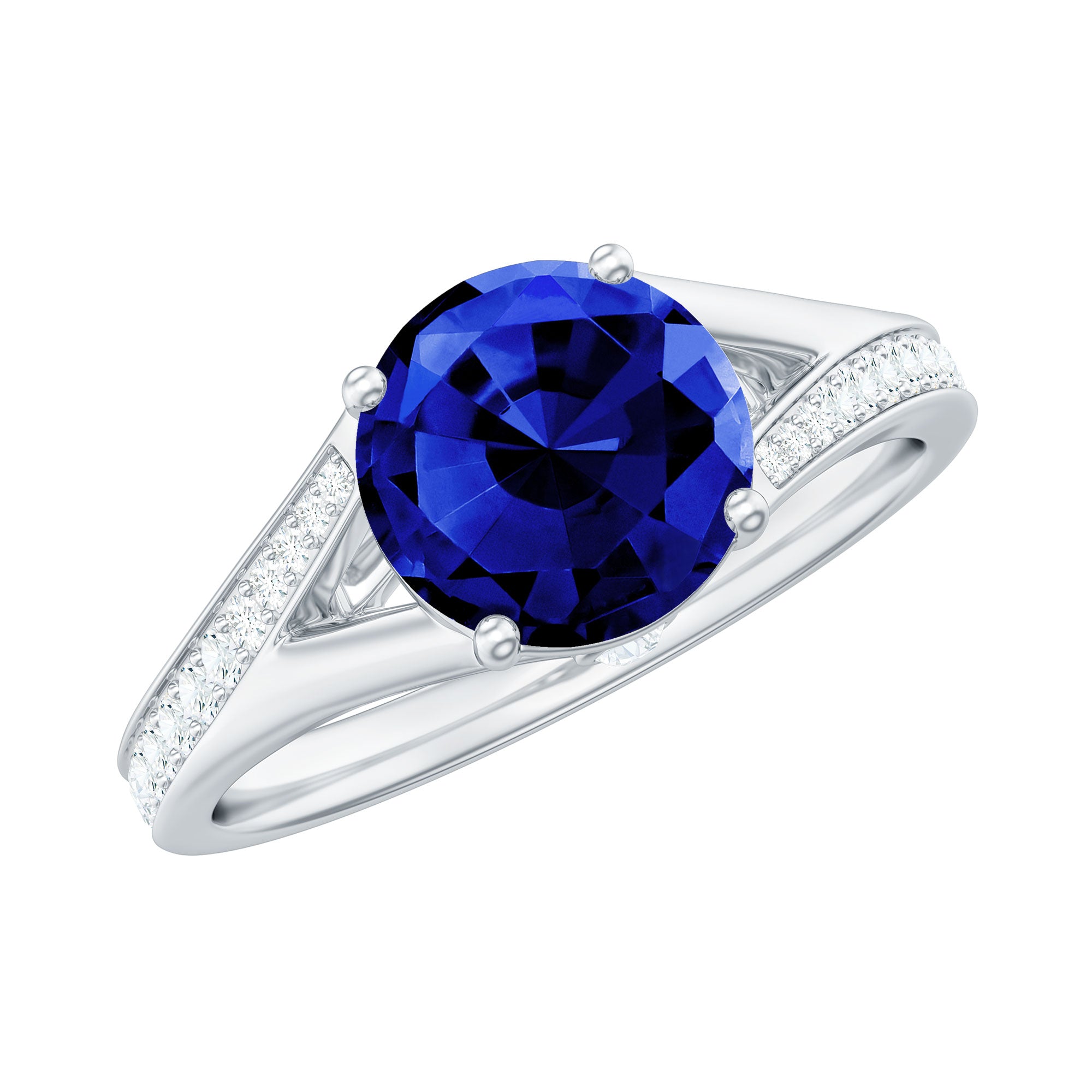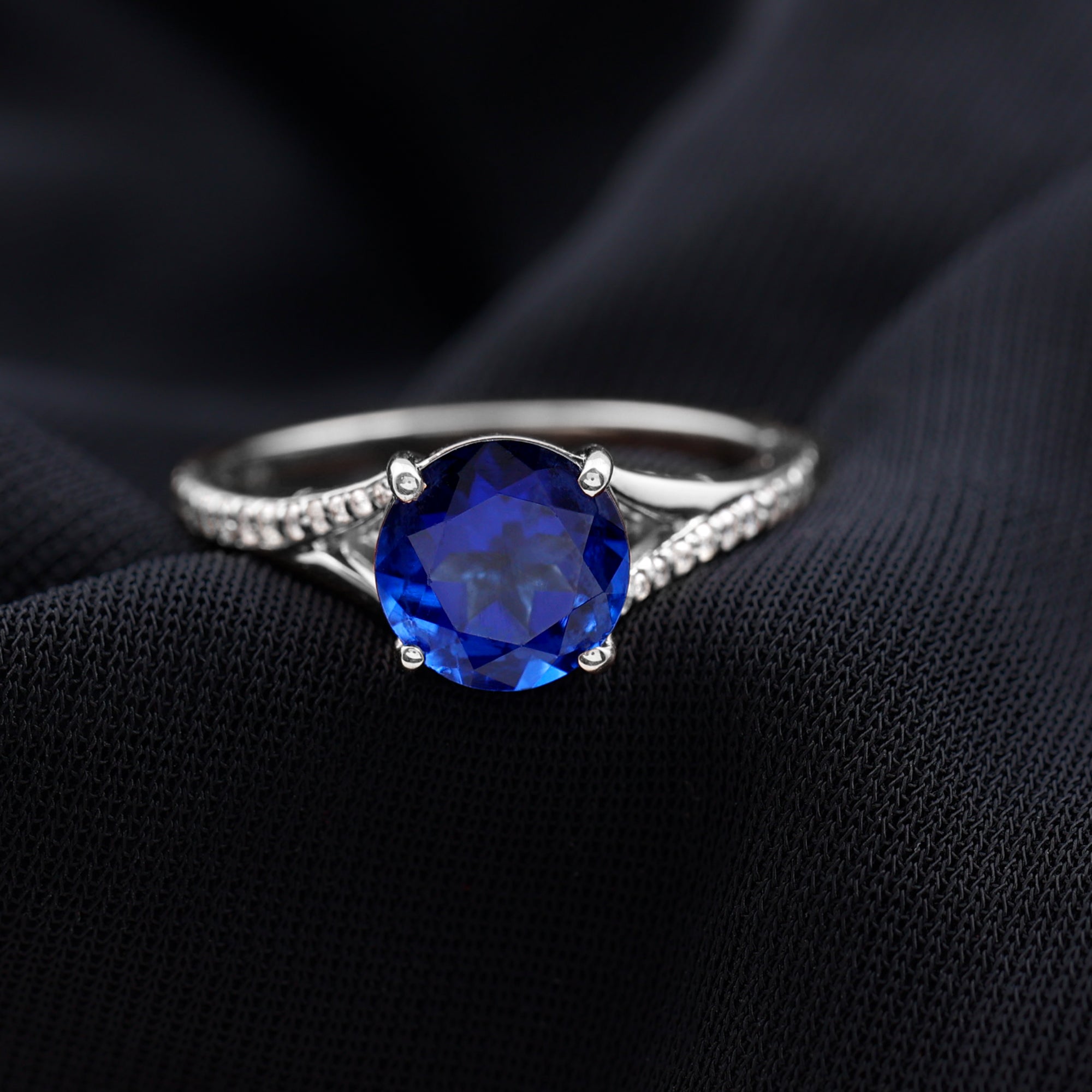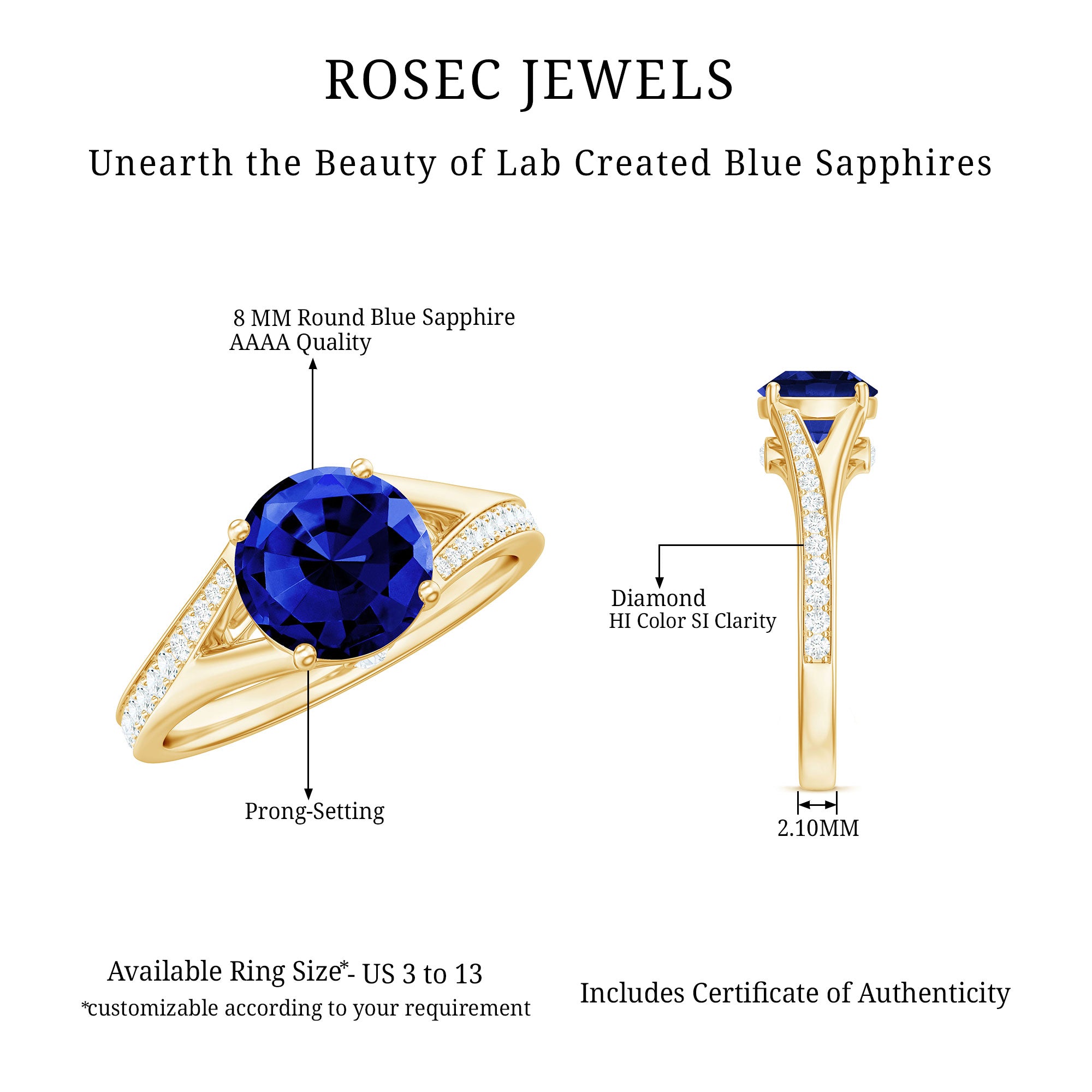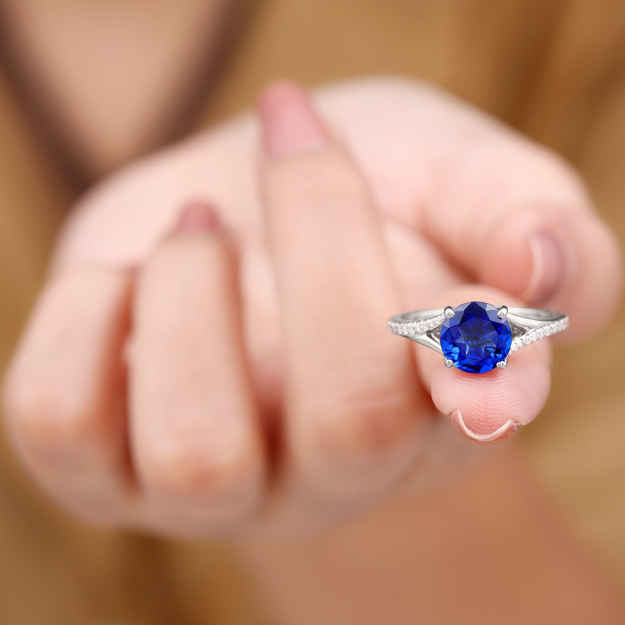 8mm Round Lab Grown Blue Sapphire Engagement Ring with Diamond Split Shank