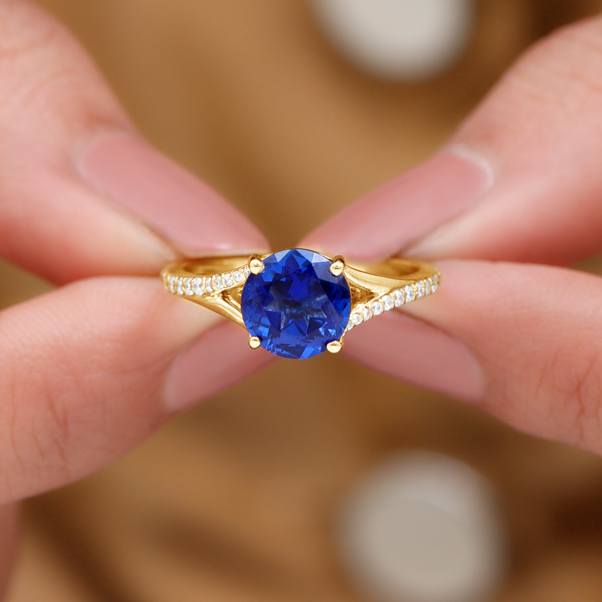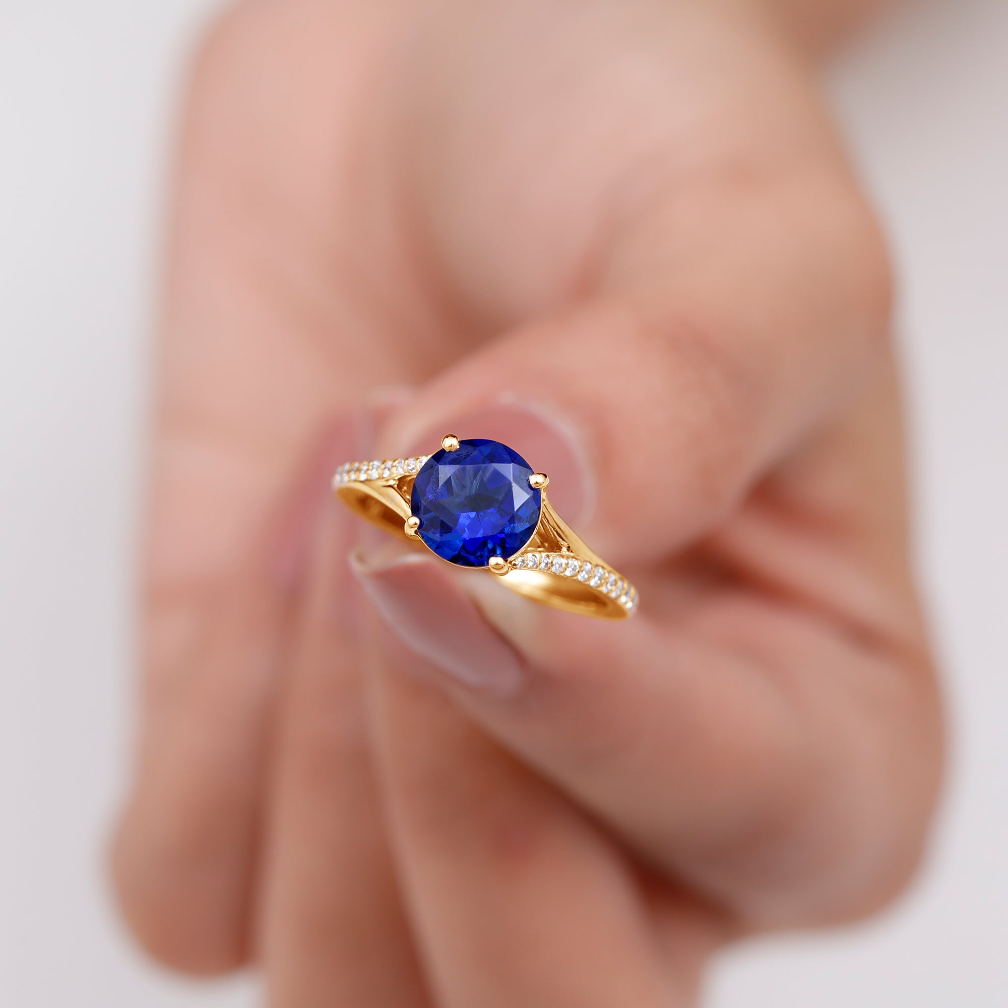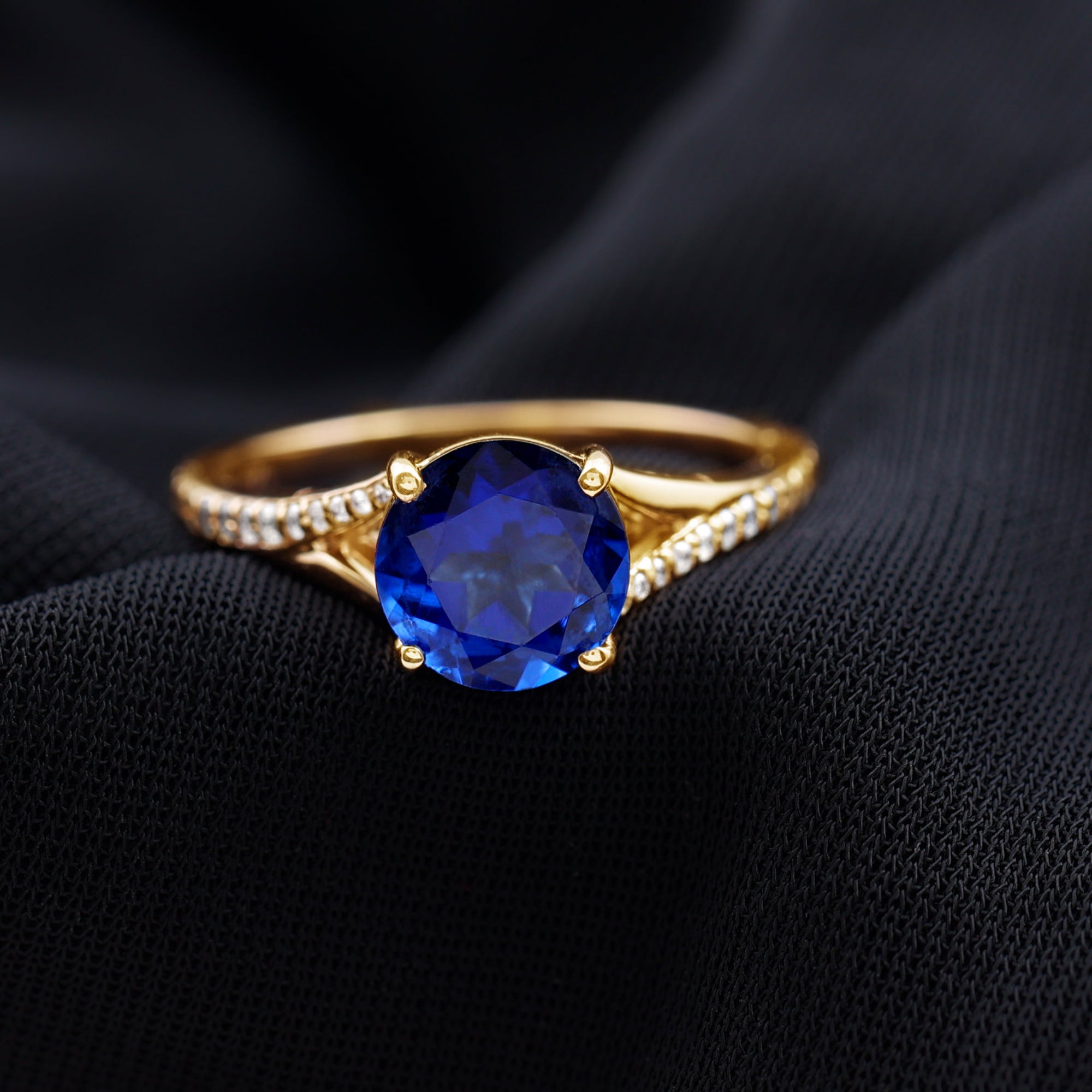 Our one-of-a-kind Lab Grown Sapphire Engagement Ring is designed to make a statement - it is bold, bright, and full of charm. With its royal blue sparkle and timeless design, this Solitaire Engagement Ring is the type of jewelry that leaves a memorable impression. Featuring a 8 MM round shape lab created blue sapphire elegantly set in secure prong setting. The split shank band adds a stylish touch to the design, giving it a modern yet sophisticated vibe, adorned with sparkling tiny round shape diamonds. Every aspect of this Round Engagement Ring is thoughtfully curated to celebrate a love that is strong, warm, and everlasting. Whether it is worn as an engagement ring or presented as a meaningful gift to someone who appreciates modern jewelry, this piece elevates the beauty of every occasion. This Split Shank Engagement Ring comes with a certificate of authenticity for the gemstones and is delivered in a high-quality signature jewelry box. Being an alternate September Birthstone Ring, it could be an ideal gift for Virgo zodiac people.