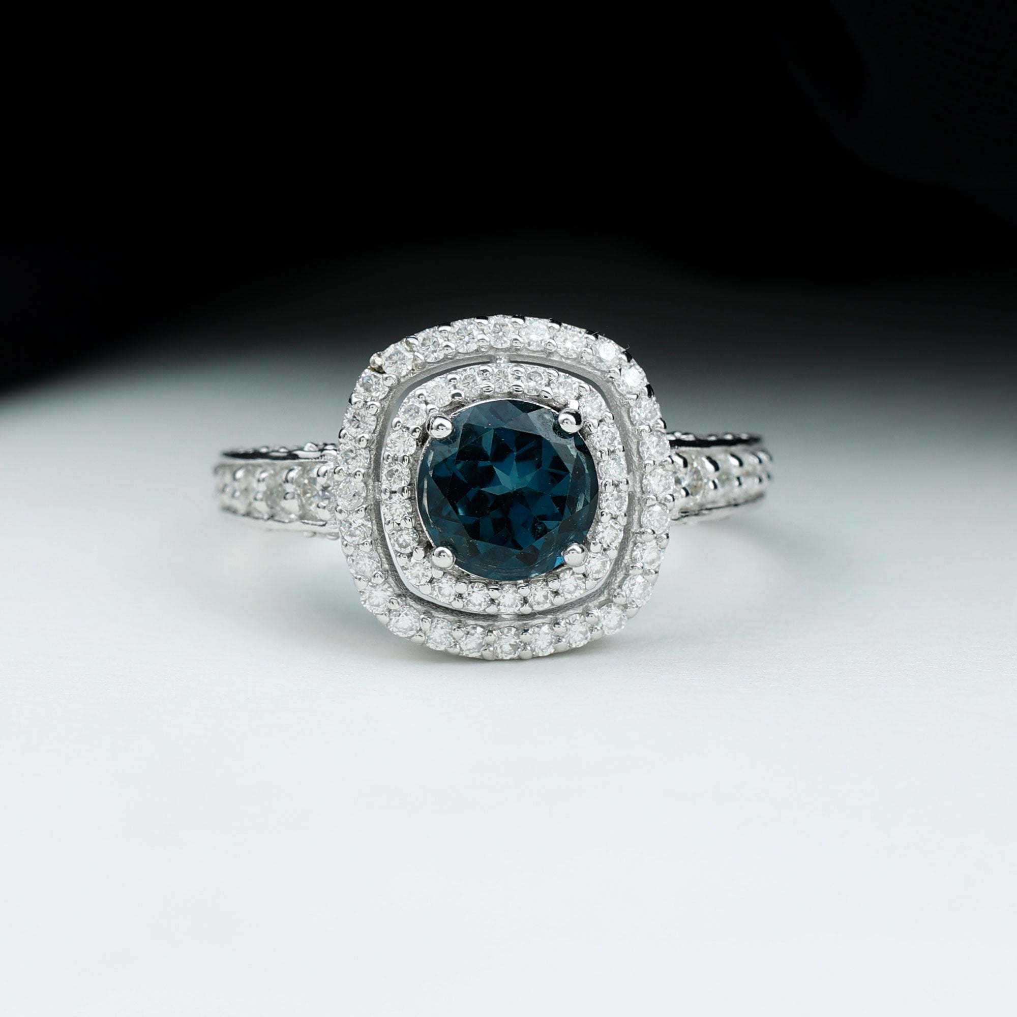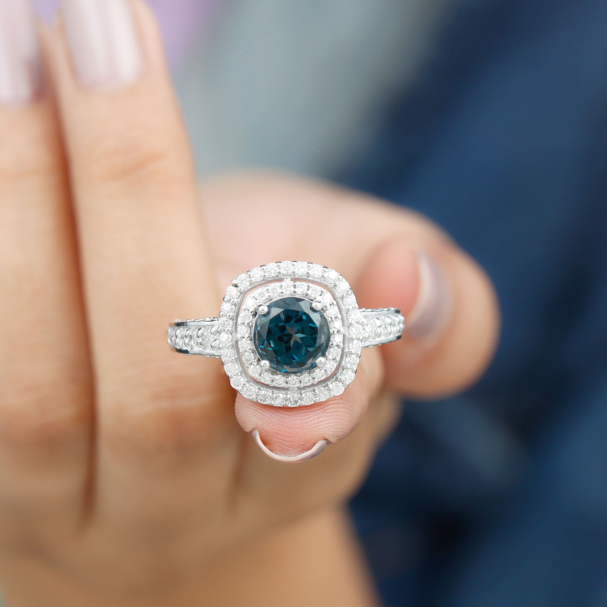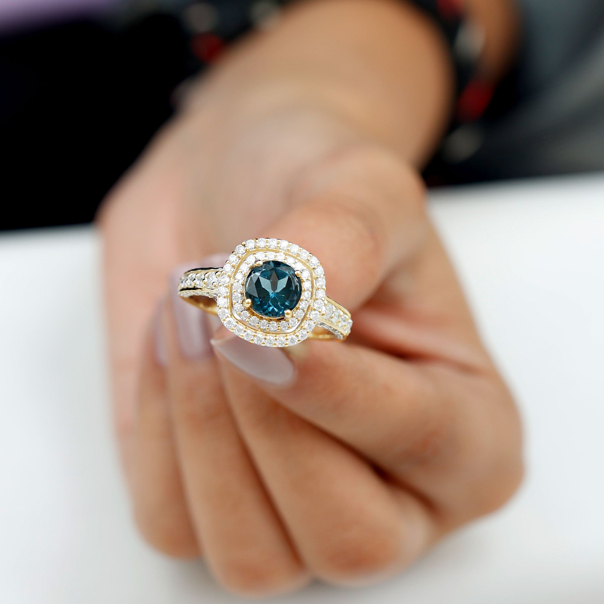 Express your affection with this remarkable Natural London Blue Topaz Ring, where vintage charm intertwines with contemporary elegance. This enchanting ring showcases a magnificent 8 mm round London Blue Topaz as the centerpiece, encircled by a dazzling double halo of radiant Moissanite, producing a captivating sparkle that will leave you in awe. This Topaz Ring for Engagement radiates modern sophistication and timeless grace. Meticulously crafted with exceptional attention to detail, this Double Halo Engagement Ring is a genuine work of art, ideal for representing your enduring love and devotion. Allow the stunning allure of this AAA Quality London Blue Topaz Ring to narrate your distinctive love story in the most magical manner. This Statement Engagement Ring represents an excellent option for an engagement or as a distinctive gift for someone who appreciates unique and elegant jewelry. Its streamlined design harmonizes boldness with sophistication, providing a piece suitable for daily wear or reserved for significant occasions. Meticulously crafted with attention to detail, this London Blue Topaz Engagement Ring merges the profound allure of onyx with the brilliant sparkle of moissanite, resulting in a look that is both memorable and rich in character. Leave a lasting impression with this refined Cocktail Ring, embodying a perfect combination of strength and beauty.