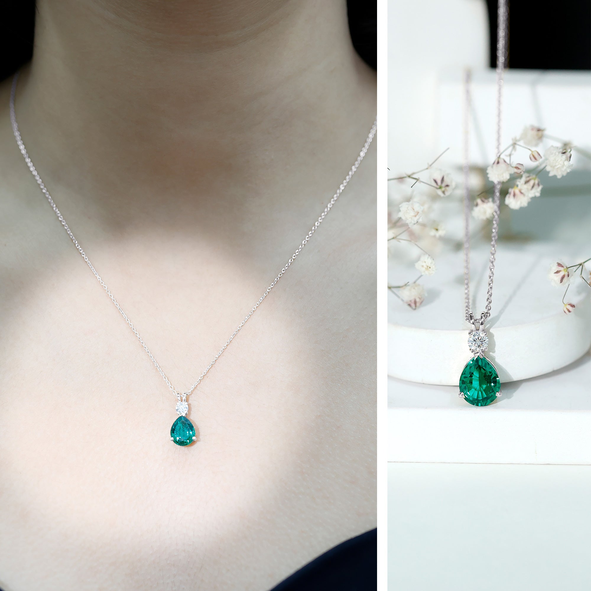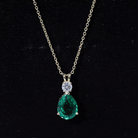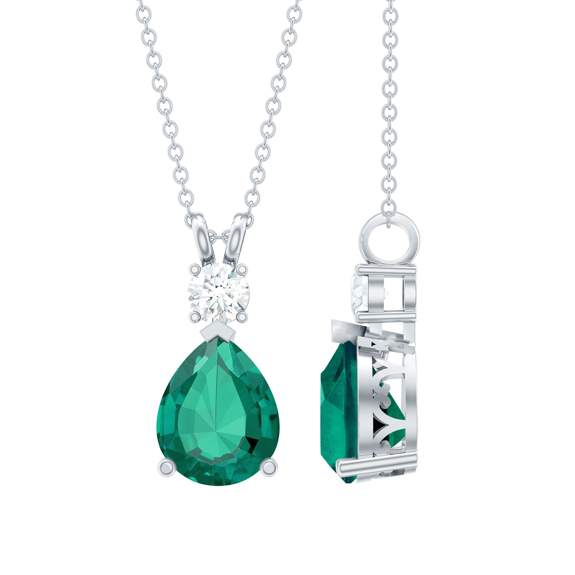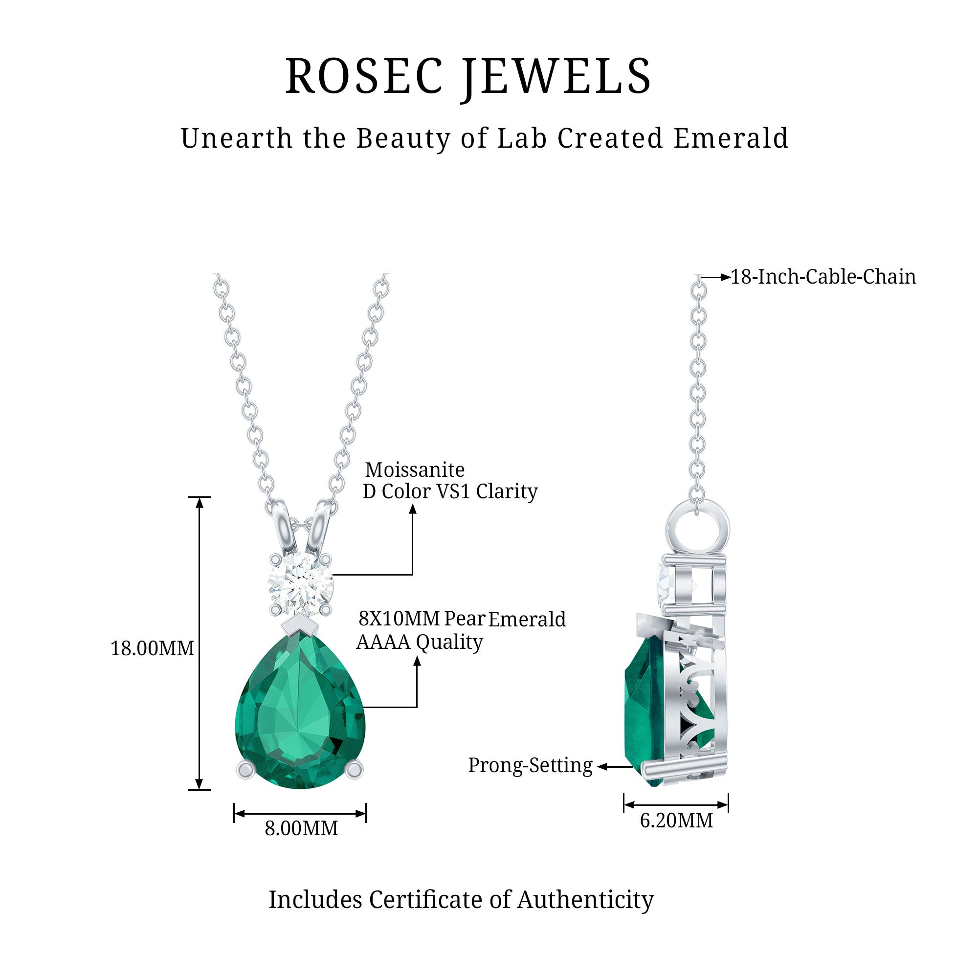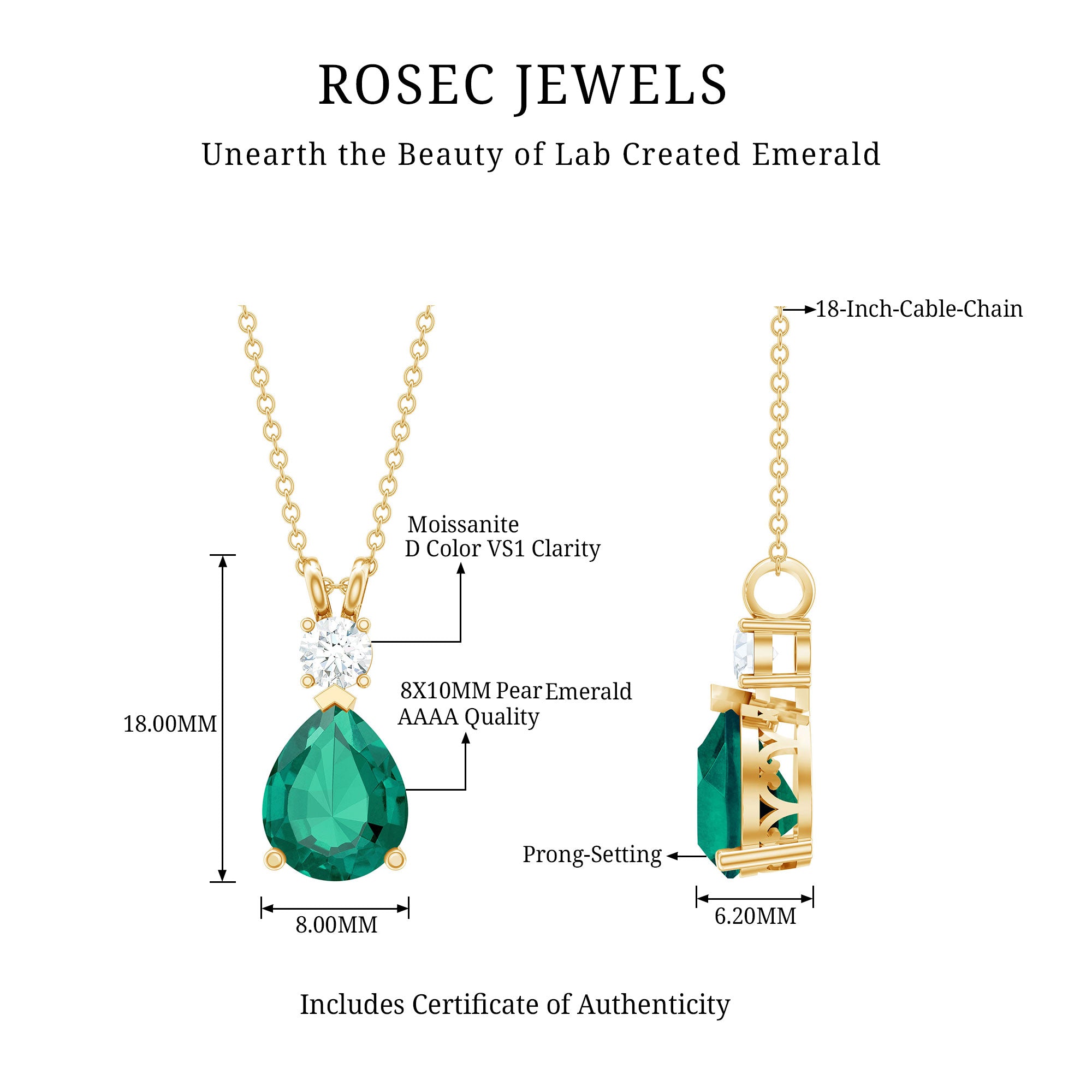 Effortlessly elegant, the Lab Gown Emerald Pendant Necklace complements both office attire and evening dates. It features an 8X10 MM Pear Shape Lab Created Emerald, securely held in Prong Setting adorned with a 4X4 MM shimmering Moissanite on top. This Pear Shaped Necklace exudes the classic shine of AAAA Quality Lab Cultured Emerald making it a perfect dazzler for any occasion. This Teardrop Pendant Necklace is classic jewelry that can be a perfect gift for your beloved for their special day.