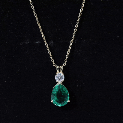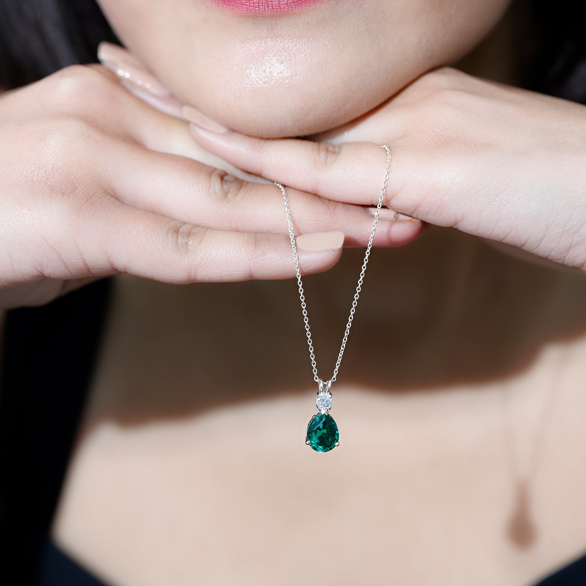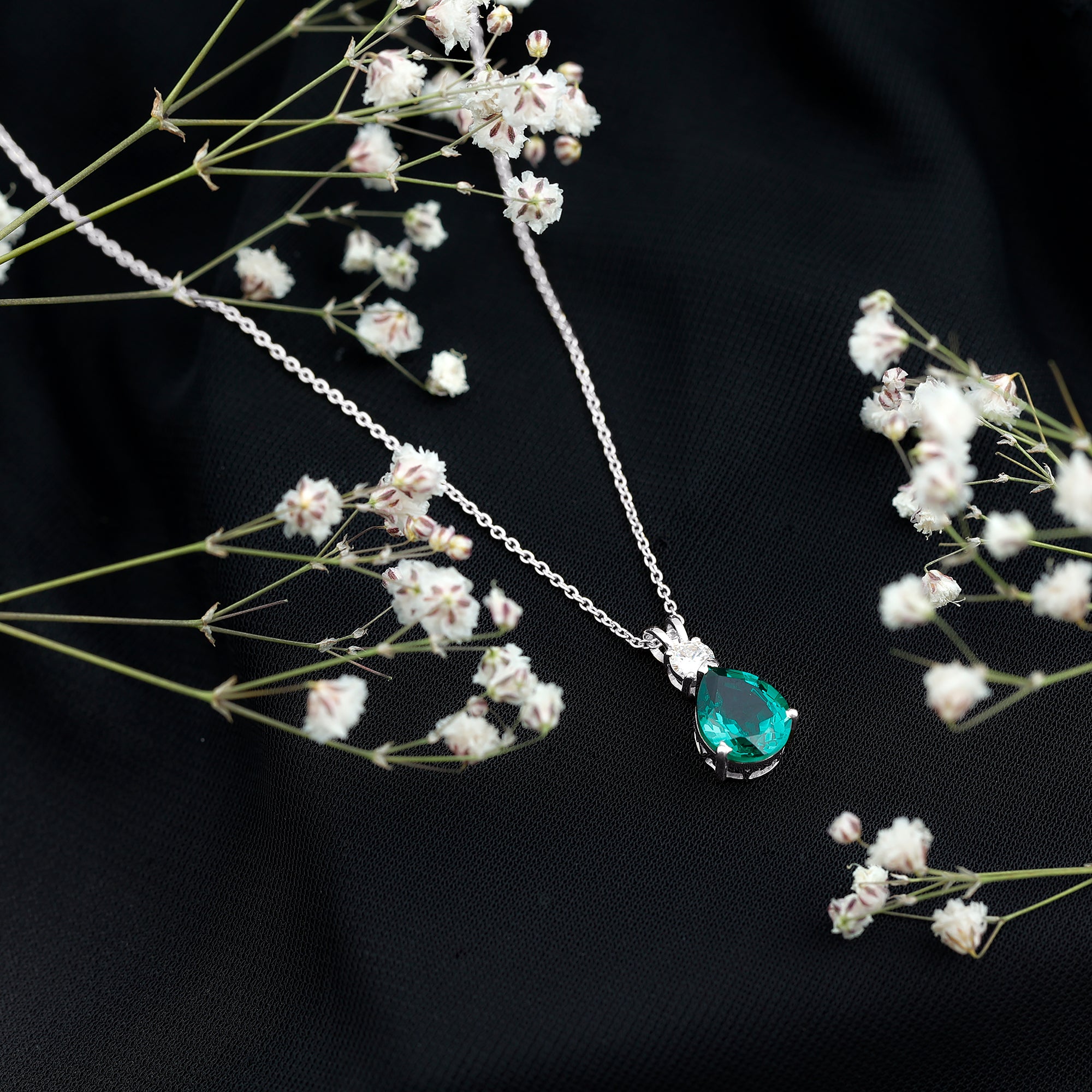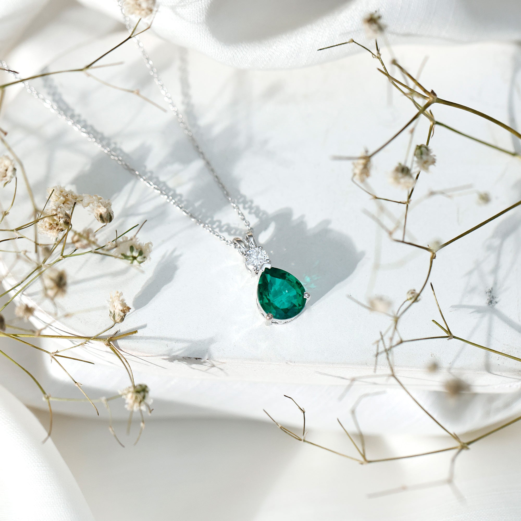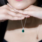 Effortlessly elegant, the Lab Gown Emerald Pendant Necklace complements both office attire and evening dates. It features an 8X10 MM Pear Shape Lab Created Emerald, securely held in Prong Setting adorned with a 4X4 MM shimmering Moissanite on top. This Pear Shaped Necklace exudes the classic shine of AAAA Quality Lab Cultured Emerald making it a perfect dazzler for any occasion. This Teardrop Pendant Necklace is classic jewelry that can be a perfect gift for your beloved for their special day.