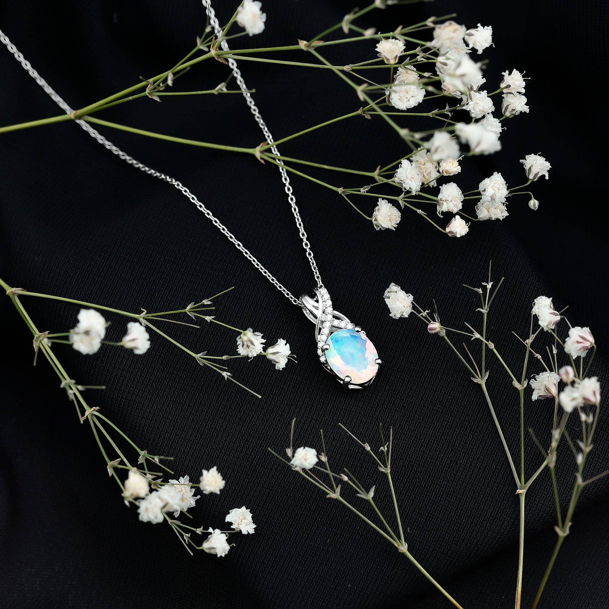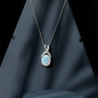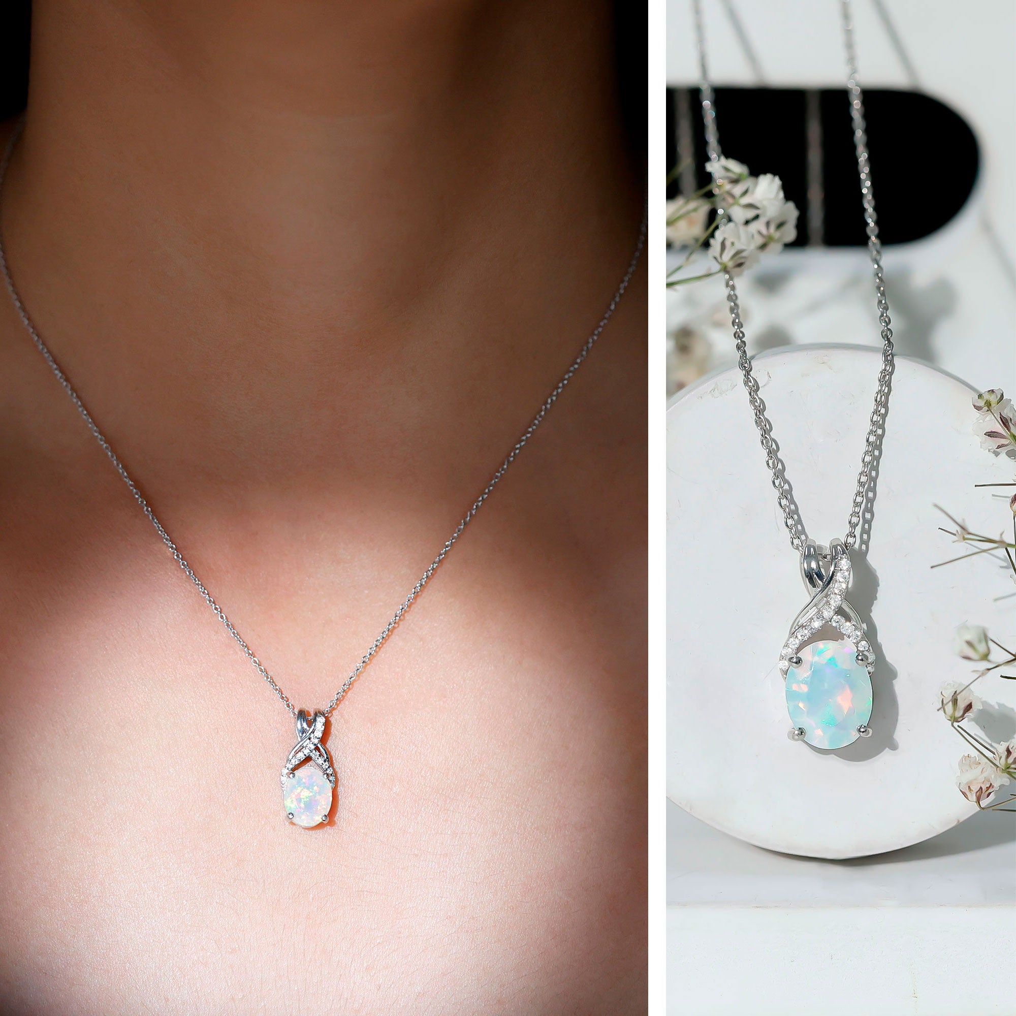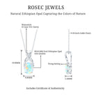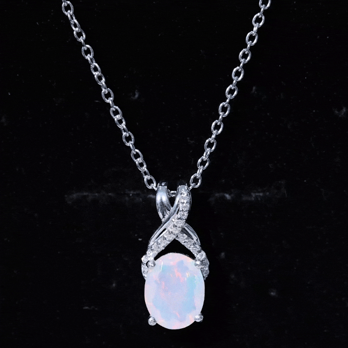 Make a statement with the vibrant hues of this Ethiopian Opal Pendant on your special day, ensuring it remains unforgettable. This stunning Solitaire Necklace showcases an 8X10 MM Oval Shaped Natural Ethiopian Opal at its center, gracefully secured in a prong setting with a distinctive X shaped bail that is partially embellished with dazzling round cut Moissanite gems. Crafted from 14K White Gold Plated Silver, this exquisite Wedding Necklace for Bride is bound to captivate and become a beloved addition to your jewelry collection. A timeless piece, this Oval Shaped Necklace serves as the ideal finishing touch for any outfit. This eye-catching Rainbow Stone Necklace is genuinely unforgettable, radiating elegance and charm. It brings a hint of glamour to your look, enhancing your style. Meticulously crafted, it embodies a timeless romance with its refined design. The AAA Quality Opal and D-VS1 Quality Moissanite shimmer beautifully from the pendant, making it a remarkable piece of jewelry.