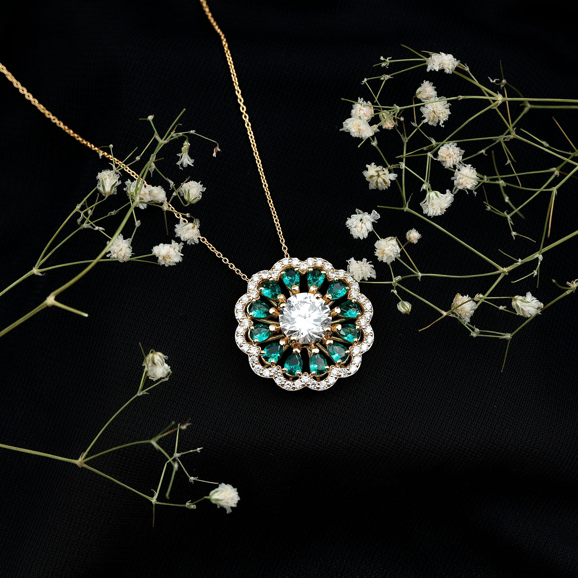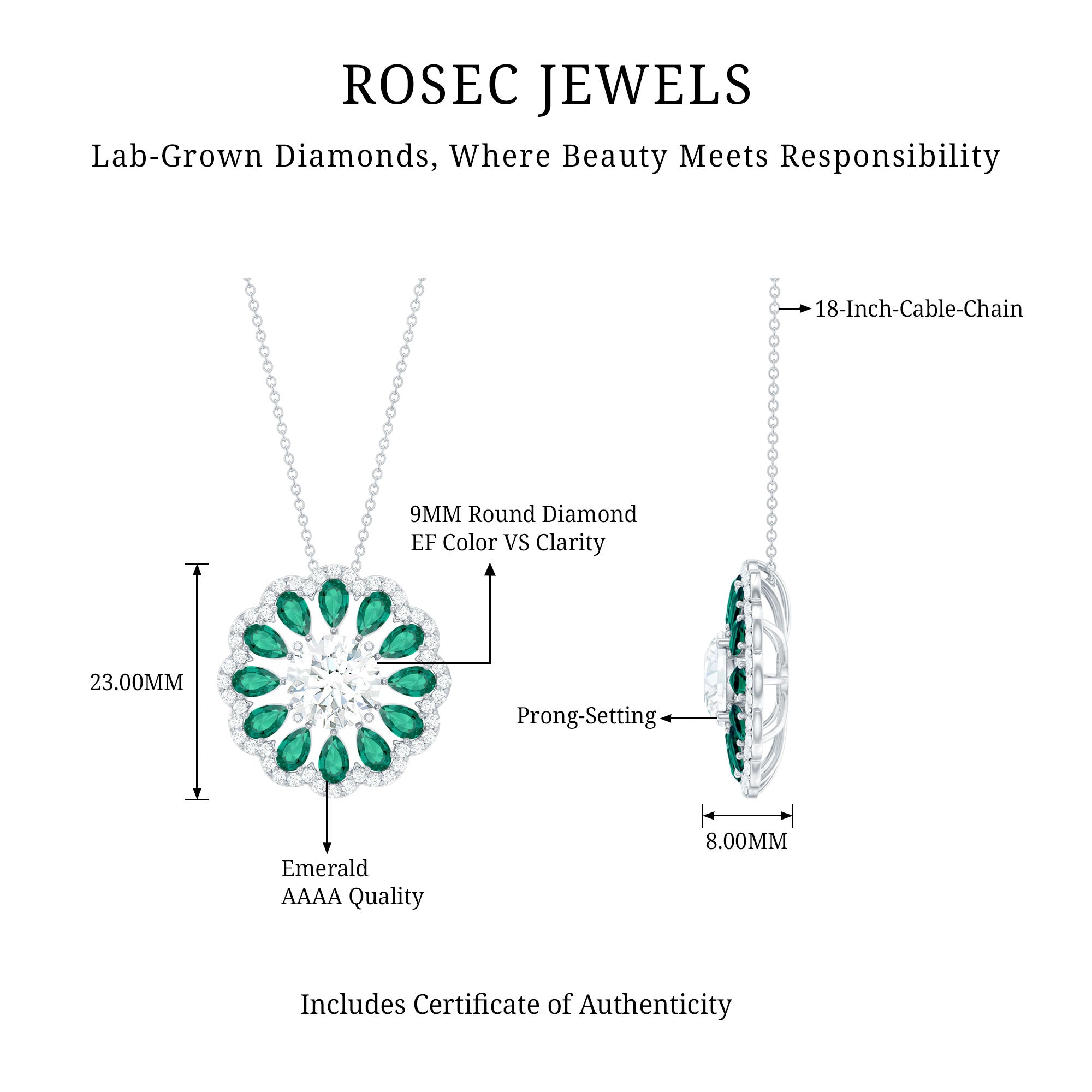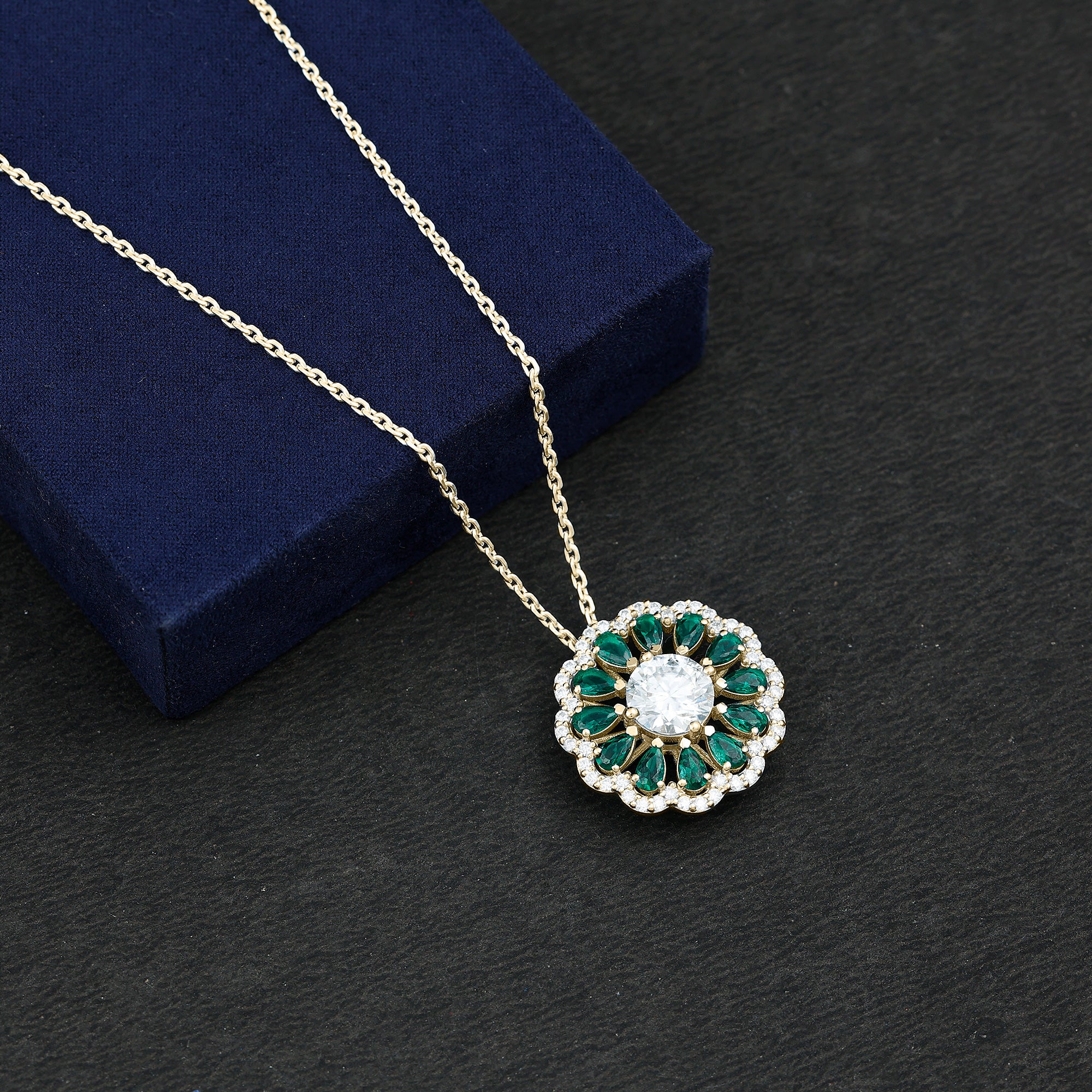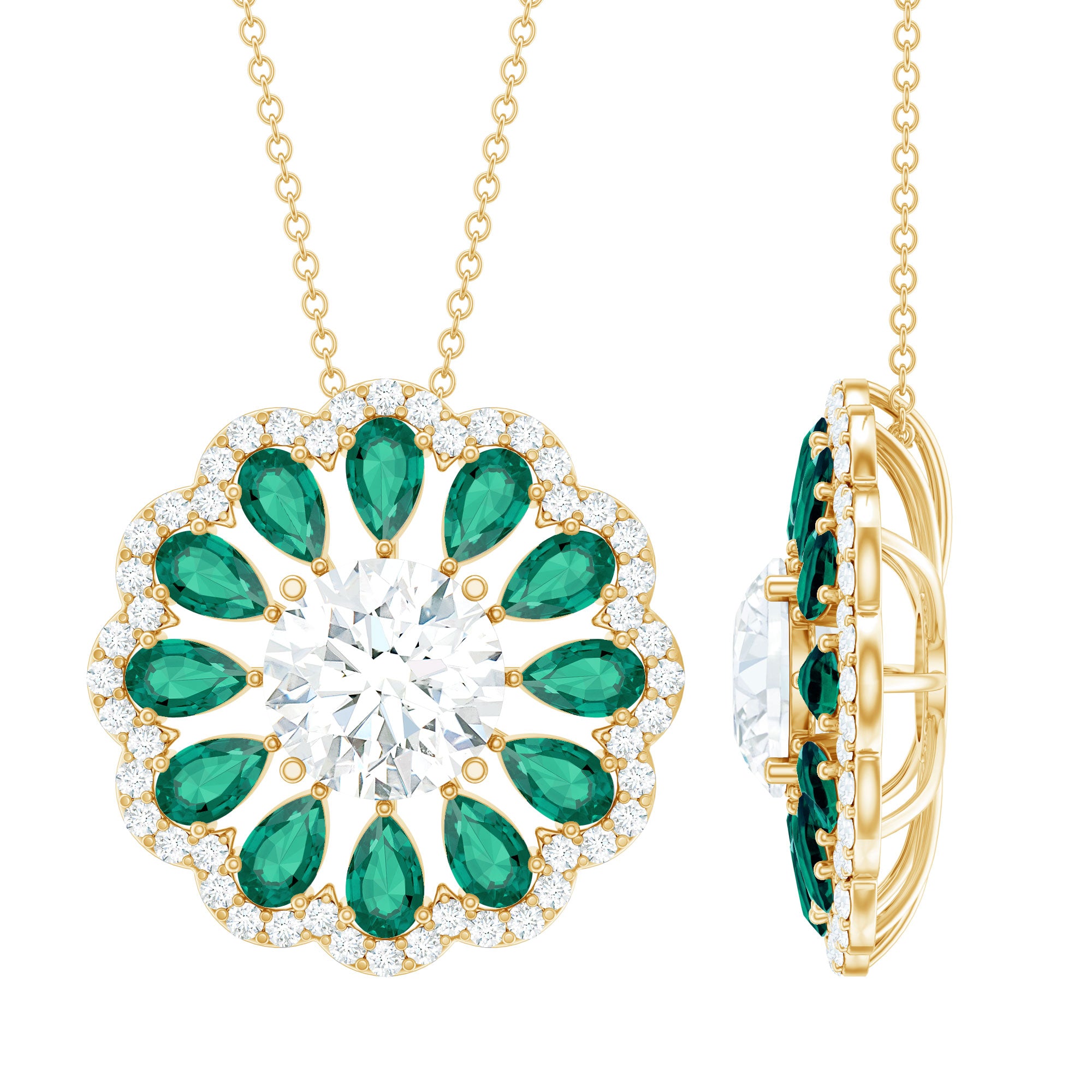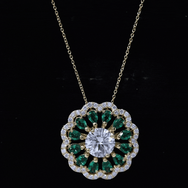 Elevate your jewelry collection with the exquisite charm of this Diamond Floral Pendant. At its heart lies a breathtaking 9 MM round cut synthetic diamond set in prong setting and graces the design with its remarkable sparkle. Encircling this central gem are pear-shaped lab-created emeralds that bring a vibrant splash of color. The Statement Pendant is beautifully framed by a diamond halo, enhancing its overall allure. This Diamond Pendant Necklace is not only fashionable but also ethically crafted. Adorn yourself with this Halo Pendant to enhance your outfit and express your refined taste.