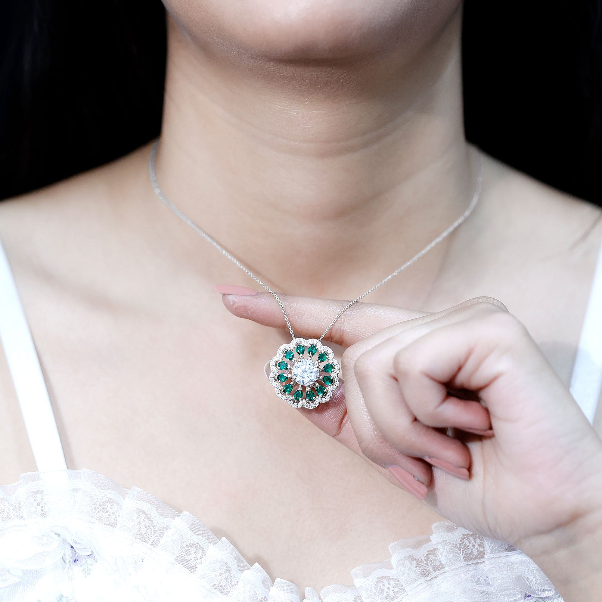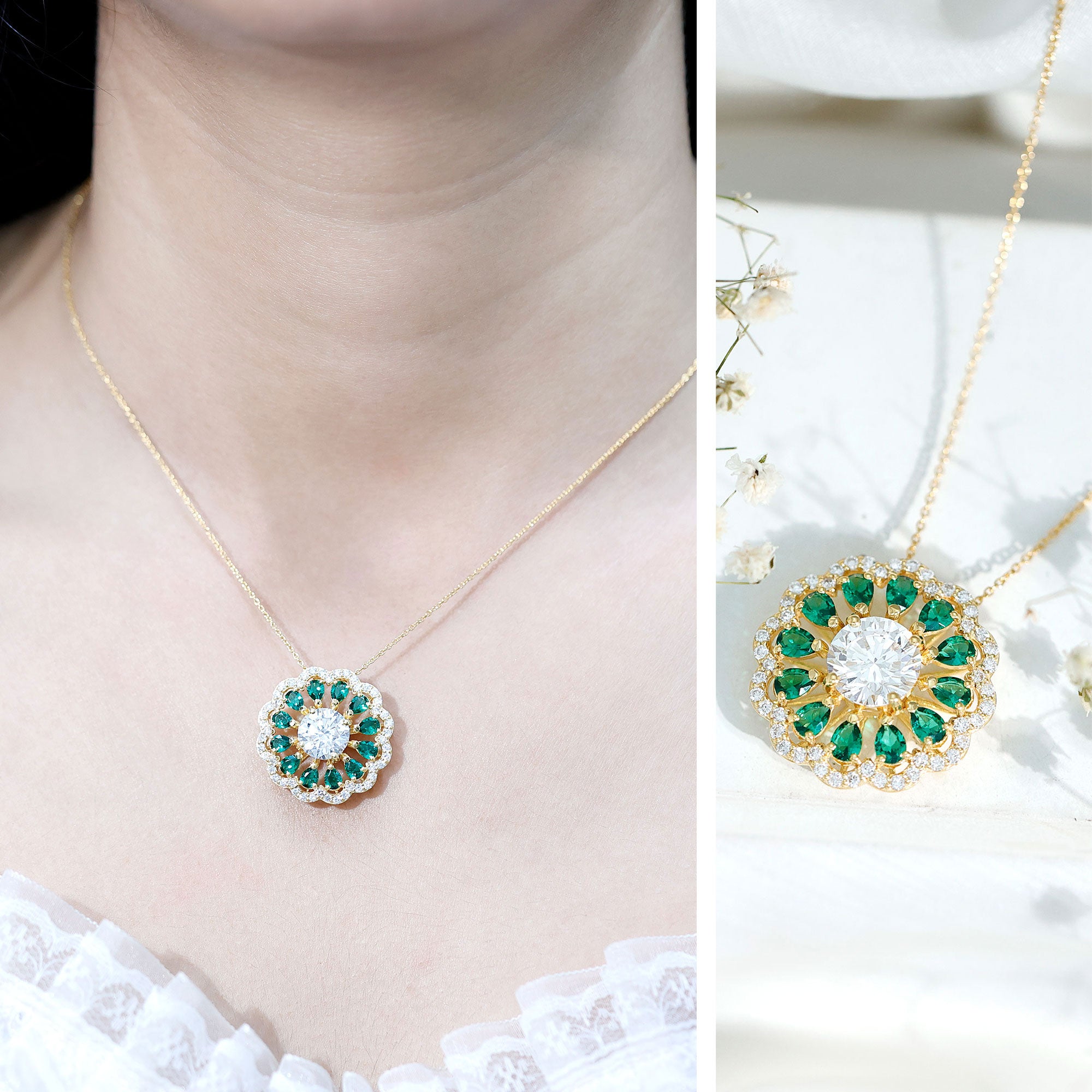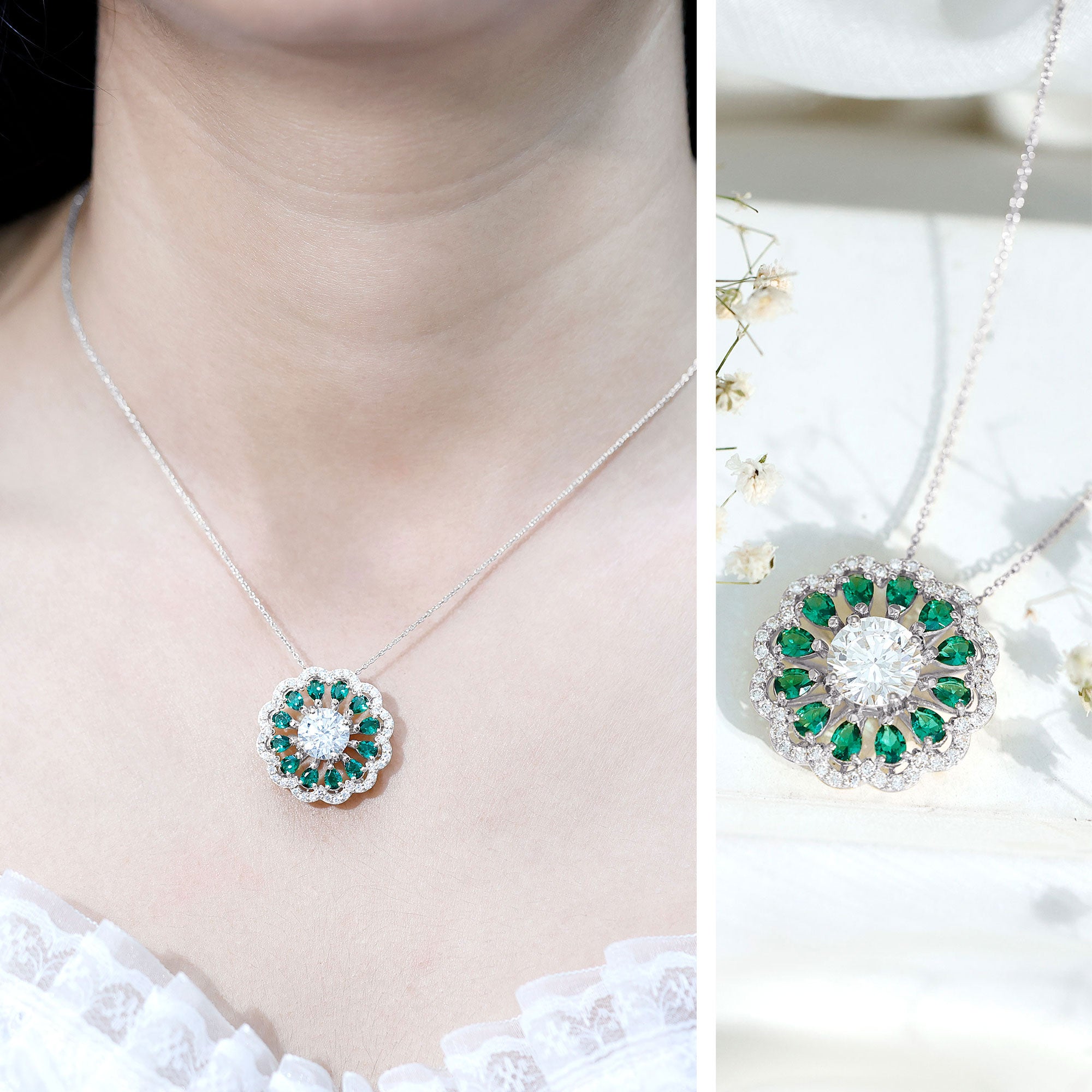 9 MM Lab Grown Diamond Flower Bridal Necklace With Emerald