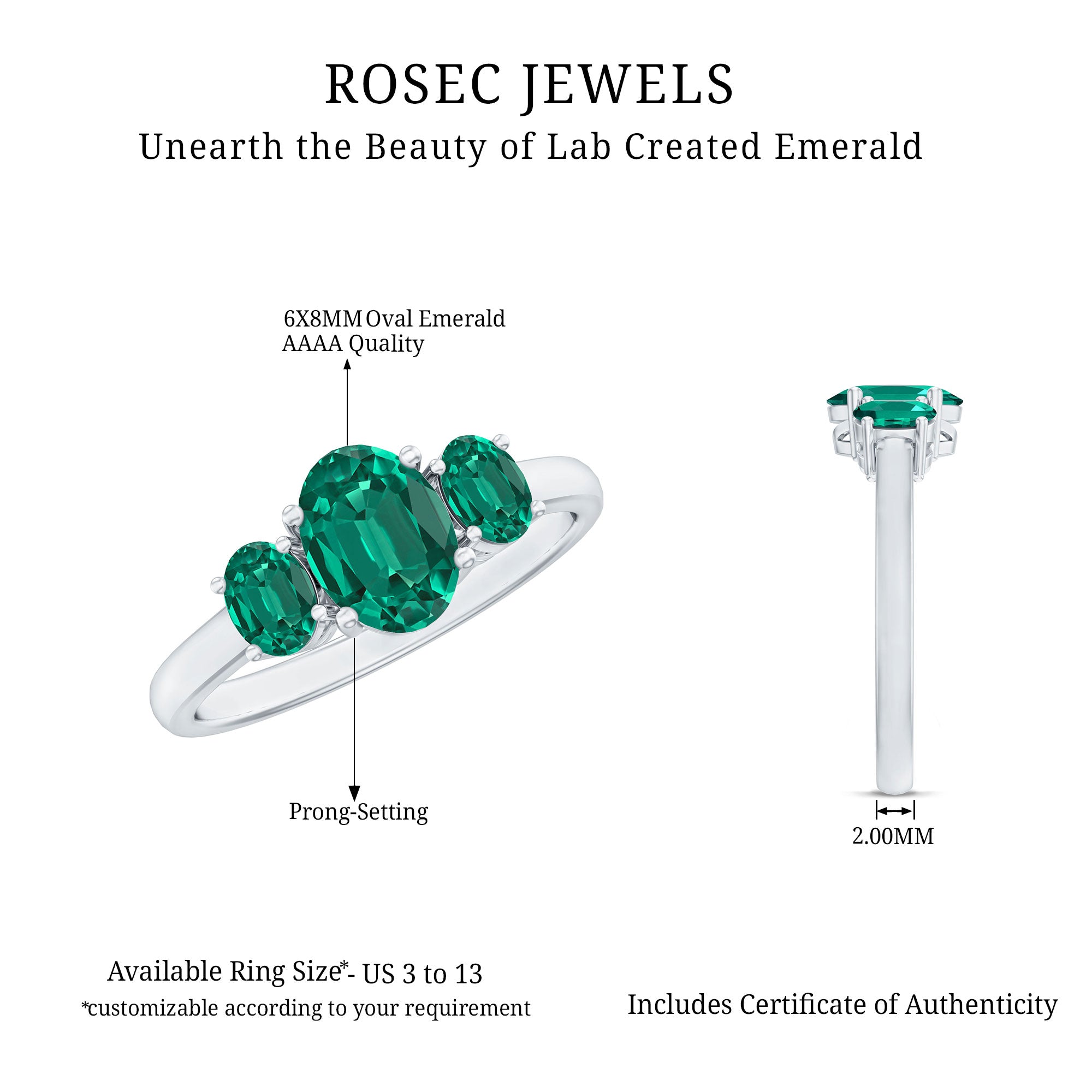 This three-stone ring symbolizes the unwavering strength of your bond across the past, present, and future, making it an ideal choice. Beautifully adorned with three oval-shaped lab-created emerald stones set in a prong setting, it enhances the rings beauty. Rosec Jewels offers a stunning Lab Created Emerald Ring, carefully handcrafted to embody love and significance. This thoughtful detail transforms the Trilogy Ring into more than merely a piece of jewelry; it evolves into a treasured keepsake that narrates your love story. Whether you are commemorating a significant milestone or conveying your heartfelt commitment, this Past Present and Future Ring serves as a perfect memento that she will cherish forever. Designed to encapsulate the journey of your relationship, this 3 Stone Ring harmoniously combines modern aesthetics with timeless sophistication. Featuring AAAA Quality stones, this Oval Engagement Ring for Women exudes exceptional fire and brilliance, establishing it as a true emblem of enduring love and connection.