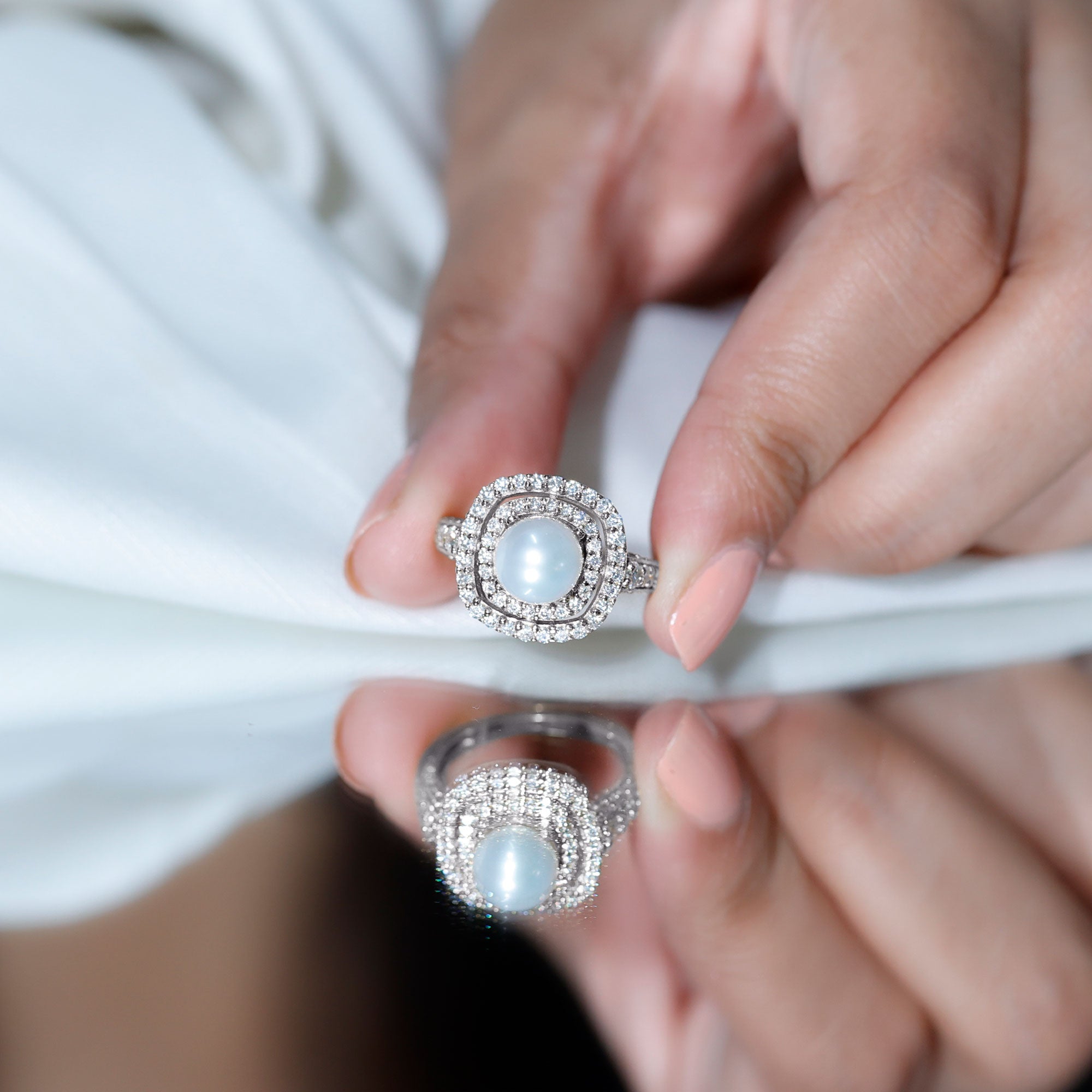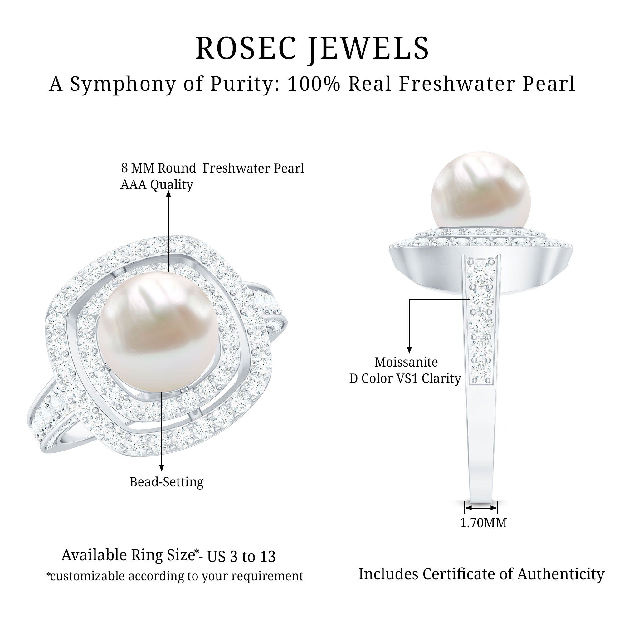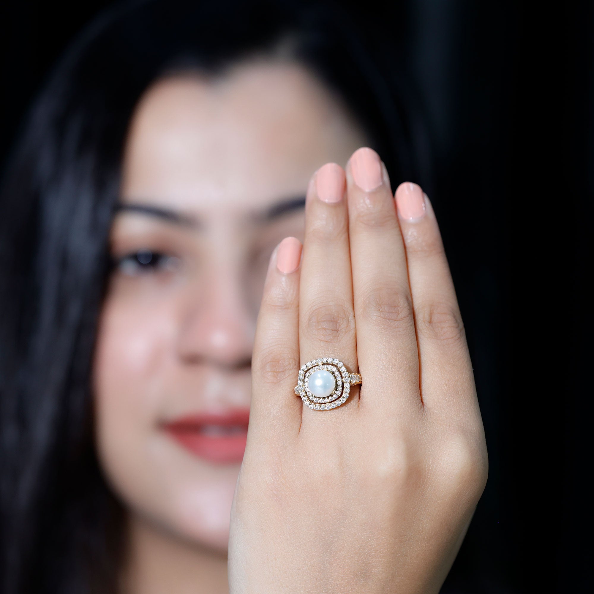Amazing Freshwater Pearl Solitaire Engagement Ring and Moissanite Double Halo