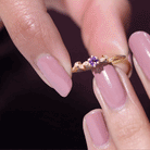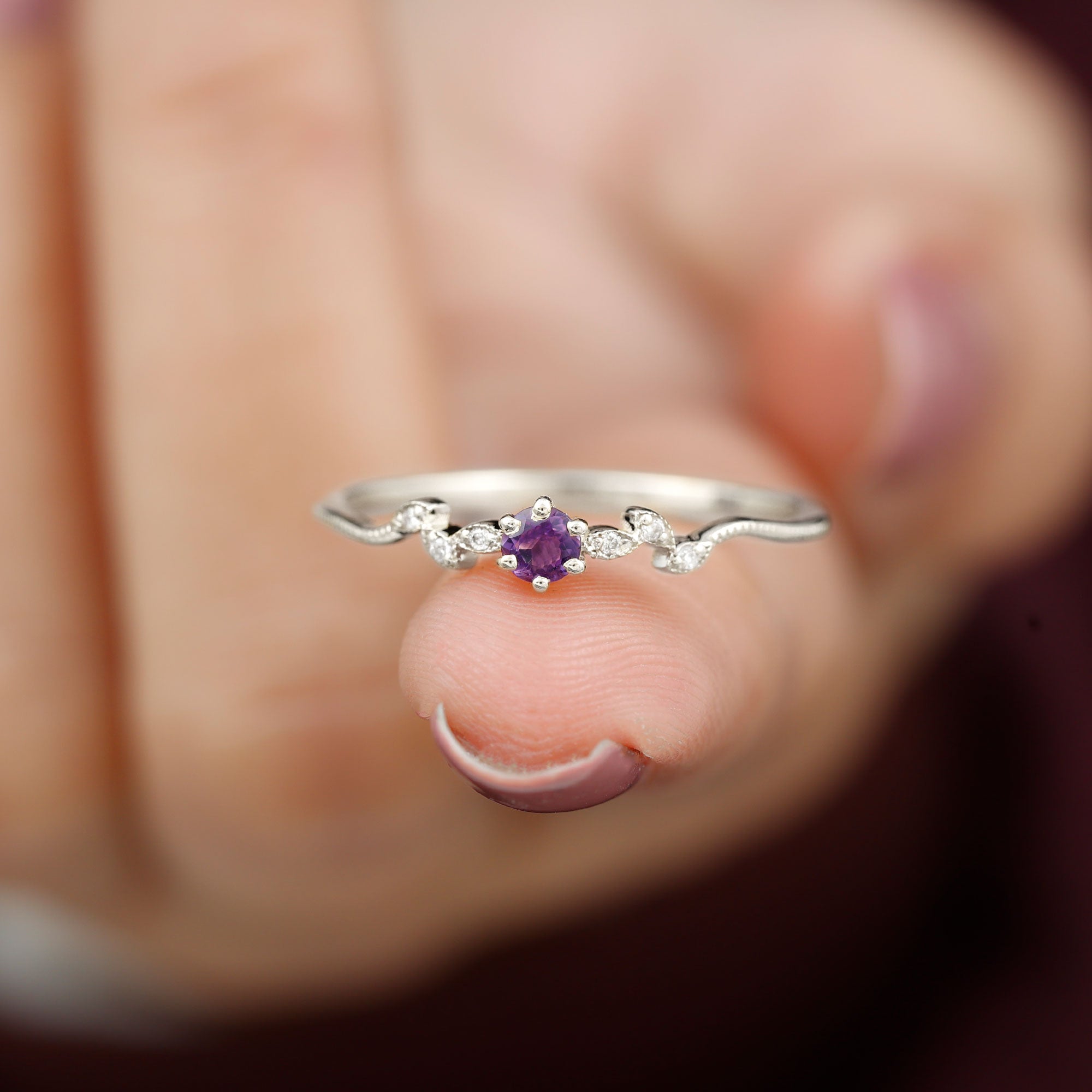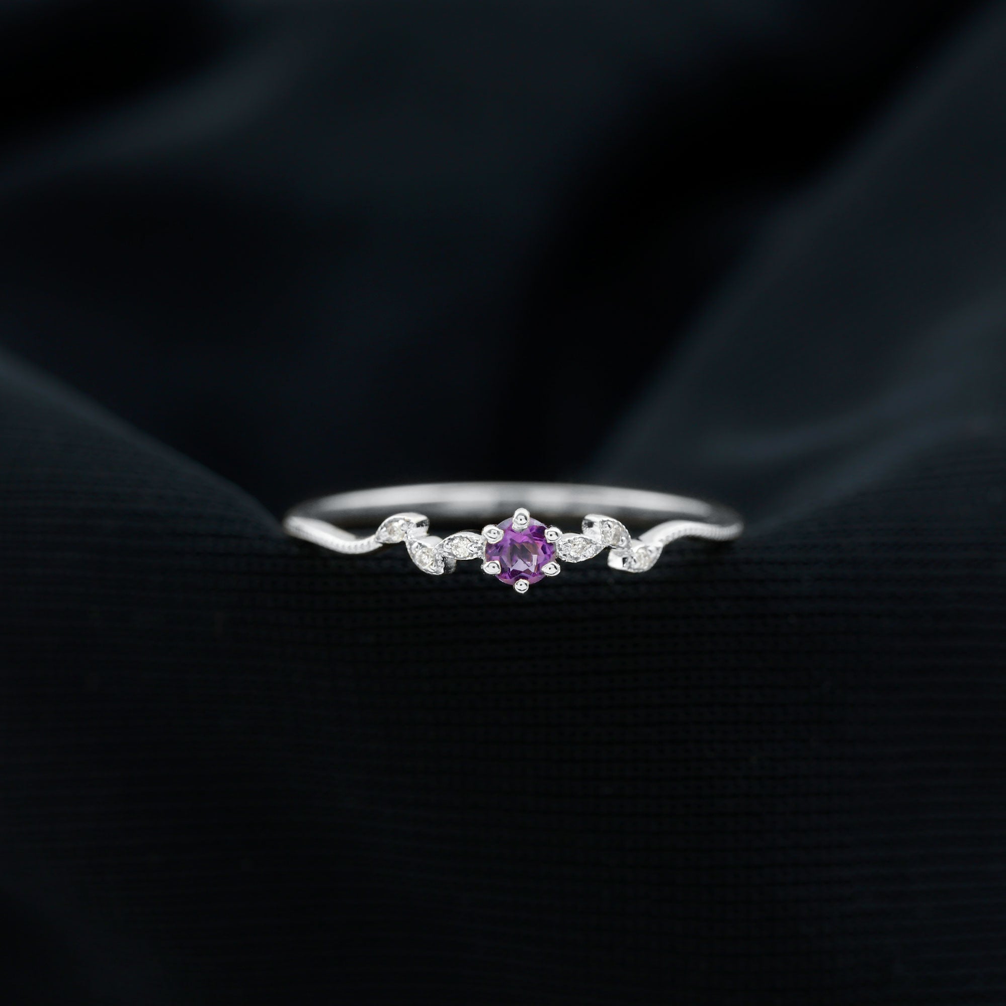 Amethyst and Diamond Leaf Promise Ring with Beaded Detailing