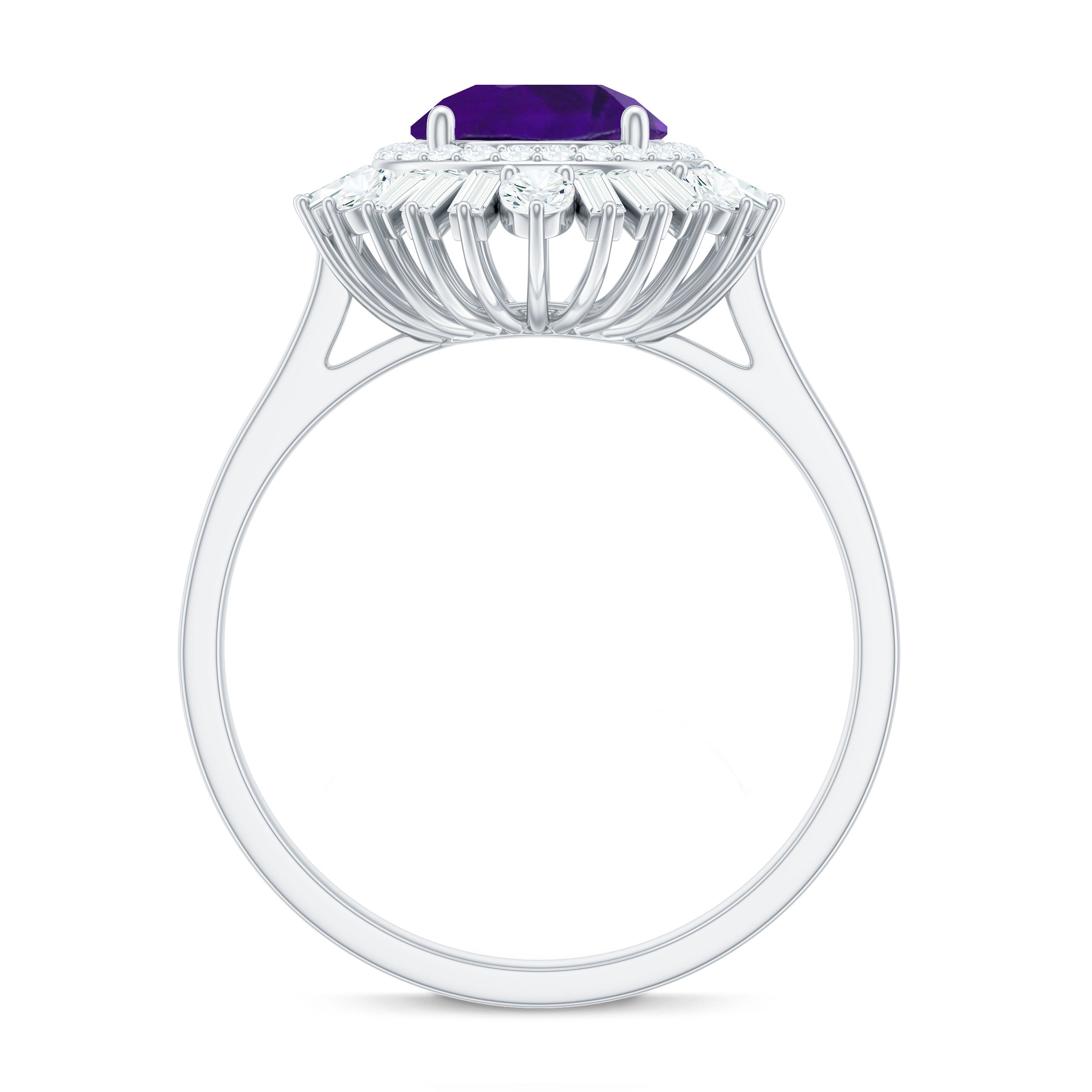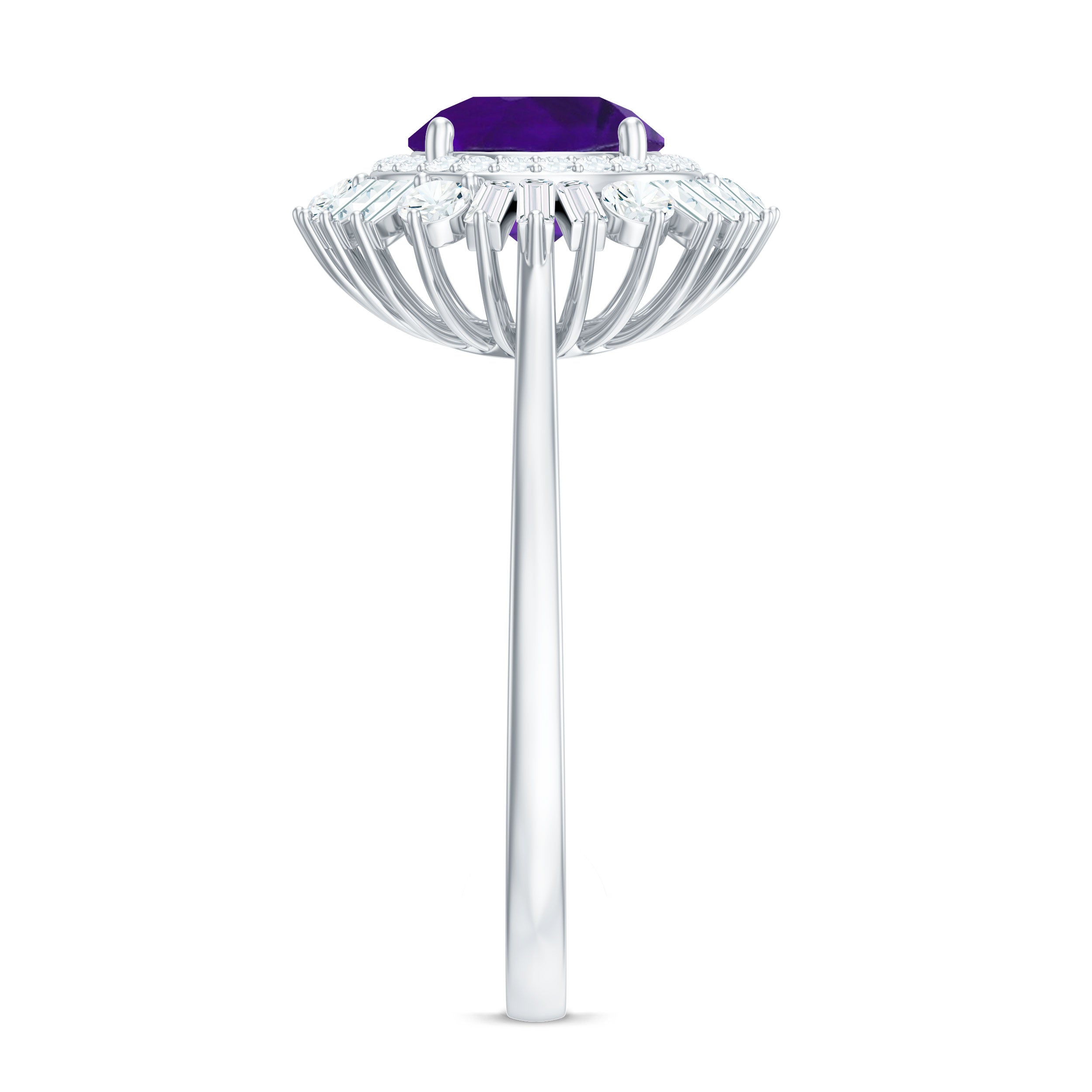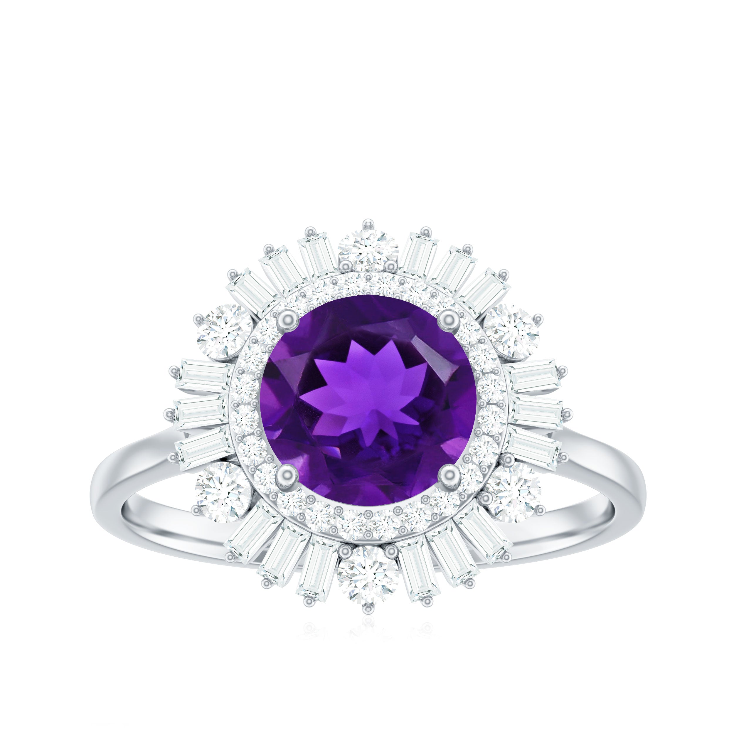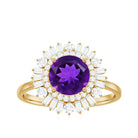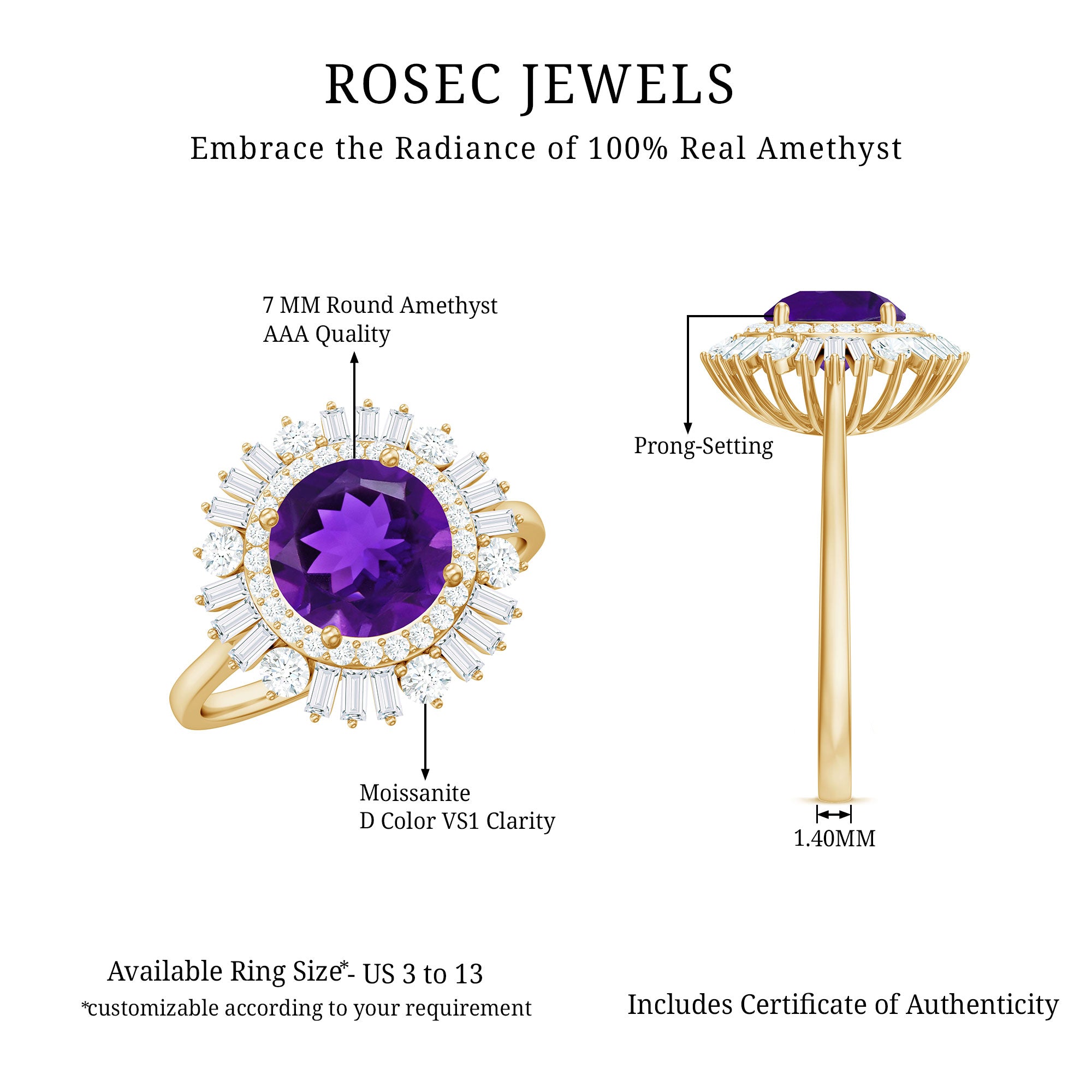 This Double Halo Engagement Ring is perfect as proposal ring. It is crafted in Solid Gold and adorned with a sparkling 7 MM Round Shape Amethyst in claw setting encircled beautifully with Round and Baguette Cut Moissanite studded as Double Halo. Amethyst Engagement Ring will be a unique choice for your partner.