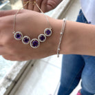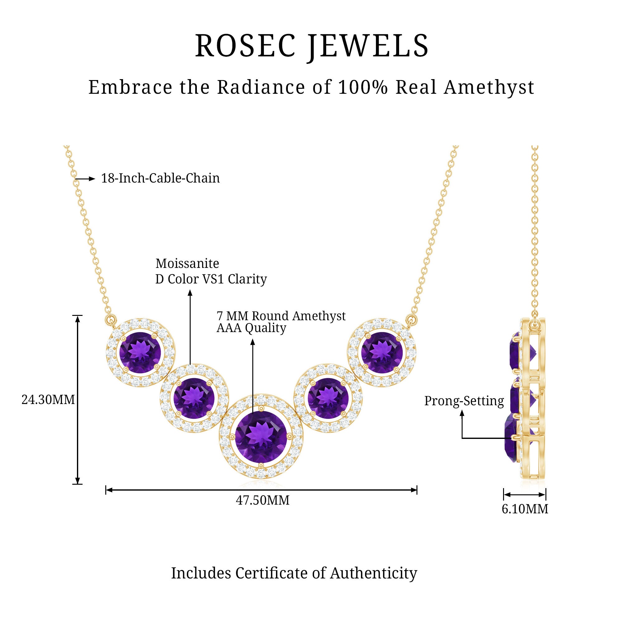 Amethyst- Brilliant Cut Amethyst Gemstone exhibits AAA Quality and possess vibrant color. Semi-Precious February Birthstone brings power, protection, and calmness. It is Natural and Certified, helps in combating negativity due to stress. Its Durability and Luster is enhanced by Heat Treatment, to further make it a captivating and desirable gem. Moissanite- D-VS1 Quality exhibited by Brilliant Cut Moissanite give justice to its incredible value. Moissanite summons beauty, attractiveness and unbreakable love. It is Certified and helps in bringing success and luxury to the wearer. Its Durability and Luster is enhanced by Lab Created Treatment, to further make it a captivating and desirable gem.