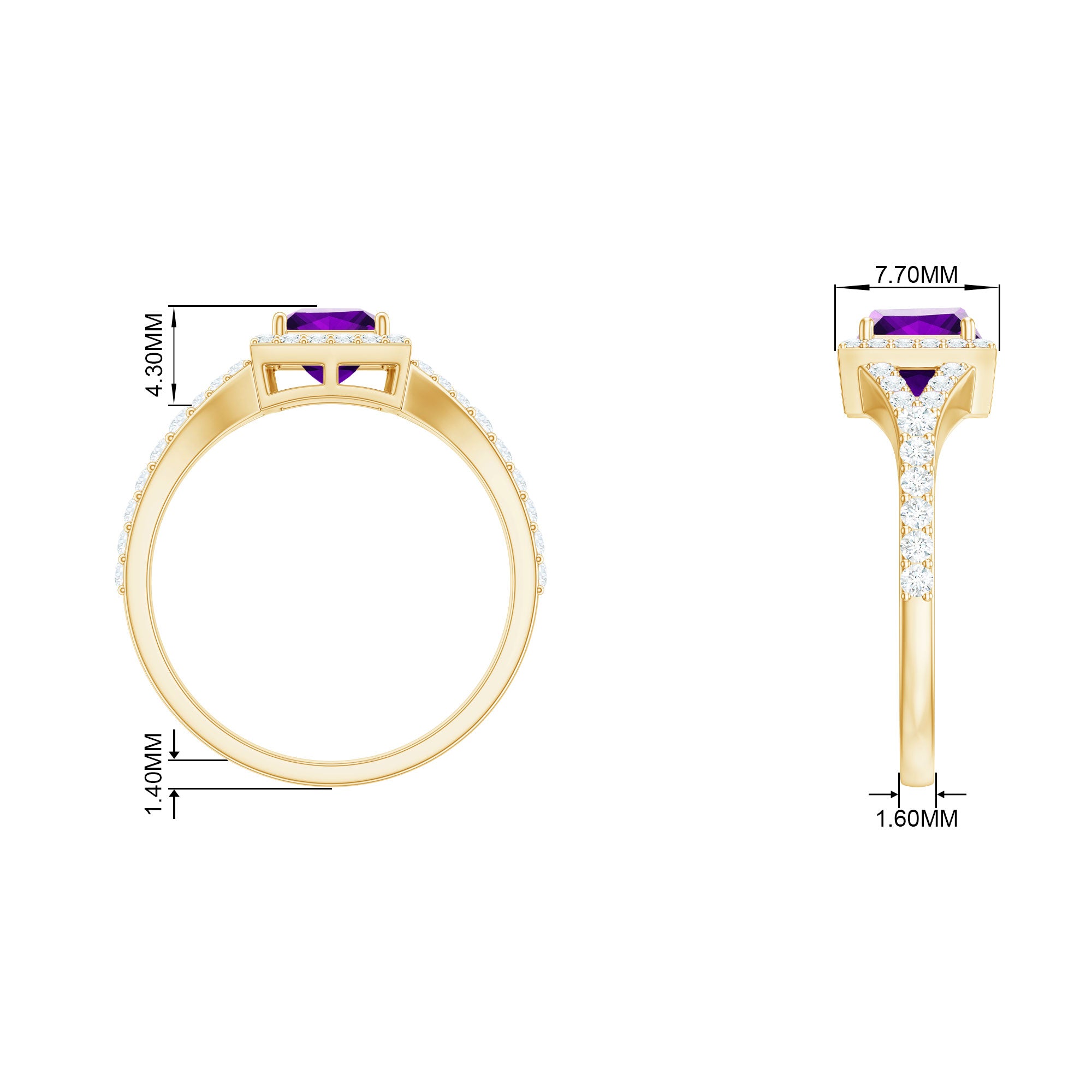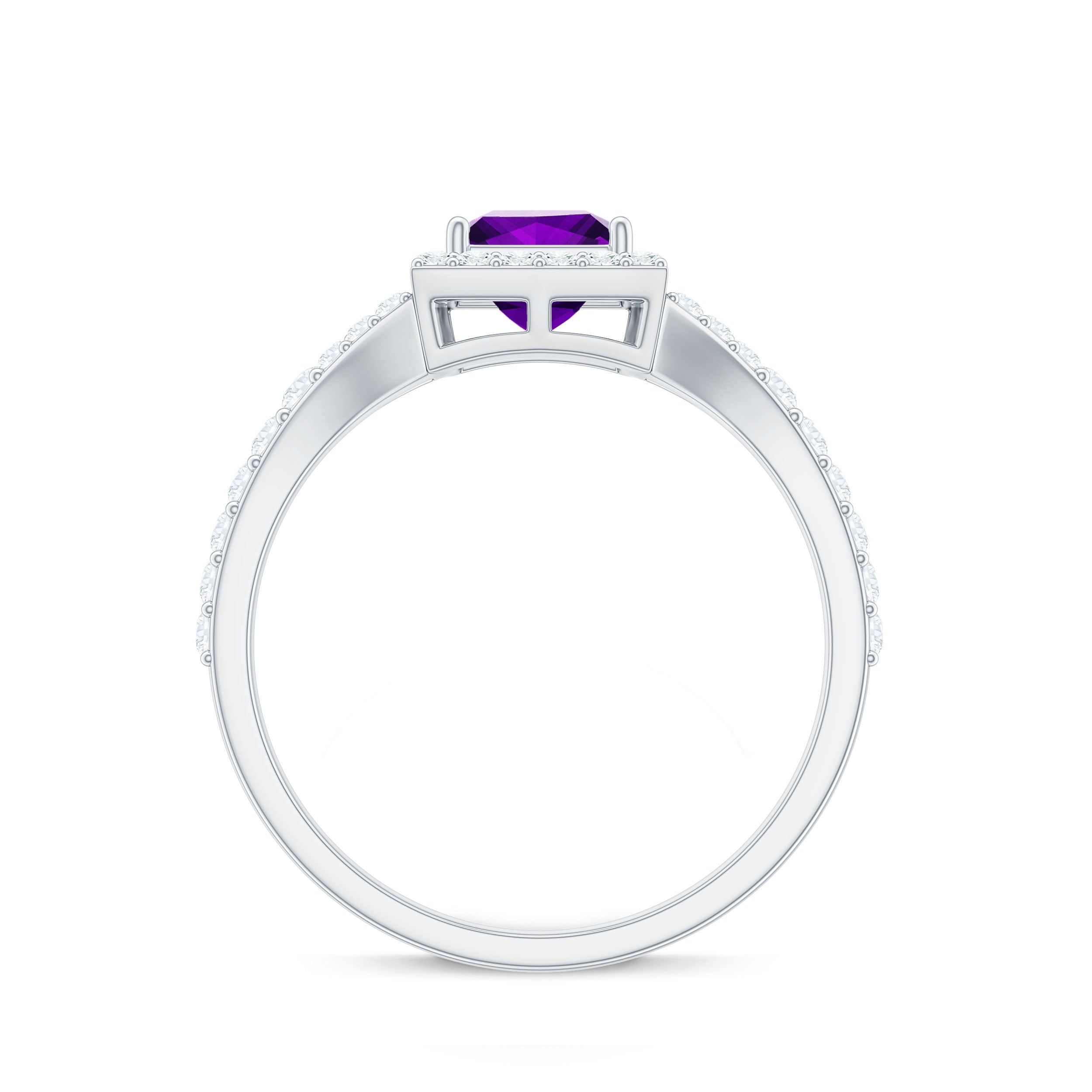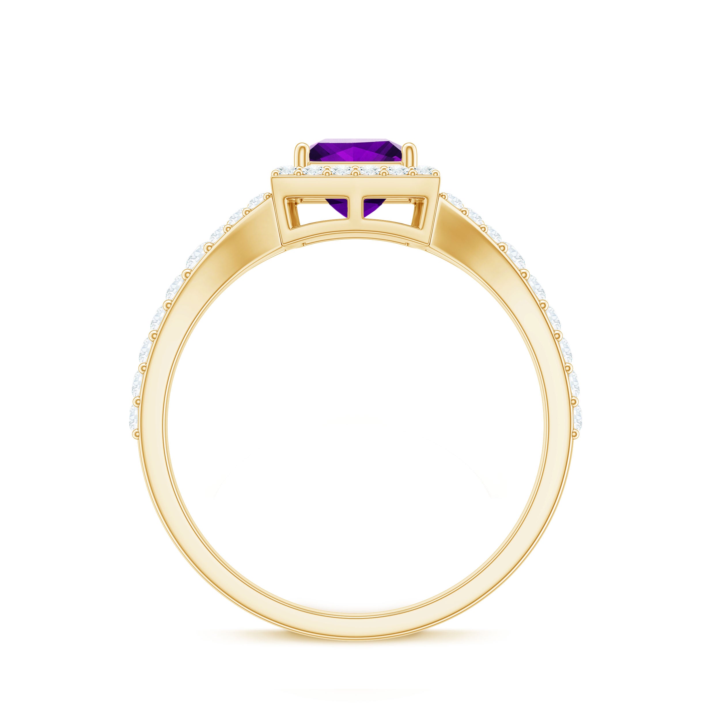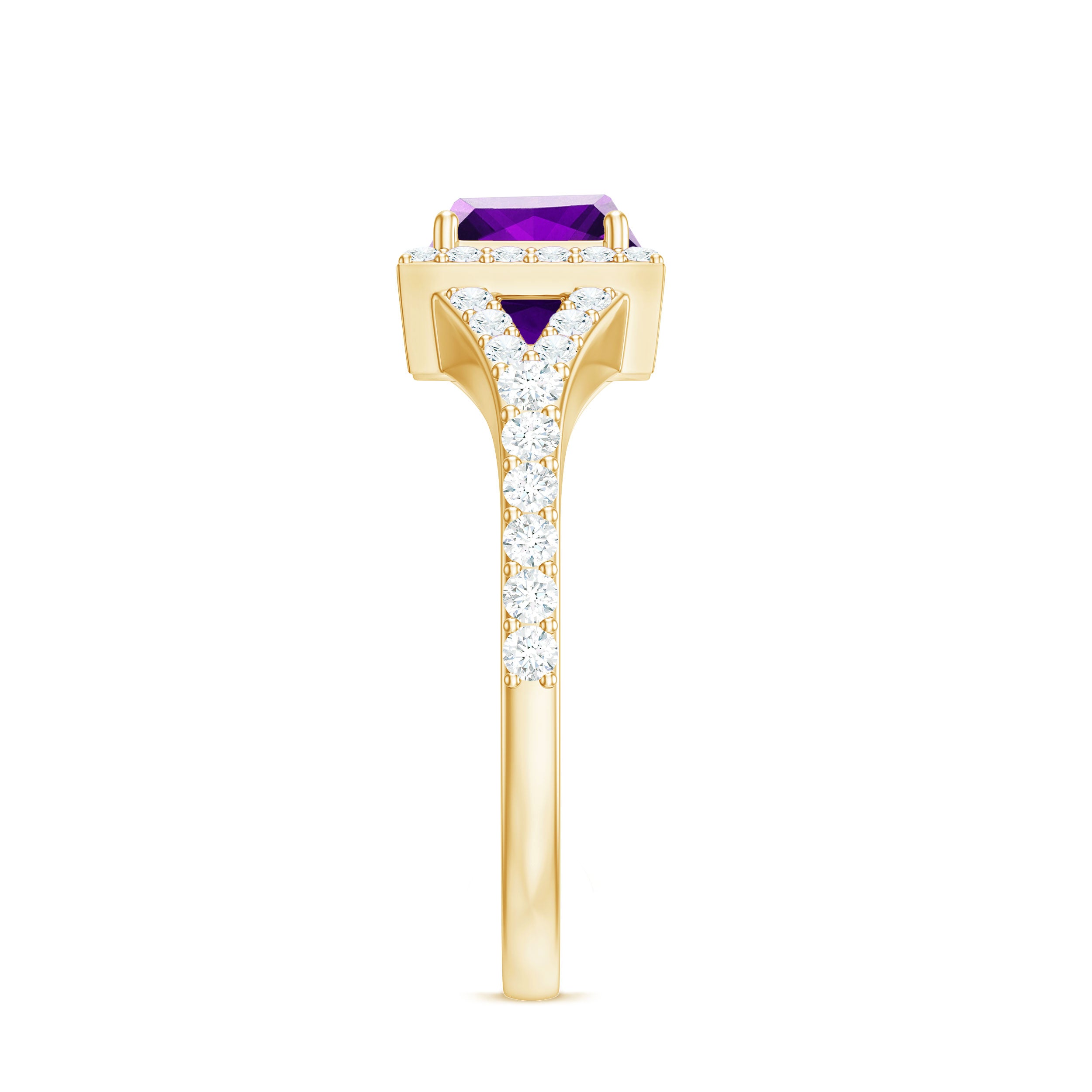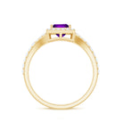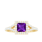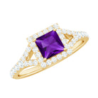 Express your devotion to her with a Split Shank Halo Engagement Ring. This Gold Engagement Ring is embellished with Princess Cut Amethyst in the center in a prong setting. Round Moissanite is set in a Halo and side stone setting over the split shank.